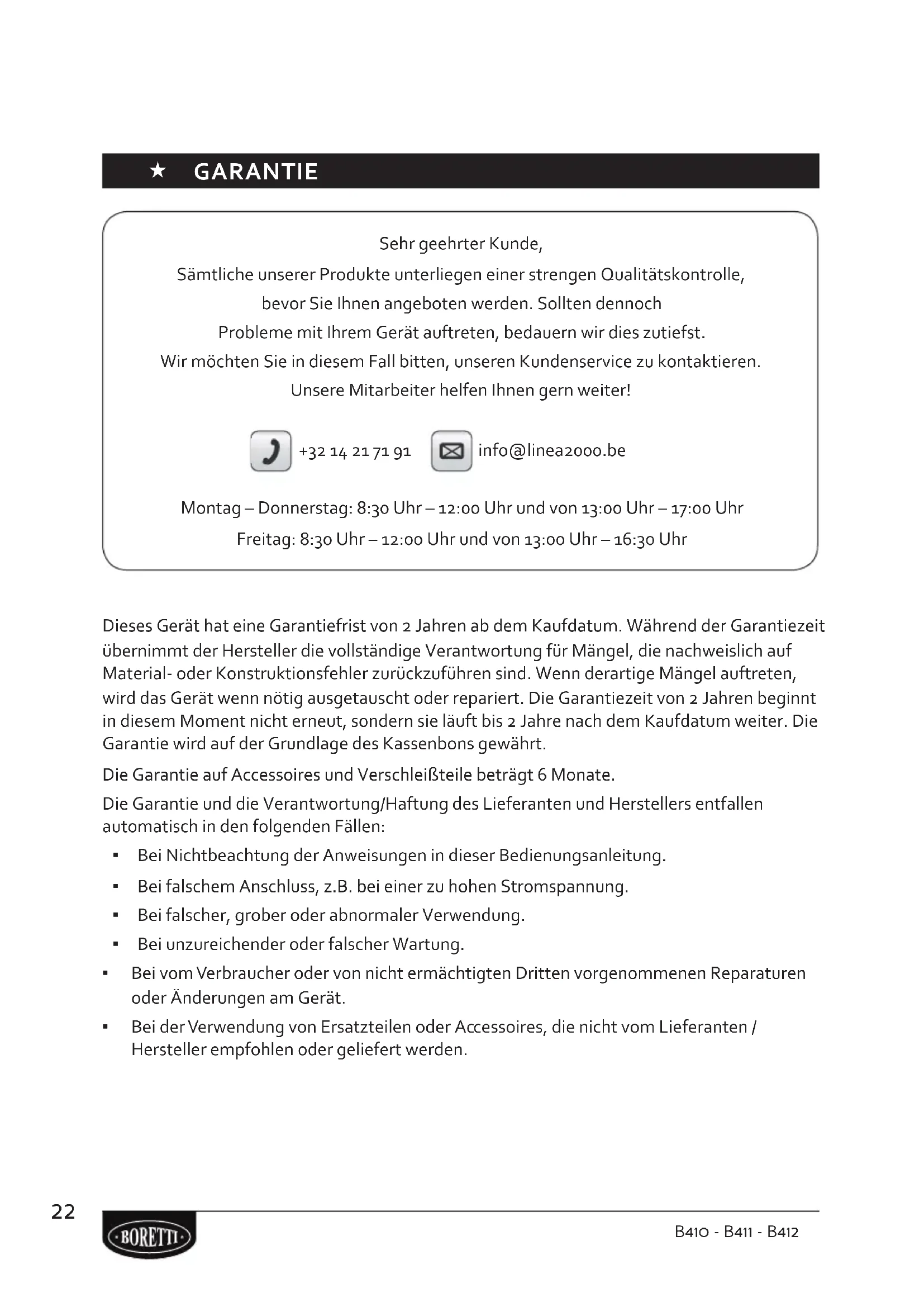 Ce symbole sur le produit ou son emballage indique que ce produit ne peut être traité comme déchet ménager. Il doit plutôt être remis au point de ramassage concerné, se chargeant du recyclage du matériel électrique et électronique. En vous assurant que ce produit est éliminé correctement, vous favorisez la prévention des conséquences négatives pour l’environnement et la santé humaine qui, sinon, seraient le résulat d’un traitement inapproprié des déchets de ce produit. Pour obtenir plus de détails sur le recyclage de ce produit, veuillez prendre contact avec le bureau municipal de votre région, votre service d’éliminiation des déchets ménagers ou le magasin où vous avez acheté le produit. L’emballage est recyclable. Traitez l’emballage écologiquement.22 B410 - B411 - B412 Bernini www.boretti.com Gebruiksaanwijzing NL Mode d’emploi FR De Dollard 17, 1454 AT Watergang T + 31 (0) 20 - 436 34 39, F +31 (0) 20 - 436 13 26 W www.boretti.com E info@boretti.com T +32 (0)3 450 81 80, F +32 (0)3 458 68 47W www.boretti.beE info@boretti.be Boretti - The Netherlands Boretti - Belgium www.boretti.com BORETTI0086 Cover Gebruiksaanwijzingen_v4.indd 3-4 06-11-15 16:33 « GARANTIE Sehr geehrter Kunde, Sämtliche unserer Produkte unterliegen einer strengen Qualitätskontrolle, bevor Sie Ihnen angeboten werden. Sollten dennoch Probleme mit Ihrem Gerät auftreten, bedauern wir dies zutiefst. Wir möchten Sie in diesem Fall bitten, unseren Kundenservice zu kontaktieren. Unsere Mitarbeiter helfen Ihnen gern weiter! +32 14 21 71 91 info@linea2000.be Montag – Donnerstag: 8:30 Uhr – 12:00 Uhr und von 13:00 Uhr – 17:00 Uhr Freitag: 8:30 Uhr – 12:00 Uhr und von 13:00 Uhr – 16:30 Uhr Dieses Gerät hat eine Garantiefrist von 2 Jahren ab dem Kaufdatum. Während der Garantiezeit übernimmt der Hersteller die vollständige Verantwortung für Mängel, die nachweislich auf Material- oder Konstruktionsfehler zurückzuführen sind. Wenn derartige Mängel auftreten, wird das Gerät wenn nötig ausgetauscht oder repariert. Die Garantiezeit von 2 Jahren beginnt in diesem Moment nicht erneut, sondern sie läuft bis 2 Jahre nach dem Kaufdatum weiter. Die Garantie wird auf der Grundlage des Kassenbons gewährt. Die Garantie auf Accessoires und Verschleißteile beträgt 6 Monate. Die Garantie und die Verantwortung/Haftung des Lieferanten und Herstellers entfallen automatisch in den folgenden Fällen: