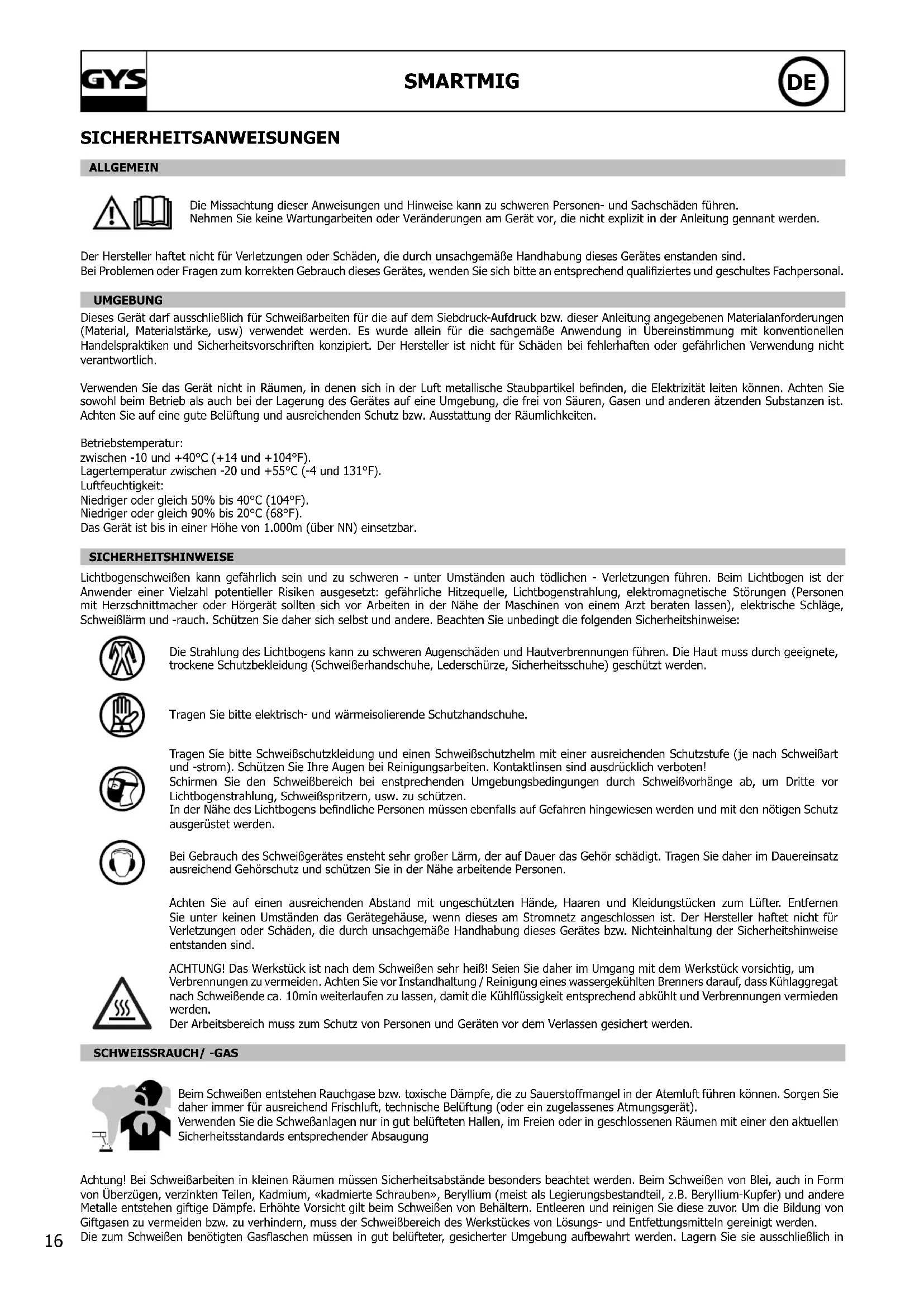 symptoms possible causes remedies The welding wire speed is not constant. Debris is blocking up the opening. Clean out the contact batch or change it and replace the anti-adherence product. Ref.041806 The wire skids in the rollers. Control the roller pressure or replace it. Wire diameter non-compatible with roller Covering wire guide in the torch non-compatible. The wire-feeder motor doesn’t operate. Reel or roller brake too tight. Release the brake and rollers. Electrical supply problem. Check that the power switch is in the "On" position. Bad wire feeding. Covering wire guide dirty or damaged. Clean or replace. Reel brake too tight Release the brake. No welding current. Bad connection to the main supply. Check the mains connection and look if the plug is fed by 400 V (3PH) power socket. Bad earth connection. Check the earth cable (connection and clamp condition). Torch trigger inoperative. Check the torch trigger / replace torch. The wire jams (after the rollers). Guide wire sheath crushed. Check the sheath and torch body. Wire jammed in the torch Clean or replace. No capillary tube. Check the presence of capillary tube. Wire speed too fast Reduce the wire speed. The welding bead is porous. The gas ow rate is not sufcient. Adjust ow range 15 to 20 L / min. Clean the working metal. Gas bottle empty. Replace it. Gas quality unsatisfactory. Replace it. Air ow or wind inuence. Prevent drafts, protect welding area. Gas nozzle dirty. Clean or replace the gas nozzle. Poor quality wire. Use suitable WIRE for MIG-MAG welding. Surface to weld in bad condition. (rust, etc…) Clean the metal before welding. Very important ashing particules. Arc voltage too low or too high. See welding settings. Bad earth connection. Adjust the earth cable for a better connection. Insufcient gas ow. Adjust the gas ow. No gas ow at the end of the torch. Bad gas connection. Check the gas connection at the welding machine. Check the owmeter and the solenoid valves.16 SMARTMIG SICHERHEITSANWEISUNGEN ALLGEMEIN Die Missachtung dieser Anweisungen und Hinweise kann zu schweren Personen- und Sachschäden führen. Nehmen Sie keine Wartungarbeiten oder Veränderungen am Gerät vor, die nicht explizit in der Anleitung gennant werden. Der Hersteller haftet nicht für Verletzungen oder Schäden, die durch unsachgemäße Handhabung dieses Gerätes enstanden sind. Bei Problemen oder Fragen zum korrekten Gebrauch dieses Gerätes, wenden Sie sich bitte an entsprechend qualiziertes und geschultes Fachpersonal. UMGEBUNG Dieses Gerät darf ausschließlich für Schweißarbeiten für die auf dem Siebdruck-Aufdruck bzw. dieser Anleitung angegebenen Materialanforderungen (Material, Materialstärke, usw) verwendet werden. Es wurde allein für die sachgemäße Anwendung in Übereinstimmung mit konventionellen Handelspraktiken und Sicherheitsvorschriften konzipiert. Der Hersteller ist nicht für Schäden bei fehlerhaften oder gefährlichen Verwendung nicht verantwortlich. Verwenden Sie das Gerät nicht in Räumen, in denen sich in der Luft metallische Staubpartikel benden, die Elektrizität leiten können. Achten Sie sowohl beim Betrieb als auch bei der Lagerung des Gerätes auf eine Umgebung, die frei von Säuren, Gasen und anderen ätzenden Substanzen ist. Achten Sie auf eine gute Belüftung und ausreichenden Schutz bzw. Ausstattung der Räumlichkeiten. Betriebstemperatur: zwischen -10 und +40°C (+14 und +104°F). Lagertemperatur zwischen -20 und +55°C (-4 und 131°F). Luftfeuchtigkeit: Niedriger oder gleich 50% bis 40°C (104°F). Niedriger oder gleich 90% bis 20°C (68°F). Das Gerät ist bis in einer Höhe von 1.000m (über NN) einsetzbar. SICHERHEITSHINWEISE Lichtbogenschweißen kann gefährlich sein und zu schweren - unter Umständen auch tödlichen - Verletzungen führen. Beim Lichtbogen ist der Anwender einer Vielzahl potentieller Risiken ausgesetzt: gefährliche Hitzequelle, Lichtbogenstrahlung, elektromagnetische Störungen (Personen mit Herzschnittmacher oder Hörgerät sollten sich vor Arbeiten in der Nähe der Maschinen von einem Arzt beraten lassen), elektrische Schläge, Schweißlärm und -rauch. Schützen Sie daher sich selbst und andere. Beachten Sie unbedingt die folgenden Sicherheitshinweise: Die Strahlung des Lichtbogens kann zu schweren Augenschäden und Hautverbrennungen führen. Die Haut muss durch geeignete, trockene Schutzbekleidung (Schweißerhandschuhe, Lederschürze, Sicherheitsschuhe) geschützt werden. Tragen Sie bitte elektrisch- und wärmeisolierende Schutzhandschuhe. Tragen Sie bitte Schweißschutzkleidung und einen Schweißschutzhelm mit einer ausreichenden Schutzstufe (je nach Schweißart und -strom). Schützen Sie Ihre Augen bei Reinigungsarbeiten. Kontaktlinsen sind ausdrücklich verboten! Schirmen Sie den Schweißbereich bei enstprechenden Umgebungsbedingungen durch Schweißvorhänge ab, um Dritte vor Lichtbogenstrahlung, Schweißspritzern, usw. zu schützen. In der Nähe des Lichtbogens bendliche Personen müssen ebenfalls auf Gefahren hingewiesen werden und mit den nötigen Schutz ausgerüstet werden. Bei Gebrauch des Schweißgerätes ensteht sehr großer Lärm, der auf Dauer das Gehör schädigt. Tragen Sie daher im Dauereinsatz ausreichend Gehörschutz und schützen Sie in der Nähe arbeitende Personen. Achten Sie auf einen ausreichenden Abstand mit ungeschützten Hände, Haaren und Kleidungstücken zum Lüfter. Entfernen Sie unter keinen Umständen das Gerätegehäuse, wenn dieses am Stromnetz angeschlossen ist. Der Hersteller haftet nicht für Verletzungen oder Schäden, die durch unsachgemäße Handhabung dieses Gerätes bzw. Nichteinhaltung der Sicherheitshinweise entstanden sind. ACHTUNG! Das Werkstück ist nach dem Schweißen sehr heiß! Seien Sie daher im Umgang mit dem Werkstück vorsichtig, um Verbrennungen zu vermeiden. Achten Sie vor Instandhaltung / Reinigung eines wassergekühlten Brenners darauf, dass Kühlaggregat nach Schweißende ca. 10min weiterlaufen zu lassen, damit die Kühl