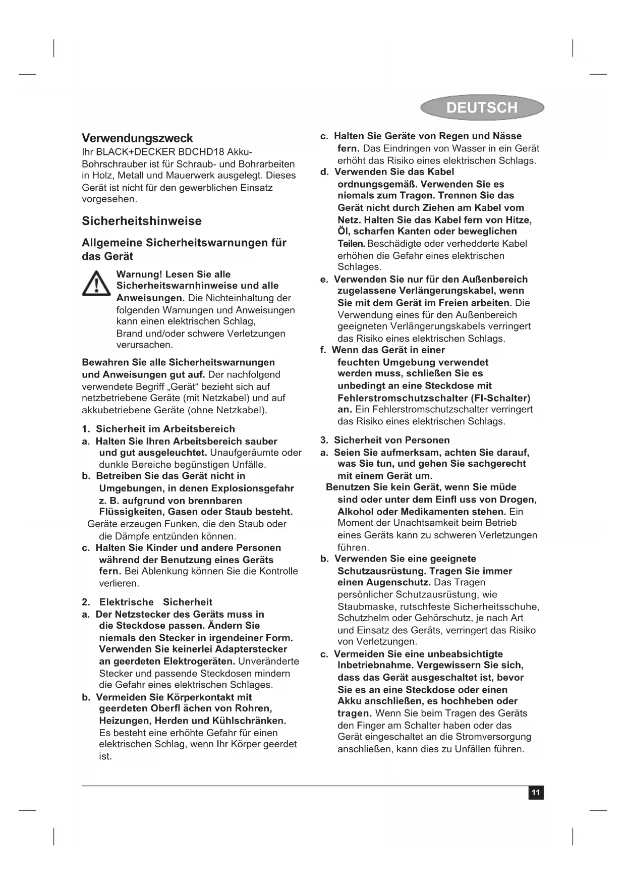 Garantie Вlack & Decker vertraut auf die Qualität der eigenen Geräte und bietet dem Käufer eine außergewöhnliche Garantie von 24 Monaten ab Kaufdatum. Diese Garantie versteht sich unbeschadet der gesetzlichen Gewährleistungsansprüche und schränkt diese keinesfalls ein. Diese Garantie gilt innerhalb der Staatsgebiete der Mitgliedstaaten der Europäischen Union und der Europäischen Freihandelszone. Zur Inanspruchnahme dieser Garantie muss sie den allgemeinen Geschäftsbedingungen von Вlack & Decker entsprechen und dem Verkäufer bzw. der Vertragswerkstatt ist ein Kaufnachweis vorzulegen. Die Bedingungen für die 2-jährige Garantie von Вlack & Decker und den Standort Ihrer nächstgelegenen Vertragswerkstatt fi nden Sie im Internet unter www.2helpU.com oder indem Sie sich an die lokale Вlack & Decker-Niederlassung wenden, deren Adresse Sie in dieser Anleitung fi nden. Ihr neues Вlack & Decker Produkt können Sie auf unserer Website unter www.blackanddecker.de registrieren. Dort erhalten Sie auch Informationen über neue Produkte und Sonderangebote.19 FRANÇAIS Utilisation prévue Votre perceuse BLACK+DECKER BDCHD18 a été conçue pour visser et pour percer le bois, le métal et le plastique. Cet outil est destiné à un usage grand public uniquement. Consignes de sécurité Consignes de sécurité concernant les outils électriques Avertissement ! Lisez tous les avertissements et toutes les consignes de sécurité. Le non-respect des avertissements et des instructions listés ci-dessous peut entraîner des chocs électriques, des incendies et/ou de graves blessures. Conservez tous les avertissements et toutes les instructions afi n de pouvoir vous y référer dans le futur. Le terme «outil électrique» mentionné dans tous les avertissements listés ci-dessous fait référence à vos outils électriques branchés sur secteur (avec câble) ou fonctionnant sur pile ou batterie (sans fi l).
