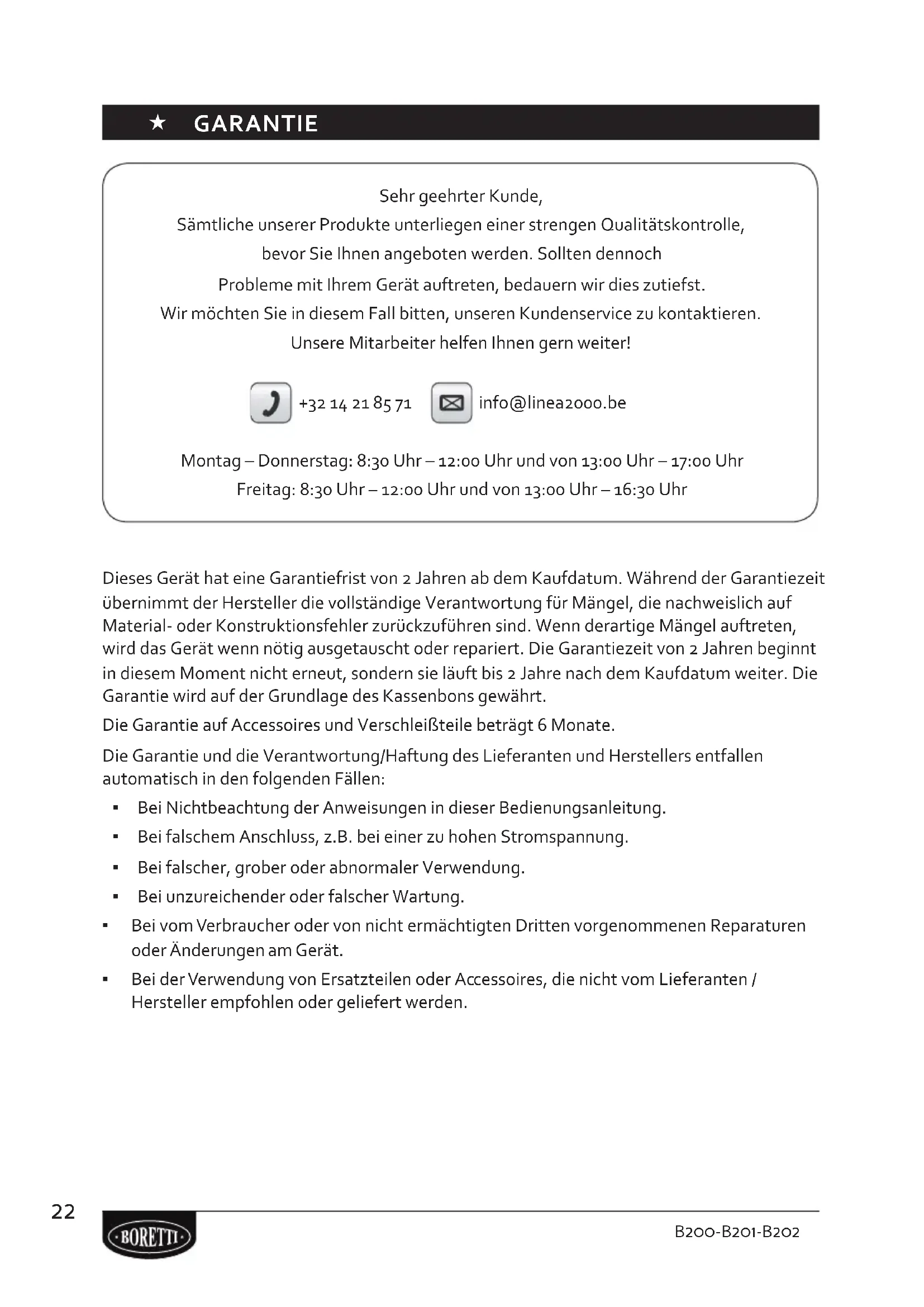 Ce symbole sur le produit ou son emballage indique que ce produit ne peut être traité comme déchet ménager. Il doit plutôt être remis au point de ramassage concerné, se chargeant du recyclage du matériel électrique et électronique. En vous assurant que ce produit est éliminé correctement, vous favorisez la prévention des conséquences négatives pour l’environnement et la santé humaine qui, sinon, seraient le résulat d’un traitement inapproprié des déchets de ce produit. Pour obtenir plus de détails sur le recyclage de ce produit, veuillez prendre contact avec le bureau municipal de votre région, votre service d’éliminiation des déchets ménagers ou le magasin où vous avez acheté le produit. L’emballage est recyclable. Traitez l’emballage écologiquement.22 B200-B201-B202 Bernini www.boretti.com Gebruiksaanwijzing NL Mode d’emploi FR De Dollard 17, 1454 AT Watergang T + 31 (0) 20 - 436 34 39, F +31 (0) 20 - 436 13 26 W www.boretti.com E info@boretti.com T +32 (0)3 450 81 80, F +32 (0)3 458 68 47W www.boretti.beE info@boretti.be Boretti - The Netherlands Boretti - Belgium www.boretti.com BORETTI0086 Cover Gebruiksaanwijzingen_v4.indd 3-4 06-11-15 16:33 « GARANTIE Sehr geehrter Kunde, Sämtliche unserer Produkte unterliegen einer strengen Qualitätskontrolle, bevor Sie Ihnen angeboten werden. Sollten dennoch Probleme mit Ihrem Gerät auftreten, bedauern wir dies zutiefst. Wir möchten Sie in diesem Fall bitten, unseren Kundenservice zu kontaktieren. Unsere Mitarbeiter helfen Ihnen gern weiter! +32 14 21 85 71 info@linea2000.be Montag – Donnerstag: 8:30 Uhr – 12:00 Uhr und von 13:00 Uhr – 17:00 Uhr Freitag: 8:30 Uhr – 12:00 Uhr und von 13:00 Uhr – 16:30 Uhr Dieses Gerät hat eine Garantiefrist von 2 Jahren ab dem Kaufdatum. Während der Garantiezeit übernimmt der Hersteller die vollständige Verantwortung für Mängel, die nachweislich auf Material- oder Konstruktionsfehler zurückzuführen sind. Wenn derartige Mängel auftreten, wird das Gerät wenn nötig ausgetauscht oder repariert. Die Garantiezeit von 2 Jahren beginnt in diesem Moment nicht erneut, sondern sie läuft bis 2 Jahre nach dem Kaufdatum weiter. Die Garantie wird auf der Grundlage des Kassenbons gewährt. Die Garantie auf Accessoires und Verschleißteile beträgt 6 Monate. Die Garantie und die Verantwortung/Haftung des Lieferanten und Herstellers entfallen automatisch in den folgenden Fällen: