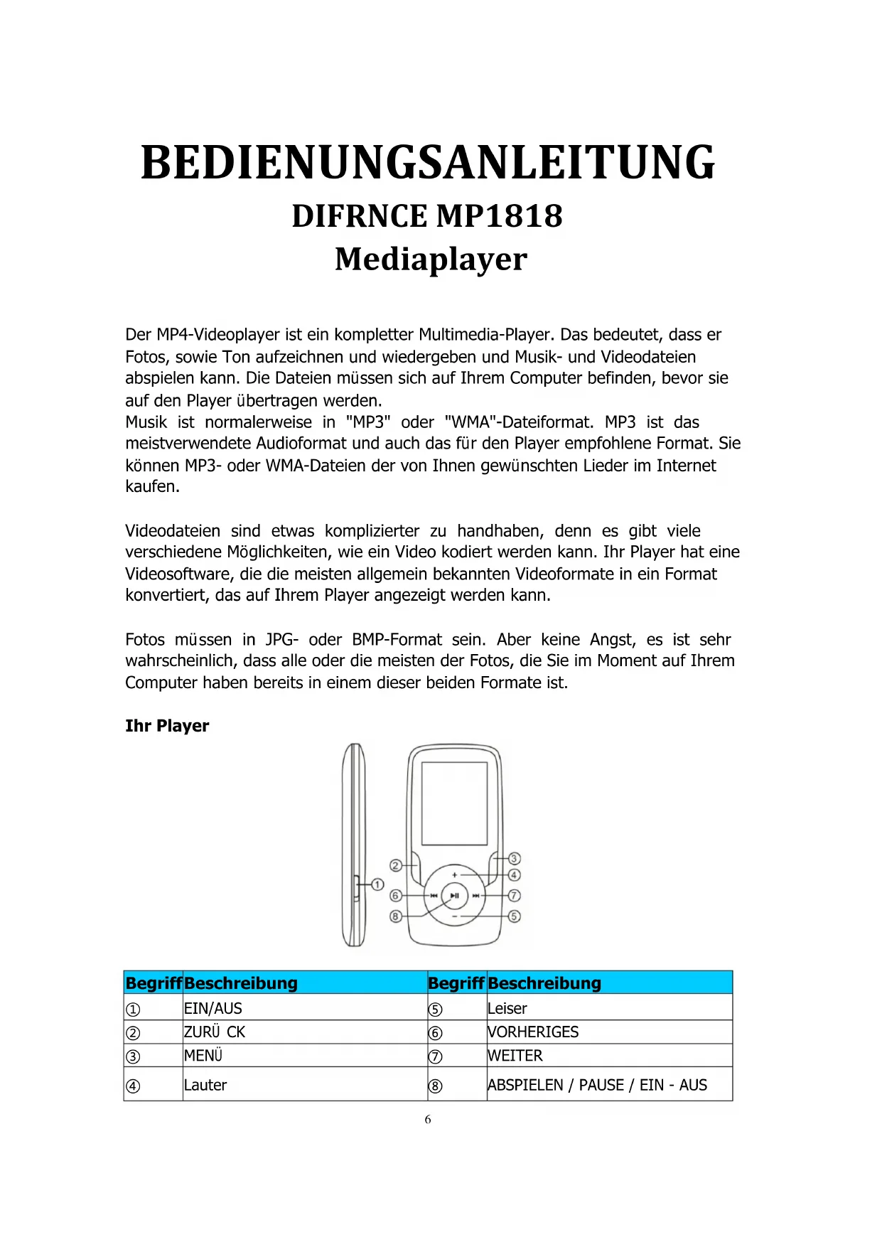 BEDIENUNGSANLEITUNG DIFRNCE MP1818 Mediaplayer