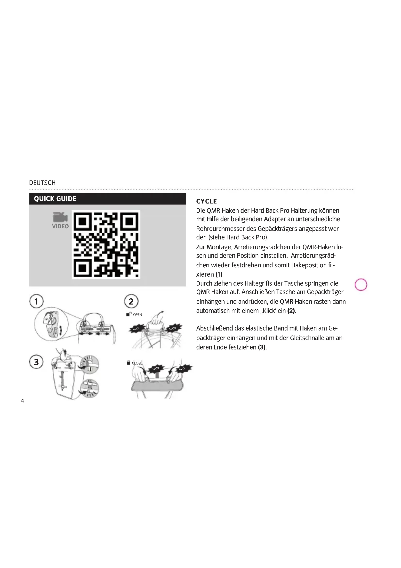 DEUTSCH CYCLE Die QMR Haken der Hard Back Pro Halterung können mit Hilfe der beiligenden Adapter an unterschiedliche Rohrdurchmesser des Gepäckträgers angepasst wer- den (siehe Hard Back Pro). Zur Montage, Arretierungsrädchen der QMR-Haken lö- sen und deren Position einstellen. Arretierungsräd- chen wieder festdrehen und somit Hakeposition fi - xieren (1). Durch ziehen des Haltegriffs der Tasche springen die QMR Haken auf. Anschließen Tasche am Gepäckträger einhängen und andrücken, die QMR-Haken rasten dann automatisch mit einem „Klick“ein (2). Abschließend das elastische Band mit Haken am Ge- päckträger einhängen und mit der Gleitschnalle am an- deren Ende festziehen (3). VIDEO QUICK GUIDE