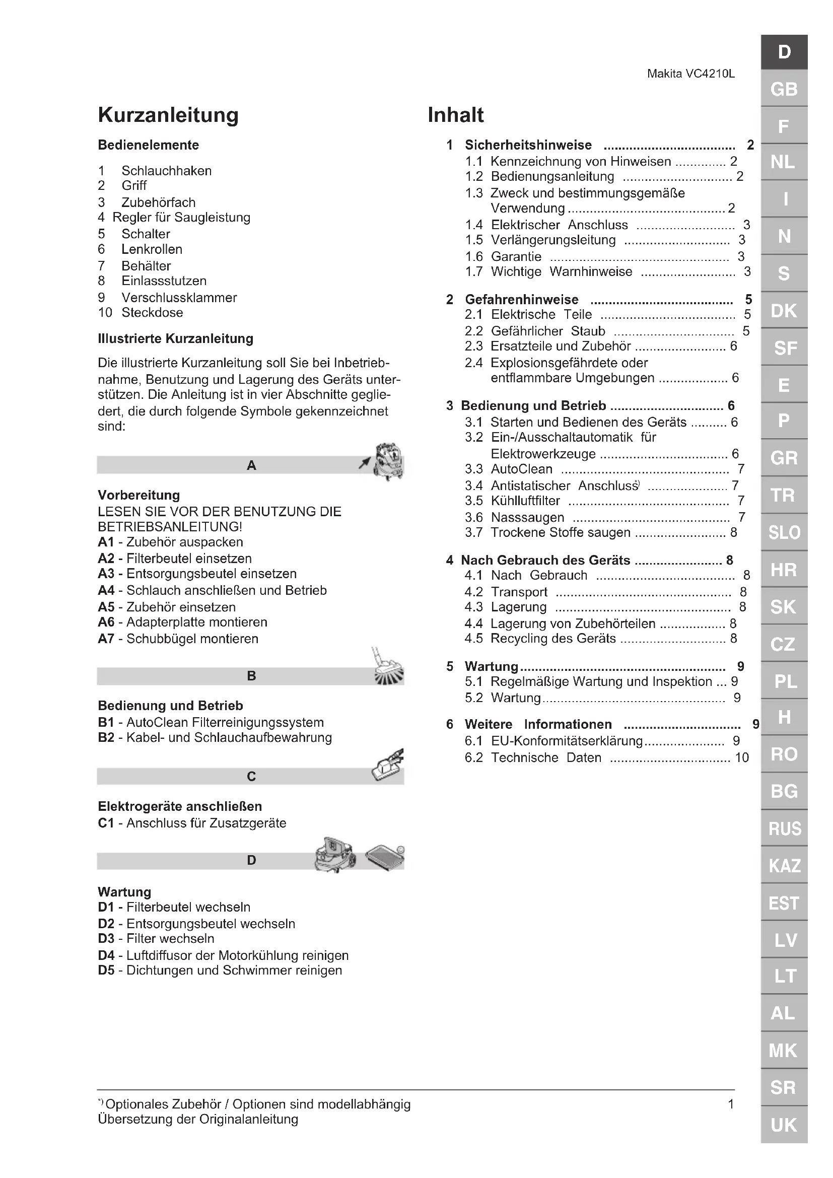 Makita VC4210L 1 Sicherheitshinweise Dieses Dokument enthält die Kurzanleitung sowie wichtige Sicherheitsinformationen zum Gerät. Sie müssen diese Bedienungsanleitung sorgfältig le- sen, bevor Sie das Gerät zum ersten Mal in Betrieb nehmen. Heben Sie diese Anleitung für die spätere Verwendung auf. Weitere Informationen Weitere Informationen zum Gerät finden Sie auf unserer Internetseite www.makita.com. Bei Fragen wenden Sie sich bitte an den Makita-Service in Ihrem Land. Siehe Rückseite dieses Dokuments.