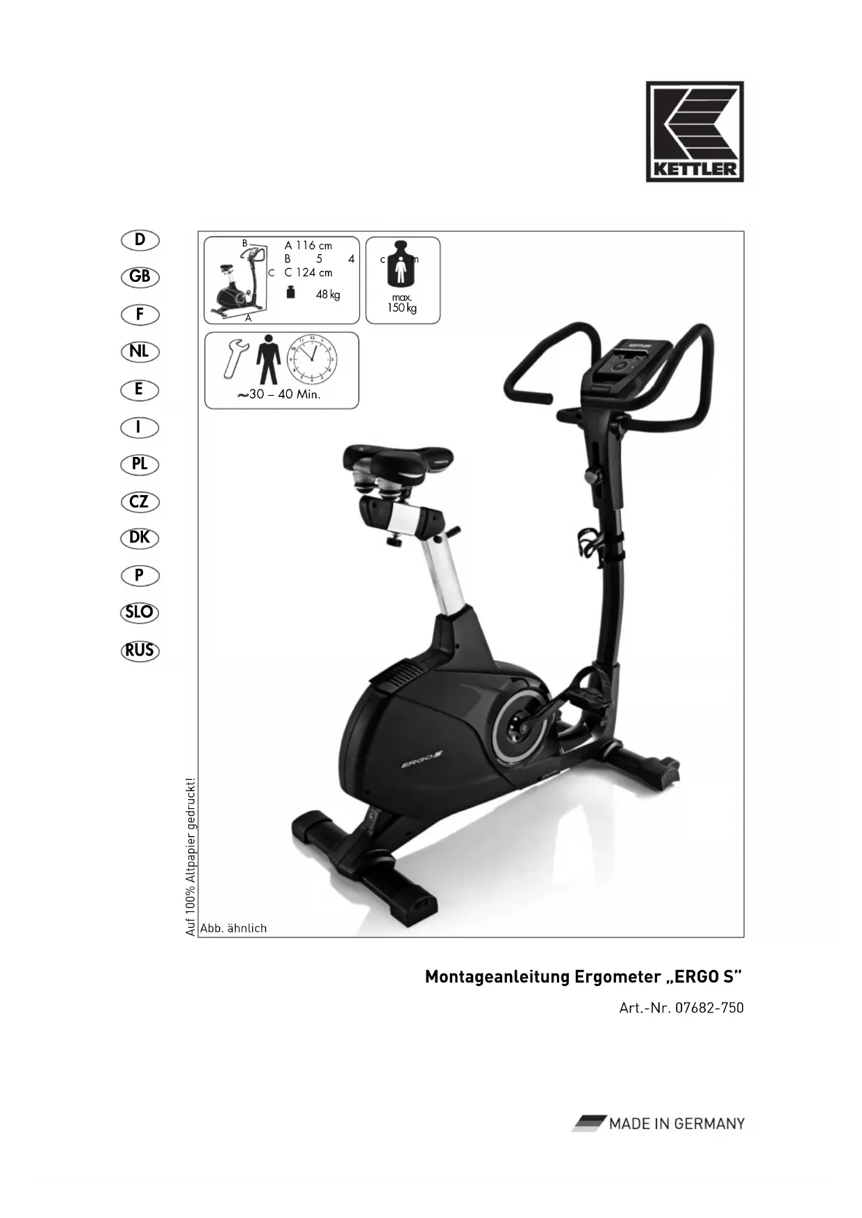 SLO RUS Montageanleitung Ergometer „ERGO S” Art.-Nr. 07682-750 Abb. ähnlich Auf 100% Altpapier gedruckt!2 Wichtige Hinweise Bitte lesen Sie diese Anweisung vor der Montage und der ersten Benutzung aufmerksam durch. Sie erhalten wichtige Hinweise für Ihre Sicherheit sowie den Gebrauch und die Wartung des Gerätes. Bewahren Sie diese Anleitung zur Information bzw. für Wartungsarbeiten oder Ersatzteilbestellungen sorgfältig auf. Zur Handhabung VORSICHT! Eine Verwendung des Gerätes in direkter Nähe von Feuchträumen ist wegen der damit verbundenen Rostbildung nicht zu empfehlen. Achten Sie auch darauf, dass keine Flüssigkeiten (Getränke, Schweiss, usw.) auf Teile des Gerätes gelangen. Dies könnte zu Korrosionen führen. ■ Stellen Sie sicher, dass der Trainingsbetrieb nicht vor der ord- nungsgemäßen Ausführung und Überprüfung der Montage auf- genommen wird. ■ Das Ergometer ist als Trainingsgerät für Erwachsene konzipiert Zu Ihrer Sicherheit GEFAHR! Weisen Sie anwesende Personen (insbesondere Kinder) auf mögliche Gefährdungen während der Übungen hin. GEFAHR! Nehmen Sie niemals Eingriffe an Ihrem Stromnetz selber vor, beauftragen Sie ggf. qualifiziertes Fachpersonal. GEFAHR! Bei allen Reparatur-, Wartungs- und Reinigungsarbei - ten unbedingt den Netzstecker ziehen. GEFAHR! Halten Sie während der Montage des Produktes Kinder fern (Verschluckbahre Kleinteile). GEFAHR! Systeme der Herzfrequenzüberwachung können ungenau sein. Übermäßiges Trainieren kann zu einem ernst- haften gesundheitlichen Schaden oder zum Tod führen. Beenden Sie bei Schwindel- oder Schwächegefühl sofort das Training. WARNUNG! Das Gerät darf nur für seinen bestimmungs- gemäßen Zweck verwendet werden, d.h. für das Körpertraining erwachsener Personen. WARNUNG! Jegliche andere Verwendung ist unzulässig und möglicherweise gefährlich. Der Hersteller kann nicht für Schäden verantwortlich gemacht werden, die durch nicht bestimmungs- gemäßen Gebrauch verursacht werden. WARNUNG! Beachten Sie auch unbedingt die Hinweise zur Trainingsgestaltung in der Trainingsanleitung. WARNUNG! Bei Verlust des Pulssignals wird die Leistung vom Gerät ca. 60 Sekunden lang konstant bleiben und dann langsam heruntergeregelt. Prüfen Sie bitte Ihr Pulsmesssystem (Ohrclip, Handpuls oder Brustgurt), sodass das Pulssignal von der Elektronik wieder erfasst werden kann. WARNUNG! Alle elektrischen Geräte senden beim Betrieb elek- tromagnetische Strahlung aus. Achten Sie darauf, besonders strah- lungsintensive Geräte (z. B. Handys) nicht in direkter Nähe des Cockpits oder der Steuerungselektronik abzustellen, da sonst Anzeigewerte verfälscht werden könnten (z. B. Pulsmessung). WARNUNG! Achten Sie unbedingt darauf, dass das Elektrokabel nicht eingeklemmt oder zur „Stolperfalle” wird. WARNUNG! Das Trainingsgerät ist ausschließlich für den Heimgebrauch bestimmt. ■ Sie trainieren mit einem Gerät, das sicherheitstechnisch nach neuesten Erkenntnissen konstruiert wurde. Mögliche Gefahrenstellen, die Verletzungen verursachen können, sind best- möglich vermieden und abgesichert. ■ Durch unsachgemäße Reparaturen und bauliche Veränderungen (Demontage von Originalteilen, Anbau von nicht zulässigen Teilen, usw.) können Gefahren für den Benutzer entstehen. ■ Beschädigte Bauteile können Ihre Sicherheit und die Lebensdauer des Gerätes beeinträchtigen. Tauschen Sie deshalb beschä- digte oder verschlissene Bauteile sofort aus und entziehen Sie das Gerät bis zur Instandsetzung der Benutzung. Verwenden Sie im Bedarfsfall nur Original Kettler-Ersatzteile. ■ Führen Sie bei regelmäßigem und intensivem Trainingsbetrieb ca. alle 1 bis 2 Monate Kontrollen aller Geräteteile, insbe- sondere der Schrauben und Muttern durch. Dies gilt insbe- sondere für die Sattel und Griffbügelbefestigung. ■ Um das konstruktiv vorgegebene Sicherheitsniveau dieses Gerätes langfristig garantieren zu können, sollte das Gerät regelmäßig vom Spezialisten (Fachhandel) geprüft und gewartet werden (einmal im Jahr). ■ Das Gerät benötigt eine Netzspannung von 230 V, 50 Hz. Verbinden Sie das Netzkabel mit einer Schutzkontakt-Steckdose. ■ Verwenden Sie keine Mehrfachsteckdosen zum Anschluß! Bei Verwendung eines Verlängerungskabels muß dieses den VDE- Richtlinien entsprechen. ■ Ziehen Sie bei längerem Nichtgebrauch den Netzstecker des Gerätes aus der Steckdose. ■ Lassen Sie vor Aufnahme des Trainings durch Ihren Hausarzt klären, ob Sie gesundheitlich für das Training mit diesem Gerät geeignet sind. Der ärztliche Befund sollte Grundlage für den Aufbau Ihres Trainingsprogrammes sein. Falsches oder über- mäßiges Training kann zu Gesundheitsschäden führen. ■ Alle hier nicht beschriebenen Eingriffe / Manipulationen am Gerät können eine Beschädigung hervorrufen oder auch eine Gefährdung der Person bedeuten. Weitergehende Eingriffe sind nur vom KETTLER-Service oder von KETTLER geschultem Fachpersonal zulässig. ■ Beachten Sie die allgemeinen Sicherheits be stimmung en und - vorkehrungen für den Umgang mit elektrischen Geräten ■ Unsere Produkte unterliegen einer ständigen, innovativen Qualitätssicherung. Daraus resultierende, technische Ände- rungen behalten wir uns vor. ■ Im Zweifelsfall und bei Fragen wenden Sie sich bitte an Ihren Fachhändler. ■ Der Standort des Geräts muss so gewählt werden, dass aus- reichende Sicherheitsabstände zu Hindernissen gewährleistet sind. In unmittelbarer Nähe von Hauptlaufrichtungen (Wege, Tore, Durchgänge) sollte das Aufstellen unterbleiben. Der Sicherheitsabstand muss umlaufend mindestens 1 mtr. größer als der Übungsbereich sein. ■ Das Trainingsgerät muss auf einem waagerechten Untergrund aufgestellt werden. Legen Sie zur Stoßdämpfung geeignetes Puffermaterial unter (Gummimatten, Bastmatten oder dgl.). Nur für Geräte mit Gewichten: Vermeiden Sie harte Aufschläge der Gewichte. ■ Achten Sie bei der Montage des Produktes auf die empfohle