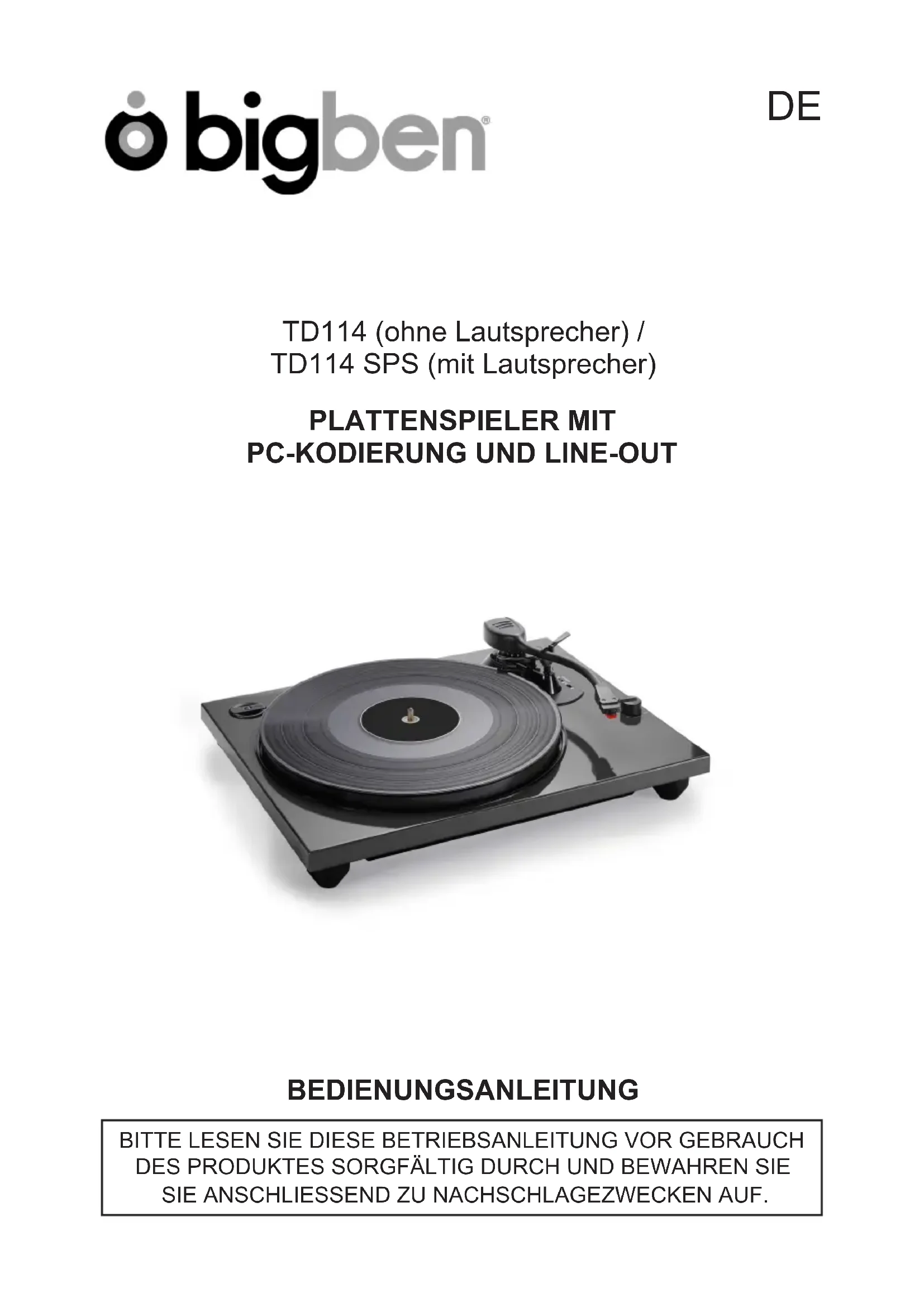 TD114 - Plattenspieler BIGBEN - Kostenlose Bedienungsanleitung