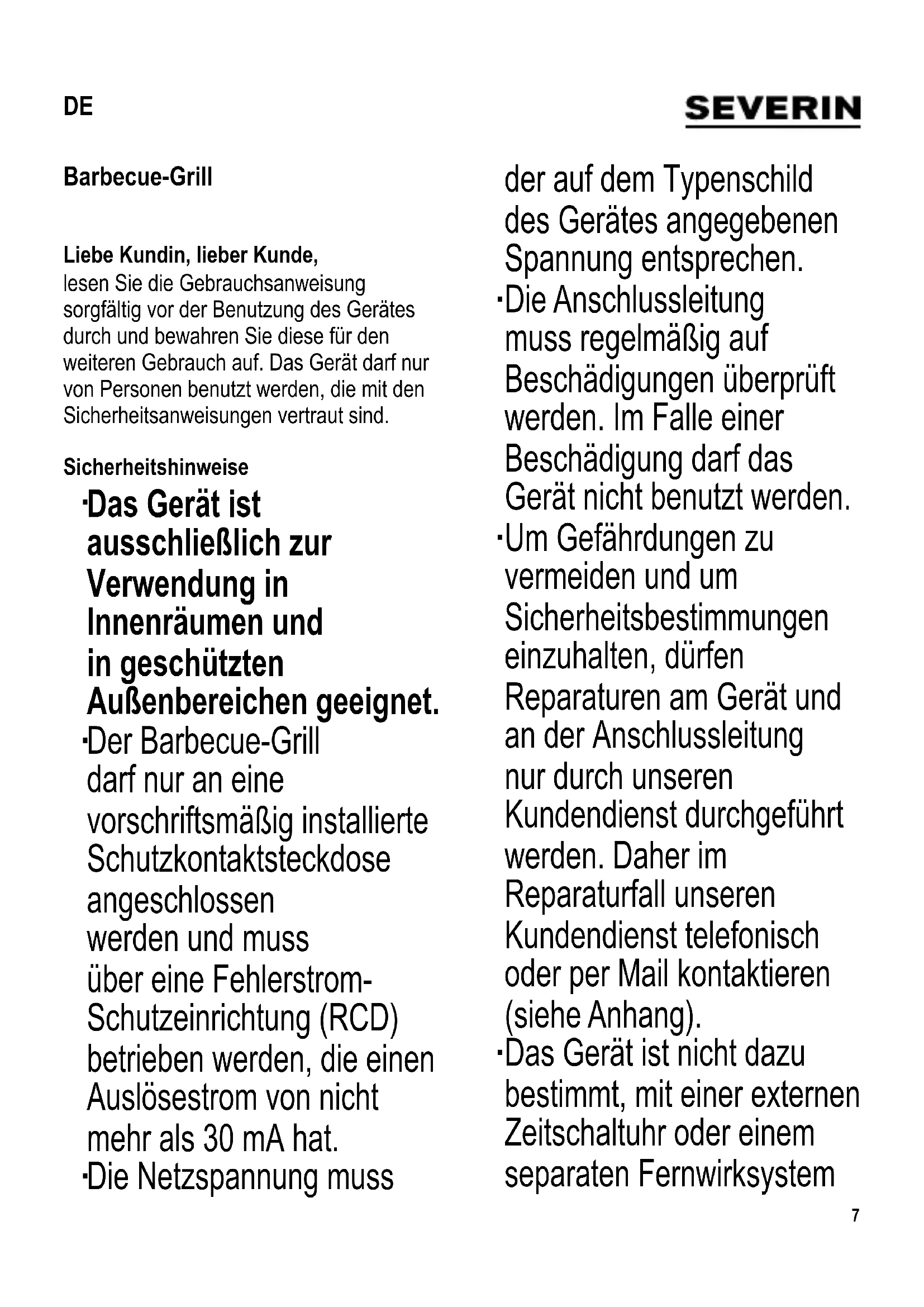 Deckel. Tipp! Der Grill kann auch ohne Untergestell als Tischgrill verwendet werden. Erstes Aufheizen ∙ Den Netzstecker in eine Schutzkontaktsteckdose stecken. ∙ Das Gerät ohne Grillgut ca. 10 Minuten mit geschlossenem Deckel und auf höchster Stufe aufheizen, damit der Eigengeruch des Grills abklingt. (Leichte Rauchentwicklung ist möglich, daher für ausreichende Lüftung durch geöffnete Fenster oder Balkontüren sorgen.) ∙ Die Grillplatte reinigen wie unter Reinigung und Pfl ege beschrieben. Thermometer Das Thermometer im Deckel zeigt die Temperatur im Garraum an. Grillplatte ∙ Die Grillplatte ist mit einer langlebigen keramischen Beschichtung versehen. Das ermöglicht Grillen bei hohen Temperaturen ohne oder evtl. mit nur wenig Fett/Öl. ∙ Zum Grillen von z.B. Gemüse oder Fisch wenig hitzebeständiges Fett/Öl (z.B. Brat-, Kokos- oder Palmfett,12 Sonnenblumen- oder Rapsöl) mit einem Backpinsel oder Haushaltspapier auf die Grillplatte geben. ∙ Nicht hitzebeständige Öle brennen sich auf der keramischen Oberfl äche ein und zerstören ihre Antihaftwirkung dauerhaft. ∙ Hinweise zur Reinigung dem Abschnitt Reinigung und Pfl ege entnehmen. Grillen ∙ Den Barbecue-Grill auf korrekte Montage und sicheren Stand prüfen. ∙ Den Netzstecker in eine Schutzkontaktsteckdose stecken. ∙ Den Temperaturregler auf Position MAX drehen. Die Kontrolllampe leuchtet und die Grillplatte heizt auf. ∙ Bei ausreichender Temperatur den Deckel öffnen und das Grillgut aufl egen. ∙ Das Grillen kann mit geöffnetem oder geschlossenem Deckel erfolgen. Grillen mit geschlossenem Deckel ermöglicht aufgrund des Backofeneffektes höhere Temperaturen und indirektes Grillen. ∙ Bei Bedarf die Temperatur mithilfe des Temperaturreglers höher oder tiefer einstellen. ∙ Nach Beendigung des Grillens: ∙ Den Temperaturregler zurück in die Position MIN drehen. ∙ Den Netzstecker ziehen und erst danach den Thermostatstecker aus dem Anschluss ziehen. ∙ Den Grill abkühlen lassen. Reinigung und Pfl ege ∙ Den Grill nach jedem Gebrauch reinigen. ∙ Vor jeder Reinigung den Netzstecker ziehen, den Thermostatstecker aus dem Anschluss ziehen und den Barbecue Grill abkühlen lassen. ∙ Keine Metallschwämme, Stahlwolle und scheuernden Reinigungsmittel zur Reinigung verwenden. ∙ Die Grillplatte mit einem Haushaltspapier abwischen. Bei stärkerer Verschmutzung die Grillplatte abnehmen und im Spülwasser mit einem weichen Schwamm reinigen, evtl. einweichen lassen. Die Grillplatte und insbesondere den Thermostatanschluss gründlich abtrocknen. ∙ Die Anschlussleitung mit Thermostatstecker darf aus Gründen der elektrischen Sicherheit nicht mit Flüssigkeiten behandelt oder gar darin eingetaucht werden. Das Thermostat nur mit einem leicht angefeuchteten Tuch reinigen. ∙ Den Grilldeckel und die Grillwanne bei Bedarf mit einem im Spülwasser getränkten Tuch abwischen. Anschließend mit einem Tuch abtrocknen. ∙ Die Fettauffangschale im warmen Spülwasser reinigen. ∙ Die Einzelteile dürfen nicht in der Spülmaschine gereinigt werden.13 Ersatzteile und Zubehör Ersatzteile oder Zubehör können bequem im Internet auf unserer Homepage www. severin.de unter dem Unterpunkt „Service / Ersatzteil-Shop“ bestellt werden. Entsorgung Geräte, die mit diesem Symbol gekennzeichnet sind, müssen getrennt vom Hausmüll entsorgt werden. Diese Geräte enthalten wertvolle Rohstoffe, die wiederverwertet werden können. Eine ordnungsgemäße Entsorgung schützt die Umwelt und die Gesundheit Ihrer Mitmenschen. Ihre Gemeindeverwaltung bzw. Ihr Fachhändler gibt Auskunft über die ordnungsgemäße Entsorgung. Garantie Von den nachfolgenden Garantiebedingungen bleiben die gesetzlichen Gewährleistungsrechte gegenüber dem Verkäufer und eventuelle Verkäufergarantien unberührt. Wenden Sie sich im Garantiefall daher direkt an den Fachhändler. Zusätzlich gewährt SEVERIN eine Herstellergarantie von zwei Jahren ab Kaufdatum. In diesem Zeitraum beseitigen wir kostenlos alle Mängel, die nachweislich auf Material- oder Fertigungsfehlern beruhen und die Funktion wesentlich beeinträchtigen. Weitere Ansprüche sind ausgeschlossen. Von der Garantie ausgenommen sind: Schäden, die auf Nichtbeachtung der Gebrauchsanweisung, unsachgemäße Behandlung oder normalen Verschleiß zurückzuführen sind, ebenso leicht zerbrechliche Teile wie z. B. Glas, Kunststoff oder Glühlampen. Die Garantie erlischt bei Eingriff nicht von SEVERIN autorisierter Stellen. Sollte eine Reparatur erforderlich werden, setzen Sie sich bitte telefonisch oder per Mail mit unserem Kundendienst in Verbindung. Die Kontaktdaten fi nden Sie im Anhang der Anleitung.14 Barbecue grill Dear Customer, Before using the appliance, read the following instructions carefully and keep this manual for future reference. The appliance must only be used by persons familiar with these instructions. Important safety instructions ∙ This appliance is designed for use in indoor as well as protected outdoor areas only. ∙ The barbecue grill must only be connected to an earthed socket installed in accordance with the regulations. It must be operated with an additional earth-leakage circuit- breaker with a rated tripping current not exceeding 30 mA. ∙ Make sure that the supply voltage corresponds with the voltage marked on the rating label. ∙ The power cord should be regularly examined for any signs of damage. In the event of such damage being found, the appliance must no longer be used. ∙ In order to comply with safety regulations and to avoid hazards, repairs of electrical appliances must be carried out by qualifi ed personnel, including the replacement of the power cord. If repairs are needed, please send the appliance to one of our customer service departments (see appendix). ∙ The appliance is not intended to be operated by means of an external timer or separate remote-control system. ∙ Caution: Do not, under any circumstances, use charcoal or any other solid or