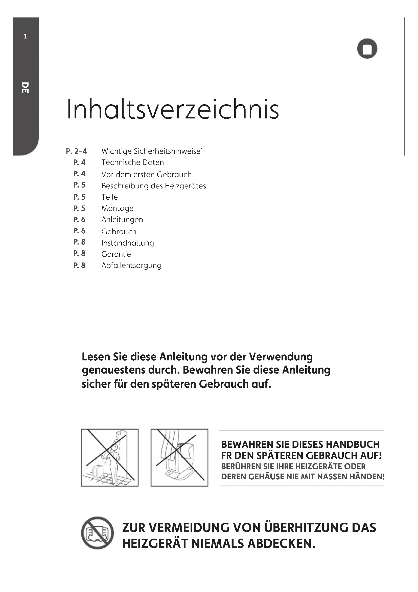 Inhaltsverzeichnis Wichtige Sicherheitshinweise`Technische DatenVor dem ersten GebrauchBeschreibung des HeizgerätesTeileMontageAnleitungenGebrauchInstandhaltungGarantieAbfallentsorgung Lesen Sie diese Anleitung vor der Verwendung genauestens durch. Bewahren Sie diese Anleitung sicher für den späteren Gebrauch auf.
