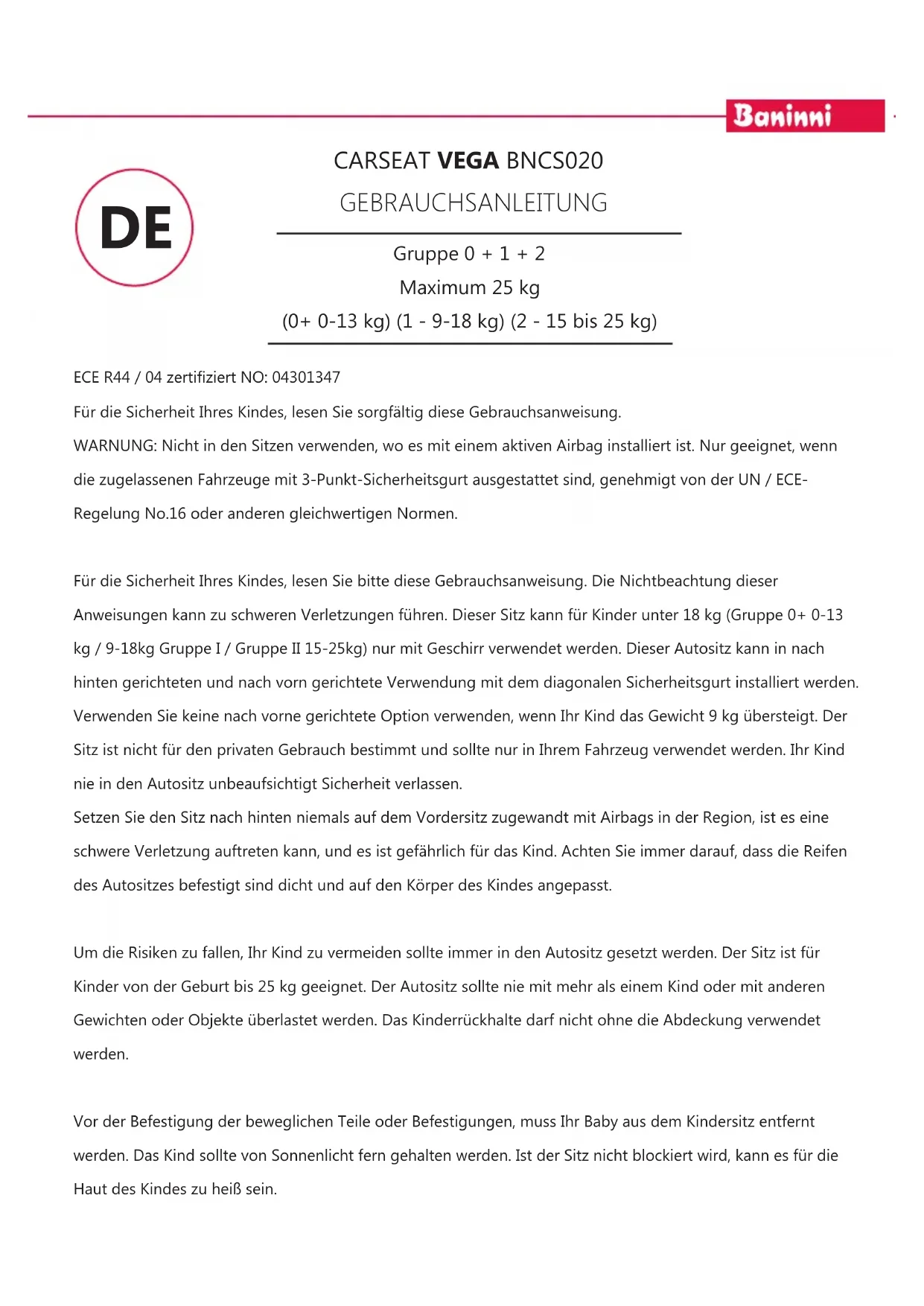 Laden Sie die Anleitung für Ihr Kindersitz kostenlos im PDF-Format! Finden Sie Ihr Handbuch Vega - Baninni und nehmen Sie Ihr elektronisches Gerät wieder in die Hand. Auf dieser Seite sind alle Dokumente veröffentlicht, die für die Verwendung Ihres Geräts notwendig sind. Vega von der Marke Baninni.