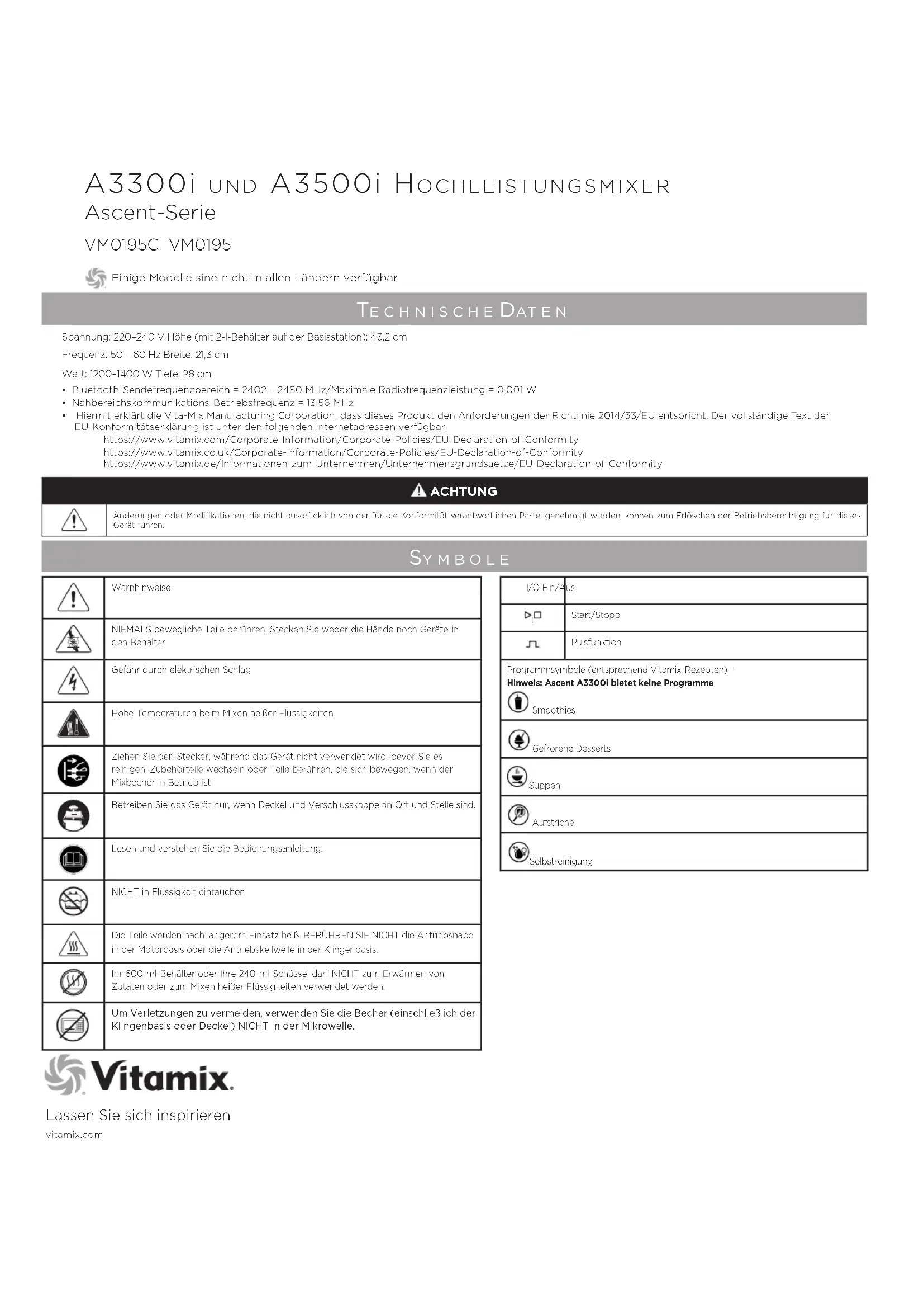 - Hiermit erklärt die Vita-Mix Manufacturing Corporation, dass dieses Produkt den Anforderungen der Richtlinie 2014/53/EU entspricht. Der vollständige Text der EU-Konformitätserklärung ist unter den folgenden Internetadressen verfügbar: https://www.vitamix.com/Corporate-Information/Corporate-Policies/EU-Declaration-of-Conformity https://www.vitamix.co.uk/Corporate-Information/Corporate-Policies/EU-Declaration-of-Conformity https://www.vitamix.de/Informationen-zum-Unternehmen/Unternehmensgrundsaetze/EU-Declaration-of-Conformity ACHTUNG Änderungen oder Modifikationen, die nicht ausdrücklich von der für die Konformität verantwortlichen Partei genehmigt wurden, können zum Erlöschen der Betriebsberechtigung für dieses Gerät führen. WarnhinweiseNIEMALS bewegliche Teile berühren. Stecken Sie weder die Hände noch Geräte in den BehälterGefahr durch elektrischen SchlagHohe Temperaturen beim Mixen heißer FlüssigkeitenZiehen Sie den Stecker, während das Gerät nicht verwendet wird, bevor Sie es reinigen, Zubehörteile wechseln oder Teile berühren, die sich bewegen, wenn der Mixbecher in Betrieb istBetreiben Sie das Gerät nur, wenn Deckel und Verschlusskappe an Ort und Stelle sind.Lesen und verstehen Sie die Bedienungsanleitung.NICHT in Flüssigkeit eintauchenDie Teile werden nach längerem Einsatz heiß. BERÜHREN SIE NICHT die Antriebsnabe in der Motorbasis oder die Antriebskeilwelle in der Klingenbasis.Ihr 600-ml-Behälter oder Ihre 240-ml-Schüssel darf NICHT zum Erwärmen von Zutaten oder zum Mixen heißer Flüssigkeiten verwendet werden. Um Verletzungen zu vermeiden, verwenden Sie die Becher (einschließlich der Klingenbasis oder Deckel) NICHT in der Mikrowelle.10 Wi c h t i g e hi n W e i S e z u m S i c h e r e n ge b r auch WARNHINWEISE: Um das Risiko ernster Verletzungen mit Ihrem Vitamix®-Mixer zu verhindern, sollten Sie die grundlegenden Sicherheitshinweise, wie in den folgenden Beispielen beschrieben, beachten. LESEN SIE VOR DER INBETRIEBNAHME DES MIXERS ALLE ANWEISUNGEN, SICHERHEITS- UND WARNHINWEISE.1. Lesen Sie alle Anweisungen.2. Verwenden Sie den Mixer ausschließlich für den vorgesehenen Zweck.3. Das Gerät ist nicht für den Gebrauch durch oder in der Nähe von Kindern sowie Personen mit verminderten physischen, sensorischen oder geistigen Fähigkeiten oder unzureichender Erfahrung bzw. Kenntnis geeignet. Eine genaue Überwachung ist notwendig, wenn der Mixer durch oder in der Nähe von Kindern oder behinderten Personen verwendet wird. Kinder müssen beaufsichtigt werden, um sicherzustellen, dass sie den Mixer nicht als Spielzeug verwenden.4. WARNHINWEIS: Um ein versehentliches Einschalten zu verhindern, sollten Sie das Gerät beim Nichtgebrauch sowie vor dem Einsetzen und Herausnehmen von Einzelteilen und vor der Reinigung immer ausschalten und den Stecker ziehen.5. ACHTUNG: Um eine Gefährdung durch versehentliches Deaktivieren des Überhitzungsschutzes zu vermeiden, darf dieser Mixer nicht über einen externen Schalter, z.B. einen Timer, oder an einen Stromkreis angeschlossen werden, der regelmäßig durch das Gerät ein- und ausgeschaltet wird.6. Um einen Stromschlag zu verhindern, darf die Basisstation des Mixers nicht in Wasser oder andere Flüssigkeiten getaucht werden.7. Vergewissern Sie sich immer, dass der Mixer AUSGESCHALTET ist, bevor Sie ihn an eine Steckdose anschließen. Um den Mixer vom Stromnetz zu trennen, schalten Sie ihn AUS und entfernen Sie erst dann den Stecker aus der Steckdose.8. Wenn im Bedienfeld Symbole und Ziern aufleuchten, ist das Gerät einsatzbereit. Vermeiden Sie unbeabsichtigte Berührungen des Touchscreens.9. Berühren Sie niemals bewegliche Teile. 10. Betreiben Sie den Mixer nicht mit einem beschädigten Stromkabel oder Stecker oder nachdem der Mixer Fehlfunktionen aufgewiesen hat oder heruntergefallen ist oder auf irgendeine andere Art beschädigt wurde. Rufen Sie umgehend den Vitamix Kundendienst unter +1-800-848-2649 oder +1-440-235-4840 an oder senden Sie eine E-Mail an service@vitamix.com, um Prüfung, Reparatur, Austausch oder Anpassung des Geräts zu vereinbaren. Außerhalb der USA und Kanadas wenden Sie sich an Ihren Vitamix-Händler vor Ort.11. Es können GFI-Schutzschalter in Ihrer Küche vorhanden sein. Diese befinden sich häufig in der Nähe von Waschbecken. Wenn der Mixbecher nicht funktioniert, stecken Sie ihn ab. Setzen Sie die Steckdose oder den Schutzschalter zurück. Wenn der Schutzschalter nach wie vor aktiviert wird, ziehen Sie den Mixer aus der Steckdose. Lassen Sie den Mixer 24 Stunden ruhen, bevor Sie erneut versuchen, ihn zu benutzen. Wenden Sie sich an den Vitamix Kundendienst, wenn das Problem weiterhin besteht.12. Veränderungen oder Modifikationen an Teilen des Mixers, einschließlich der Verwendung eines oder mehrerer Teile, die keine von Vitamix genehmigten Original-Teile sind, kann zu Bränden, Stromschlägen oder Verletzungen führen und hat das Erlöschen der Garantie zur Folge.13. Durch die Verwendung nicht originaler oder für den Gebrauch mit dem Gerät von Vitamix autorisierter Teile oder Zubehör, wie Einmachgläser, können Stromschläge, Brände und Verletzungen verursacht werden. Durch eine derartige Nutzung verfällt Ihr Garantieanspruch.14. Verwenden Sie das Gerät nicht im Freien. 15. Lassen Sie das Stromkabel nicht über den Rand eines Tisches oder einer Arbeitsplatte herunterhängen.16. Legen Sie die Motorbasis oder den Behälter nicht auf oder neben einen heißen Gas- oder Elektroherd oder einen eingeschalteten Ofen.17. Führen Sie Ihre Hände oder Küchengeräte nicht in den Mixer ein, wenn er in Betrieb ist, um dem Risiko schwerer körperlicher Verletzungen oder Beschädigungen am Gerät zu vermeiden. Schaber oder Spatel dürfen nur verwendet werden, wenn der Mixer nicht in Betrieb ist. 18. Der mitgelieferte Stößel darf nur dann eingesetzt werden, wenn der Hauptteil des Deckels eingerastet ist. 19. Die Klingen sind scharf. Seien Sie beim Reinigen der Klingen bzw. des B