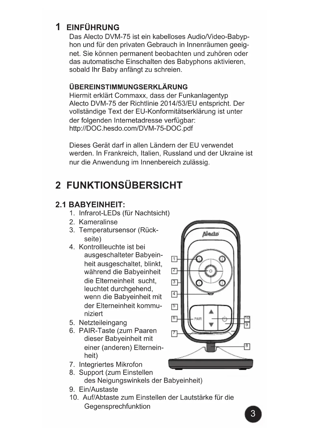 7 TECHNISCHE DATEN ............................................18 8 GARANTIE ..............................................................193 1 EINFÜHRUNG Das Alecto DVM-75 ist ein kabelloses Audio/Video-Babyp- hon und für den privaten Gebrauch in Innenräumen geeig- net. Sie können permanent beobachten und zuhören oder das automatische Einschalten des Babyphons aktivieren, sobald Ihr Baby anfängt zu schreien. ÜBEREINSTIMMUNGSERKLÄRUNG Hiermit erklärt Commaxx, dass der Funkanlagentyp Alecto DVM-75 der Richtlinie 2014/53/EU entspricht. Der vollständige Text der EU-Konformitätserklärung ist unter der folgenden Internetadresse verfügbar: http://DOC.hesdo.com/DVM-75-DOC.pdf Dieses Gerät darf in allen Ländern der EU verwendet werden. In Frankreich, Italien, Russland und der Ukraine ist nur die Anwendung im Innenbereich zulässig. 2 FUNKTIONSÜBERSICHT