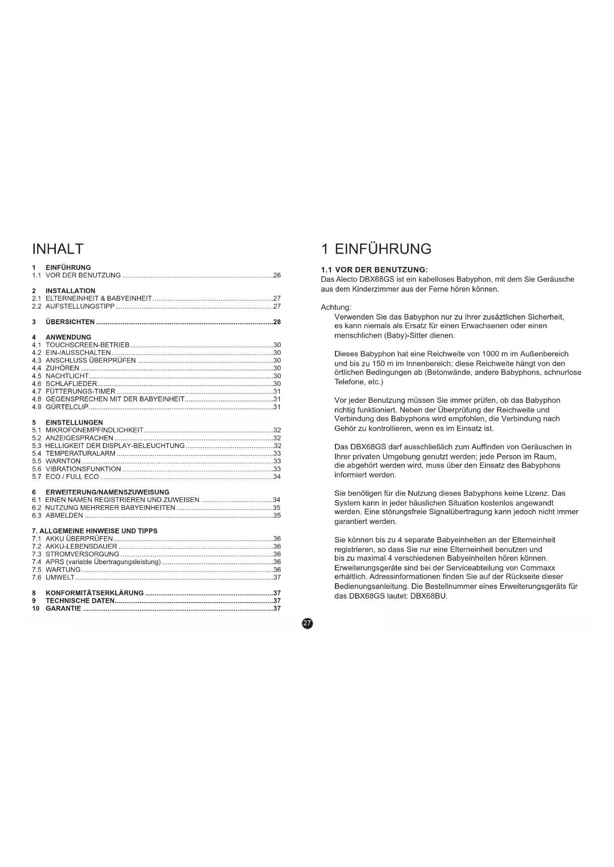 Das Alecto DBX68GS ist ein kabelloses Babyphon, mit dem Sie Geräusche aus dem Kinderzimmer aus der Ferne hören können. Achtung: Verwenden Sie das Babyphon nur zu Ihrer zusäztlichen Sicherheit, es kann niemals als Ersatz für einen Erwachsenen oder einen menschlichen (Baby)-Sitter dienen. Dieses Babyphon hat eine Reichweite von 1000 m im Außenbereich und bis zu 150 m im Innenbereich; diese Reichweite hängt von den örtlichen Bedingungen ab (Betonwände, andere Babyphons, schnurlose Telefone, etc.) Vor jeder Benutzung müssen Sie immer prüfen, ob das Babyphon richtig funktioniert. Neben der Überprüfung der Reichweite und Verbindung des Babyphons wird empfohlen, die Verbindung nach Gehör zu kontrollieren, wenn es im Einsatz ist. Das DBX68GS darf ausschließlich zum Auffinden von Geräuschen in Ihrer privaten Umgebung genutzt werden; jede Person im Raum, die abgehört werden wird, muss über den Einsatz des Babyphons informiert werden. Sie benötigen für die Nutzung dieses Babyphons keine Lizenz. Das System kann in jeder häuslichen Situation kostenlos angewandt werden. Eine störungsfreie Signalübertragung kann jedoch nicht immer garantiert werden. Sie können bis zu 4 separate Babyeinheiten an der Elterneinheit registrieren, so dass Sie nur eine Elterneinheit benutzen und bis zu maximal 4 verschiedenen Babyeinheiten hören können. Erweiterungsgeräte sind bei der Serviceabteilung von Commaxx erhältlich. Adressinformationen finden Sie auf der Rückseite dieser Bedienungsanleitung. Die Bestellnummer eines Erweiterungsgeräts für das DBX68GS lautet: DBX68BU.28 2 INSTALLATION
