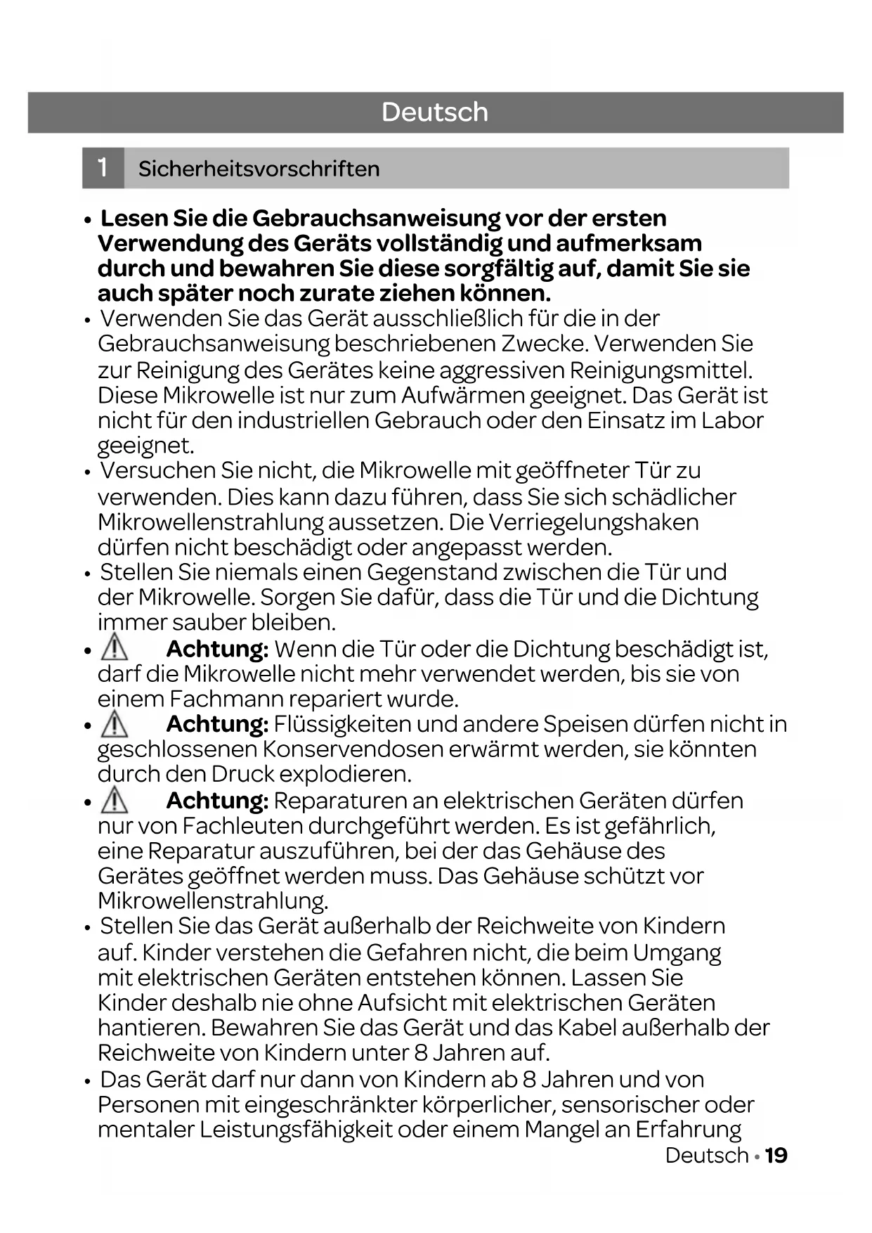 - Verwenden Sie das Gerät ausschließlich für die in der Gebrauchsanweisung beschriebenen Zwecke. Verwenden Sie zur Reinigung des Gerätes keine aggressiven Reinigungsmittel. Diese Mikrowelle ist nur zum Aufwärmen geeignet. Das Gerät ist nicht für den industriellen Gebrauch oder den Einsatz im Labor geeignet.
