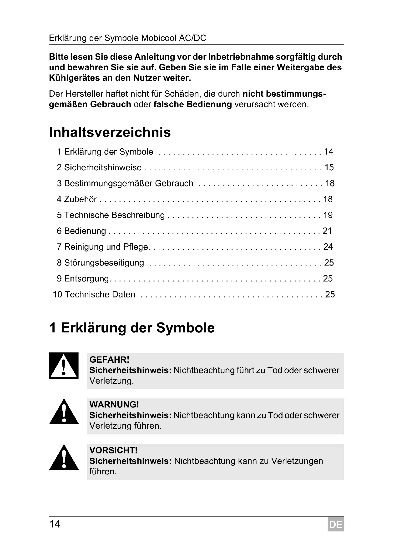 - Bitte lesen Sie diese Anleitung vor der Inbetriebnahme sorgfältig durch und bewahren Sie sie auf. Geben Sie sie im Falle einer Weitergabe des Kühlgerätes an den Nutzer weiter. Der Hersteller haftet nicht für Schäden, die durch nicht bestimmungs- gemäßen Gebrauch oder falsche Bedienung verursacht werden. Inhaltsverzeichnis 1 Erklärung der Symbole p. 14