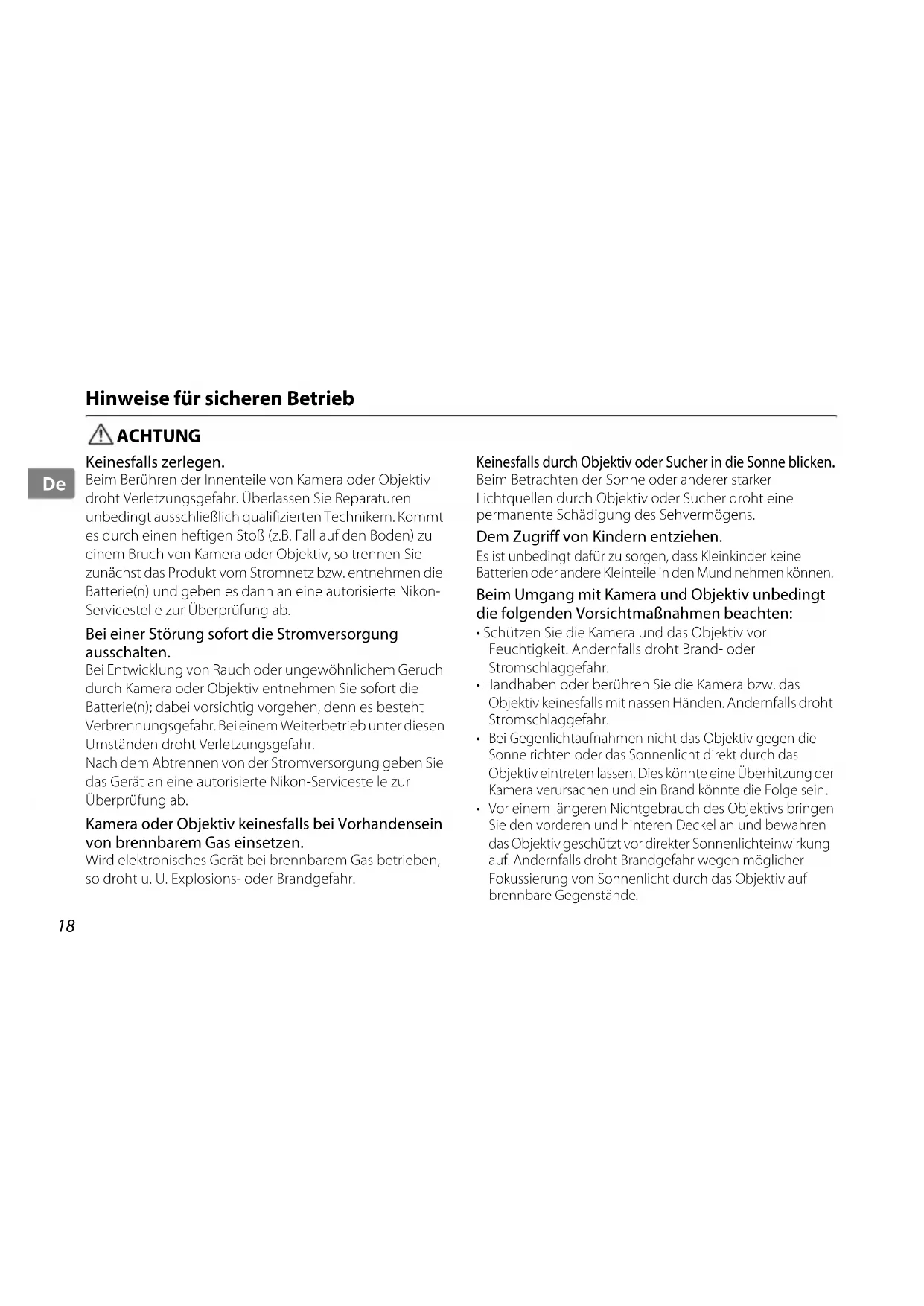 Hinweise für sicheren Betrieb ACHTUNG Keinesfalls zerlegen. Beim Berühren der Innenteile von Kamera oder Objektiv droht Verletzungsgefahr. Überlassen Sie Reparaturen unbedingt ausschließlich qualifizierten Technikern. Kommt es durch einen heftigen Stoß (z.B. Fall auf den Boden) zu einem Bruch von Kamera oder Objektiv, so trennen Sie zunächst das Produkt vom Stromnetz bzw. entnehmen die Batterie(n) und geben es dann an eine autorisierte Nikon- Servicestelle zur Überprüfung ab. Bei einer Störung sofort die Stromversorgung ausschalten. Bei Entwicklung von Rauch oder ungewöhnlichem Geruch durch Kamera oder Objektiv entnehmen Sie sofort die Batterie(n); dabei vorsichtig vorgehen, denn es besteht Verbrennungsgefahr. Bei einem Weiterbetrieb unter diesen Umständen droht Verletzungsgefahr. Nach dem Abtrennen von der Stromversorgung geben Sie das Gerät an eine autorisierte Nikon-Servicestelle zur Überprüfung ab. Kamera oder Objektiv keinesfalls bei Vorhandensein von brennbarem Gas einsetzen. Wird elektronisches Gerät bei brennbarem Gas betrieben, so droht u. U. Explosions- oder Brandgefahr. Keinesfalls durch Objektiv oder Sucher in die Sonne blicken. Beim Betrachten der Sonne oder anderer starker Lichtquellen durch Objektiv oder Sucher droht eine permanente Schädigung des Sehvermögens. Dem Zugriff von Kindern entziehen. Es ist unbedingt dafür zu sorgen, dass Kleinkinder keine Batterien oder andere Kleinteile in den Mund nehmen können. Beim Umgang mit Kamera und Objektiv unbedingt die folgenden Vorsichtmaßnahmen beachten: