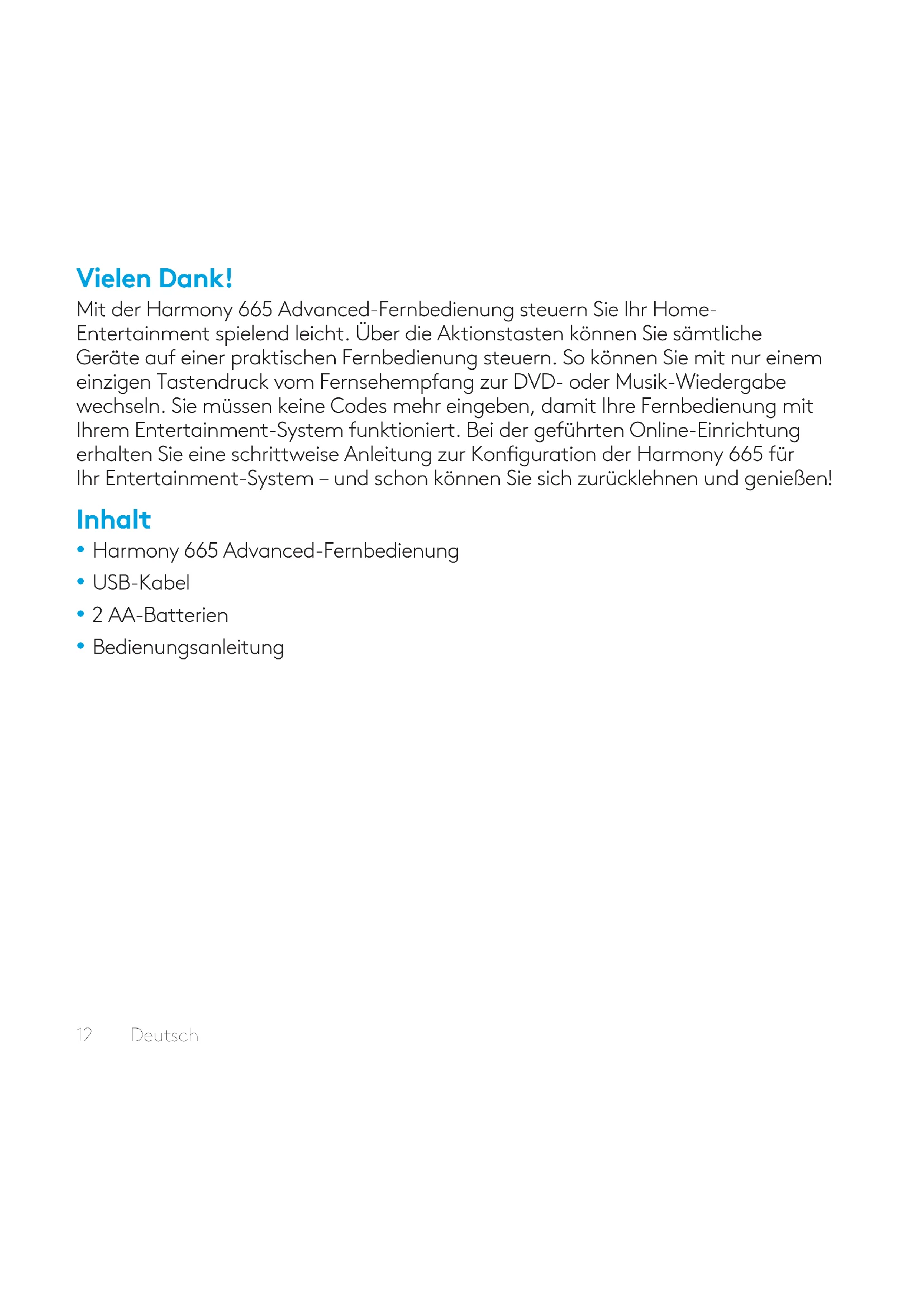 User forums12 Deutsch Vielen Dank! Mit der Harmony 665 Advanced-Fernbedienung steuern Sie Ihr Home- Entertainment spielend leicht. Über die Aktionstasten können Sie sämtliche Geräte auf einer praktischen Fernbedienung steuern. So können Sie mit nur einem einzigen Tastendruck vom Fernsehempfang zur DVD- oder Musik-Wiedergabe wechseln. Sie müssen keine Codes mehr eingeben, damit Ihre Fernbedienung mit Ihrem Entertainment-System funktioniert. Bei der geführten Online-Einrichtung erhalten Sie eine schrittweise Anleitung zur Konguration der Harmony 665 für Ihr Entertainment-System – und schon können Sie sich zurücklehnen und genießen! Inhalt