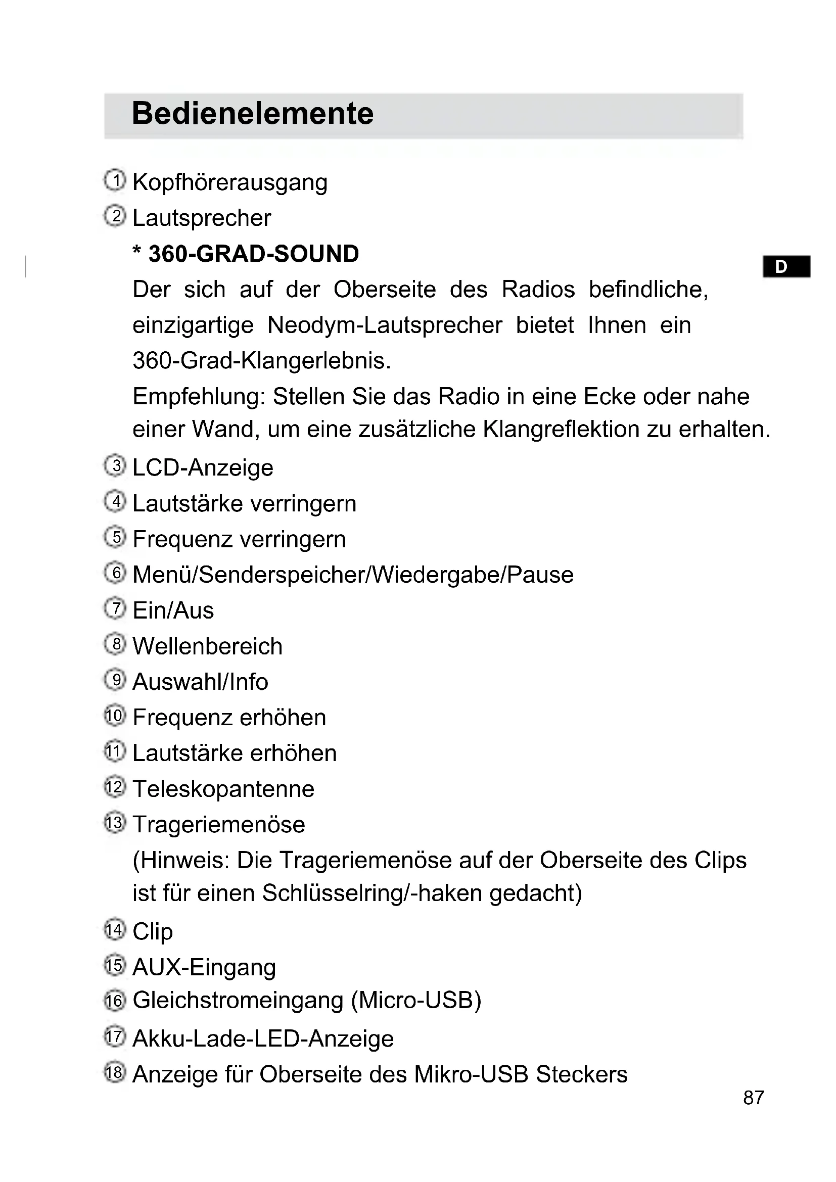 - 360-GRAD-SOUND Der sich auf der Oberseite des Radios befindliche, einzigartige Neodym-Lautsprecher bietet Ihnen ein 360-Grad-Klangerlebnis. Empfehlung: Stellen Sie das Radio in eine Ecke oder nahe einer Wand, um eine zusätzliche Klangreektion zu erhalten. LCD-Anzeige Lautstärke verringern Frequenz verringern Menü/Senderspeicher/Wiedergabe/Pause Ein/Aus Wellenbereich Auswahl/Info Frequenz erhöhen Lautstärke erhöhen Teleskopantenne Trageriemenöse (Hinweis: Die Trageriemenöse auf der Oberseite des Clips ist für einen Schlüsselring/-haken gedacht) Clip AUX-Eingang Gleichstromeingang (Micro-USB) Akku-Lade-LED-Anzeige Anzeige für Oberseite des Mikro-USB Steckers