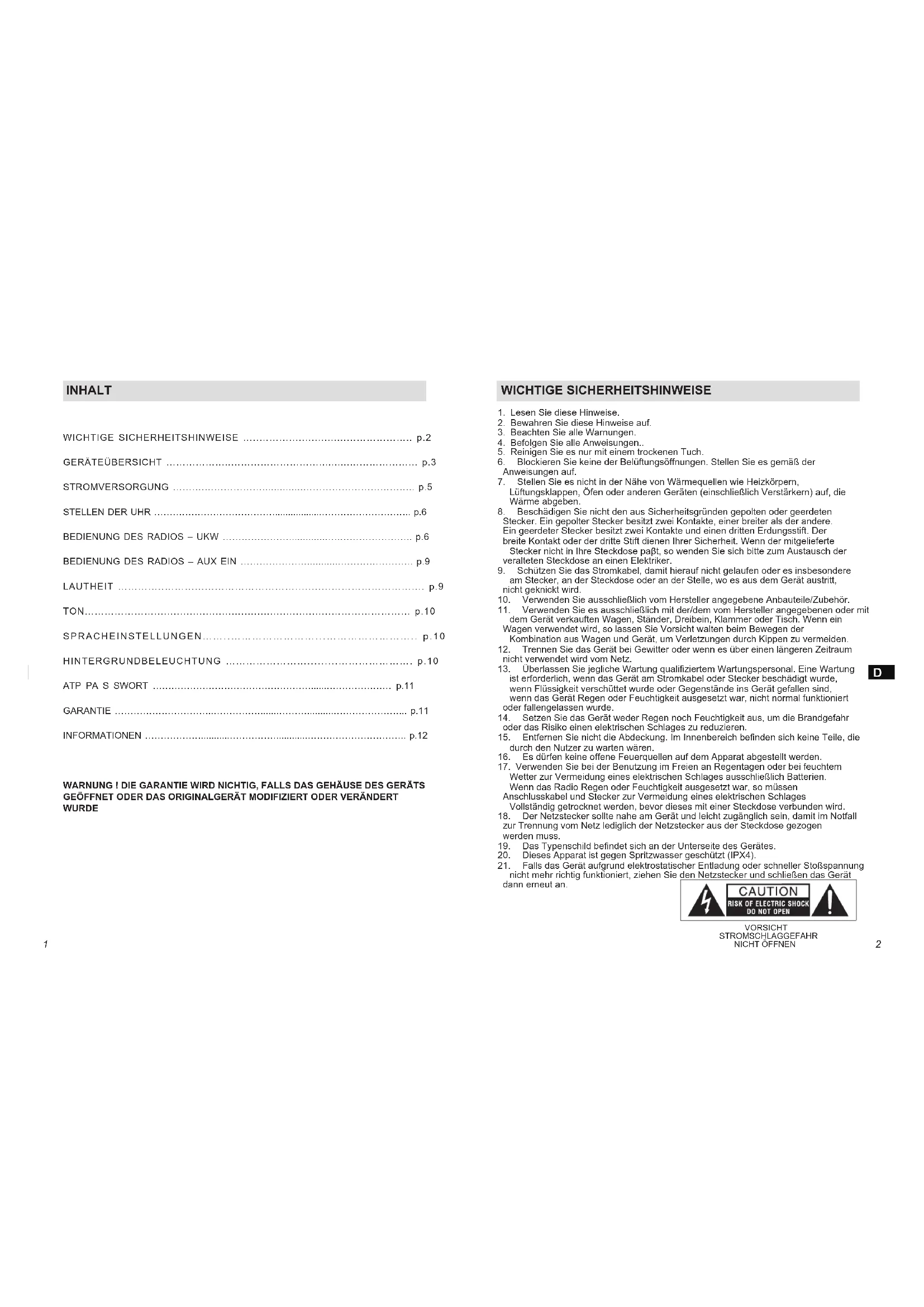 WetterzurVermeidungeineselektrischenSchlagesausschließlichBatterien. WenndasRadioRegenoderFeuchtigkeitausgesetztwar,somüssen Anschlusskabel und Stecker zur Vermeidung eines elektrischen Schlages Vollständiggetrocknetwerden,bevordiesesmiteinerSteckdoseverbundenwird.