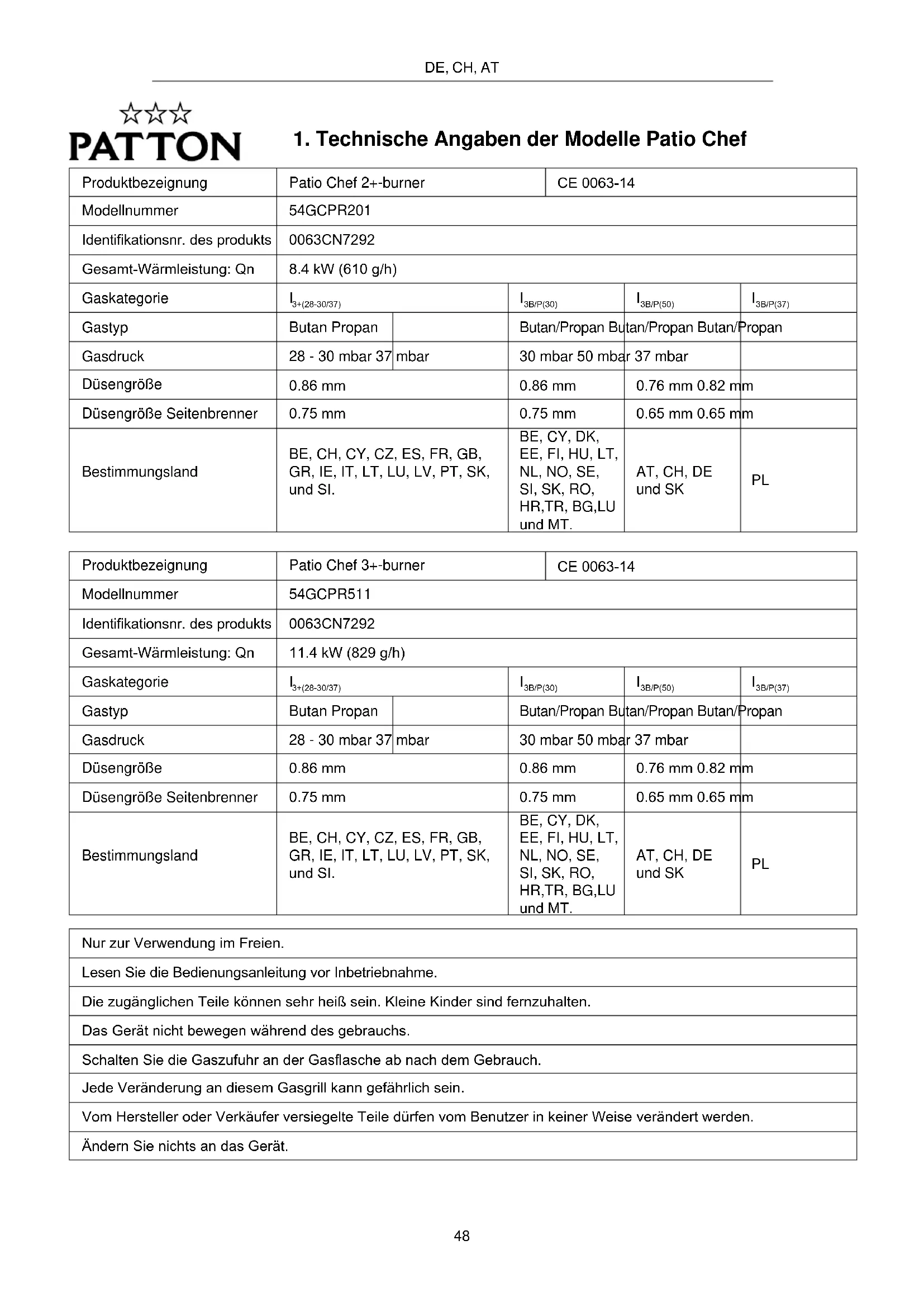Finden Sie kostenlos die Bedienungsanleitung des Geräts Patio Chef Patton als PDF.