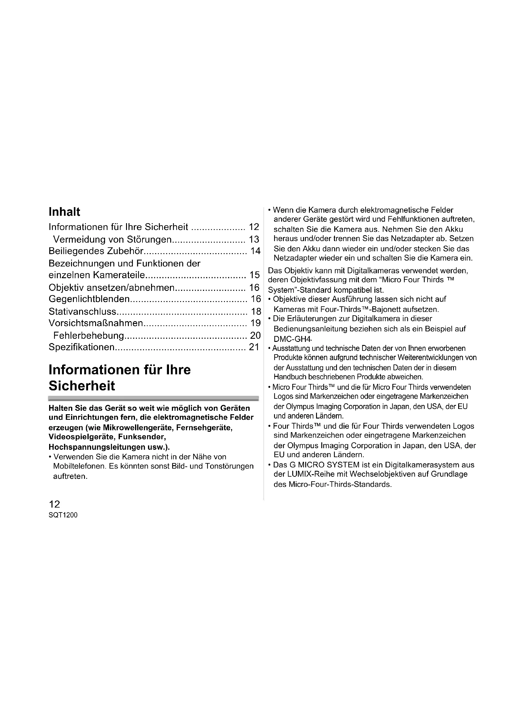 - Ausstattung und technische Daten der von Ihnen erworbenen Produkte können aufgrund technischer Weiterentwicklungen von der Ausstattung und den technischen Daten der in diesem Handbuch beschriebenen Produkte abweichen.• Micro Four Thirds™ und die für Micro Four Thirds verwendeten Logos sind Markenzeichen oder eingetragene Markenzeichen der Olympus Imaging Corporation in Japan, den USA, der EU und anderen Ländern.• Four Thirds™ und die für Four Thirds verwendeten Logos sind Markenzeichen oder eingetragene Markenzeichen der Olympus Imaging Corporation in Japan, den USA, der EU und anderen Ländern.• Das G MICRO SYSTEM ist ein Digitalkamerasystem aus der LUMIX-Reihe mit Wechselobjektiven auf Grundlage des Micro-Four-Thirds-Standards. SQT1200_E.book 12 ページ 2016年1月19日 火曜日 午前9時35分13 SQT1200