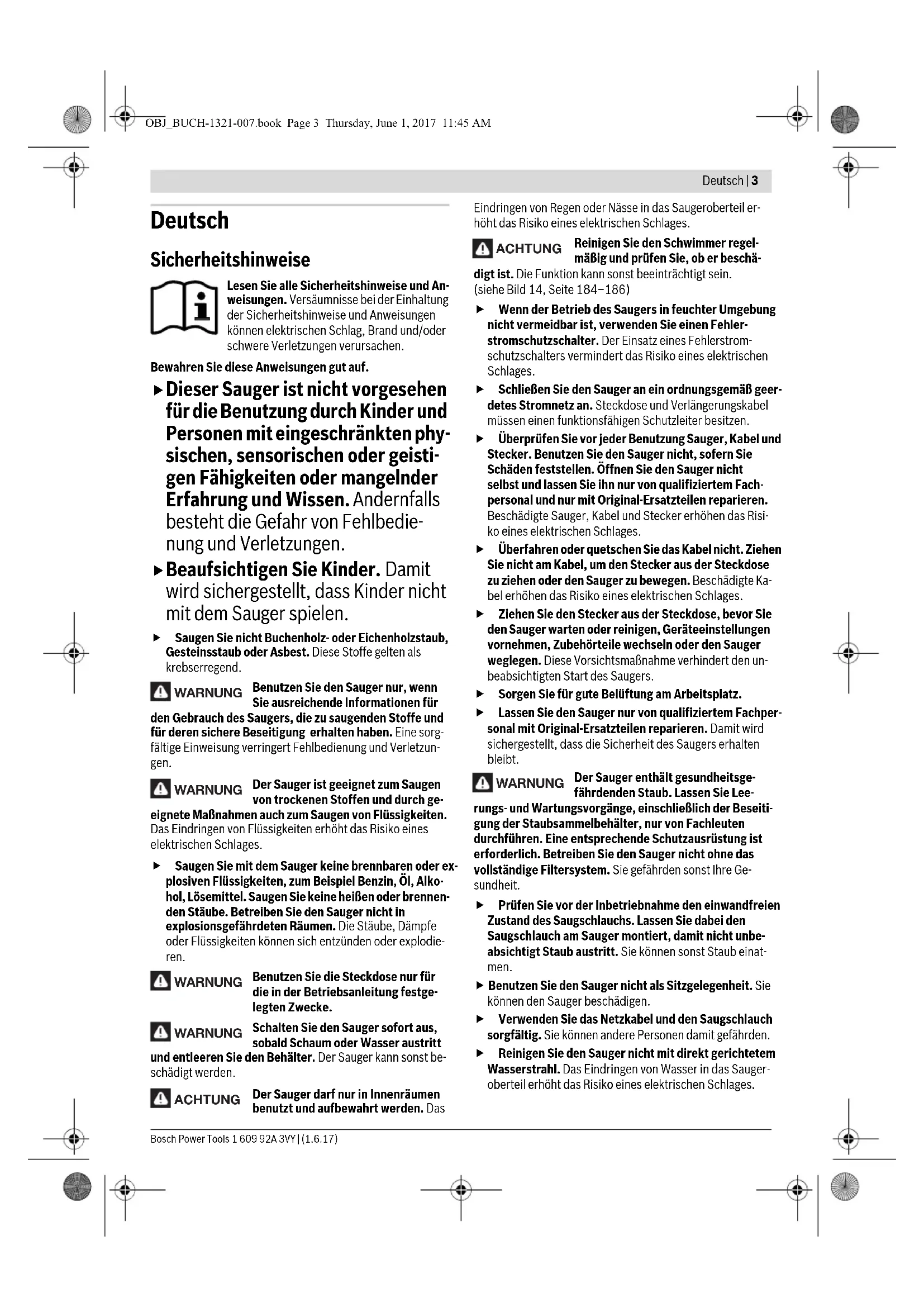 WARNUNG OBJ_BUCH-1321-007.book Page 4 Thursday, June 1, 2017 11:45 AMDeutsch | 5 Bosch Power Tools 1 609 92A 3VY | (1.6.17) Lieferumfang Allzwecksauger (siehe Bild 1) Das vollständige Zubehör finden Sie in unserem Zubehörpro- gramm. Bestimmungsgemäßer Gebrauch Der Sauger ist bestimmt zum Aufsaugen und Absaugen von nicht gesundheitsgefährdenden Stoffen und nicht brennba- ren Flüssigkeiten. Er ist geeignet für die erhöhten Beanspru- chungen bei gewerblicher Nutzung, z. B. in Handwerk, Indus- trie und Werkstätten. Sauger der Staubklasse L nach IEC/EN 60335-2-69 dürfen nur für das Aufsaugen und Absaugen von gesundheitsgefähr- denden Stäuben mit einem Expositions-Grenzwert >1mg/m