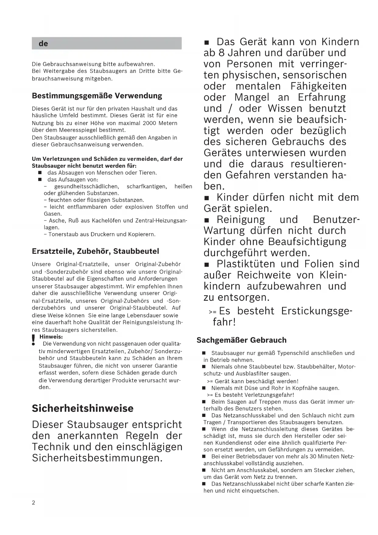 Die Gebrauchsanweisung bitte aufbewahren. Bei Weitergabe des Staubsaugers an Dritte bitte Ge- brauchsanweisung mitgeben. Bestimmungsgemäße Verwendung Dieses Gerät ist nur für den privaten Haushalt und das häusliche Umfeld bestimmt. Dieses Gerät ist für eine Nutzung bis zu einer Höhe von maximal 2000 Metern über dem Meeresspiegel bestimmt. Den Staubsauger ausschließlich gemäß den Angaben in dieser Gebrauchsanweisung verwenden. Um Verletzungen und Schäden zu vermeiden, darf der Staubsauger nicht benutzt werden für: das Absaugen von Menschen oder Tieren. das Aufsaugen von: − gesundheitsschädlichen, scharfkantigen, heißen oder glühenden Substanzen. − feuchten oder flüssigen Substanzen. − leicht entflammbaren oder explosiven Stoffen und Gasen. − Asche, Ruß aus Kachelöfen und Zentral-Heizungsan- lagen. − Tonerstaub aus Druckern und Kopierern. Ersatzteile, Zubehör, Staubbeutel Unsere Original-Ersatzteile, unser Original-Zubehör und -Sonderzubehör sind ebenso wie unsere Original- Staubbeutel auf die Eigenschaften und Anforderungen unserer Staubsauger abgestimmt. Wir empfehlen Ihnen daher die ausschließliche Verwendung unserer Origi- nal-Ersatzteile, unseres Original-Zubehörs und -Son- derzubehörs und unserer Original-Staubbeutel. Auf diese Weise können Sie eine lange Lebensdauer sowie eine dauerhaft hohe Qualität der Reinigungsleistung Ih- res Staubsaugers sicherstellen.
