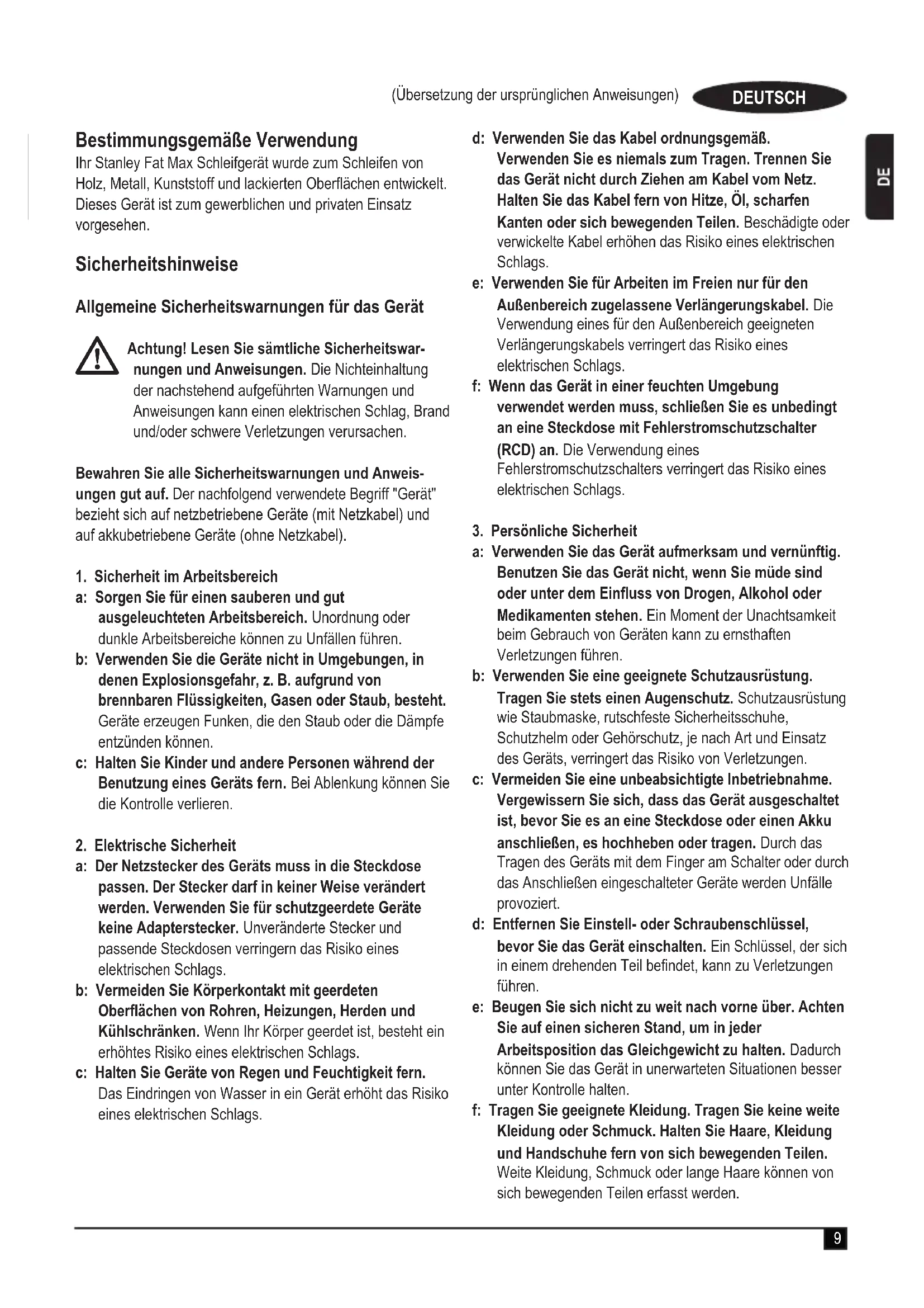 u Bringen Sie den Staubbeutel (7) über der Staubabsaugöff- nung (4) an. u Ziehen Sie den Staubbeutel zum Entfernen von der Staubabsaugöffnung ab. Anschließen eines Staubsaugers (Abb. D) u Führen Sie den Staubsaugerschlauch (8) in die Staubab- saugöffnung (4) ein. Gebrauch Achtung! Beschleunigen Sie den Arbeitsvorgang nicht mit Gewalt. Vermeiden Sie eine Überlastung des Geräts. Geschwindigkeitsregler Mit dem Geschwindigkeitsregler können Sie die Bandlaufge- schwindigkeit dem Material des Werkstücks anpassen. u Stellen Sie den Regler (3) auf die gewünschte Einstellung. Wählen Sie eine hohe Geschwindigkeit für Holz, eine mit- tlere Geschwindigkeit für Furnier und Kunststoff und eine niedrige Geschwindigkeit für Acrylglas, Buntmetall und zum Entfernen von Farbe. Ein- und Ausschalten u Drücken Sie zum Einschalten des Geräts den Ein-/Auss- chalter (1). u Für das Arbeiten im Dauerbetrieb drücken Sie den Fest- stellknopf (2) und lassen den Ein-/Ausschalter los. u Lassen Sie zum Ausschalten des Gerätes den Ein-/ Ausschalter los. Wenn sich das Gerät im Dauerbetrieb be- ndet, müssen Sie zum Ausschalten den Ein-/Ausschalter zweimal drücken. Automatisches Bremssystem Diese Funktion schränkt die Drehzahl der Scheibe ein, solange das Werkzeug das Werkstück nicht berührt. Sobald das Werkzeug auf dem Werkstück platziert wird, erreicht die Scheibe ihre normale Betriebsdrehzahl. Entleeren des Staubbeutels Der Staubbeutel muss während des Betriebs alle 10 Minuten entleert werden. u Schütteln Sie den Staubbeutel, um ihn zu entleeren. Hinweise für optimale Arbeitsergebnisse (Abb. E) u Üben Sie keinen zu großen Druck auf das Gerät aus. u Überprüfen Sie regelmäßig den Zustand des Schleifblatts. Tauschen Sie es bei Bedarf aus. u Schleifen Sie immer in Richtung der Holzmaserung. u Verwenden Sie zum Schleifen frischer Farbschichten vor dem Auftragen weiterer Schichten sehr feines Schleif- papier. u Auf sehr unebenen Oberächen sowie zum Entfernen alter Farbschichten verwenden Sie zunächst grobes Schleifpapier. Auf anderen Oberächen verwenden Sie zunächst mittelgrobes Schleifpapier. Wechseln Sie in beiden Fällen nach einiger Zeit zu feinem Schleifpapier, damit Sie eine glatte Oberäche erhalten. u Weitere Informationen über Zubehör erhalten Sie bei Ihrem Händler. Zubehörteile Das verwendete Zubehör hat wesentlichen Einuss auf die Leistung des Geräts. Zubehörteile von Stanley Fat Max erfüllen höchste Qualitätsstandards und wurden speziell für die Verwendung mit Ihrem Gerät entwickelt. Bei Verwendung dieses Zubehörs erhalten Sie stets optimale Ergebnisse. Wartung Ihr Gerät wurde im Hinblick auf eine lange Lebensdauer und einen möglichst geringen Wartungsaufwand entwickelt. Ein dauerhafter, einwandfreier Betrieb setzt eine regelmäßige Pege und Reinigung voraus. Achtung! Schalten Sie das Gerät vor der Durchführung von Pege-, Reinigungs- und Wartungsarbeiten aus, und ziehen Sie den Netzstecker. u Reinigen Sie regelmäßig die Lüftungsschlitze des Geräts mit Hilfe einer weichen Bürste oder eines trockenen Tuchs. u Reinigen Sie das Motorgehäuse regelmäßig mit einem feuchten Tuch. Verwenden Sie keine scheuernden Reini- gungsmittel oder Reinigungsmittel auf Lösungsmittelbasis.13 (Übersetzung der ursprünglichen Anweisungen) DEUTSCH Austauschen des Netzsteckers (nur Großbritannien und Irland) Gehen Sie folgendermaßen vor, wenn ein neuer Netzstecker angebracht werden muss: u Entsorgen Sie den alten Stecker auf sachgerechte Weise.u Verbinden Sie die braune Leitung mit dem spannungs- führenden Anschluss des Steckers. u Verbinden Sie die blaue Leitung mit dem neutralen Anschluss. Achtung! Der Erdleiter wird nicht angeschlossen. Befolgen Sie die Anleitungen, die dem Stecker beiliegen. Empfohlene Sicherung: 5 A. Umweltschutz