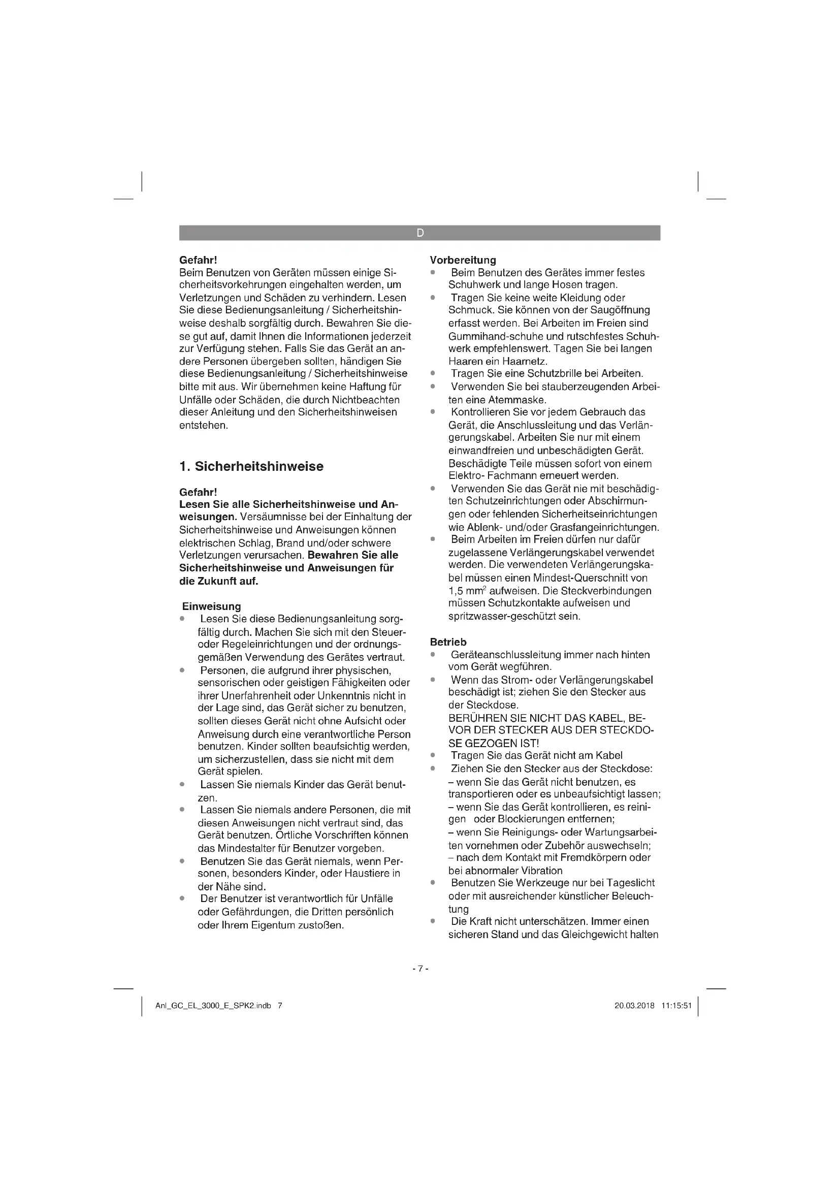 Die Kraft nicht unterschätzen. Immer einen sicheren Stand und das Gleichgewicht halten Anl_GC_EL_3000_E_SPK2.indb 7Anl_GC_EL_3000_E_SPK2.indb 7 20.03.2018 11:15:5120.03.2018 11:15:51D