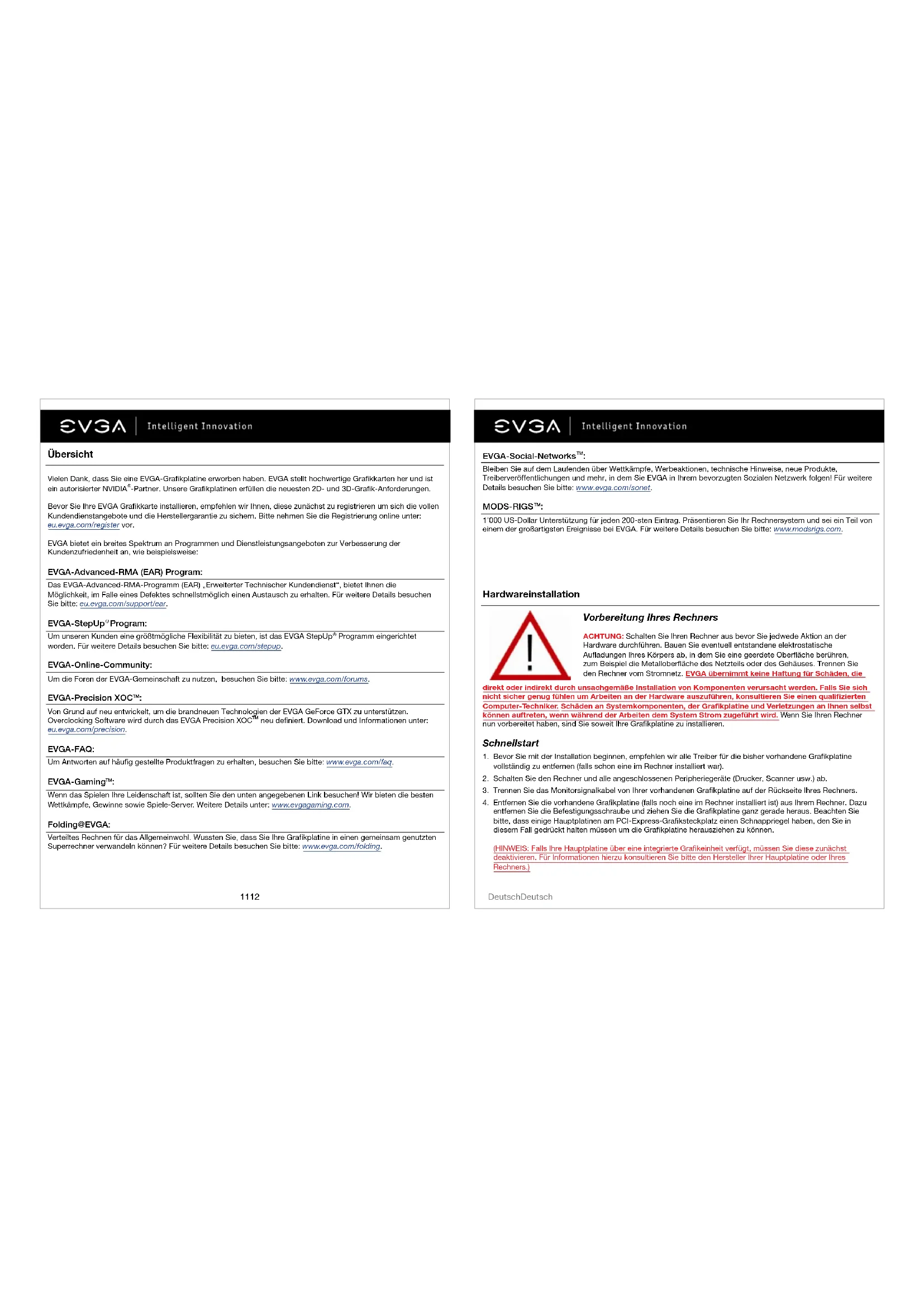 1’000 US-Dollar Unterstützung für jeden 200-sten Eintrag. Präsentieren Sie Ihr Rechnersystem und sei ein Teil von einem der großartigsten Ereignisse bei EVGA. Für weitere Details besuchen Sie bitte: www.modsrigs.com. Hardwareinstallation direkt oder indirekt durch unsachgemäße Installation von Komponenten verursacht werden. Falls Sie sich nicht sicher genug fühlen um Arbeiten an der Hardware auszuführen, konsultieren Sie einen qualifizierten Computer-Techniker. Schäden an Systemkomponenten, der Grafikplatine und Verletzungen an Ihnen selbst können auftreten, wenn während der Arbeiten dem System Strom zugeführt wird. Wenn Sie Ihren Rechner nun vorbereitet haben, sind Sie soweit Ihre Grafikplatine zu installieren. Schnellstart