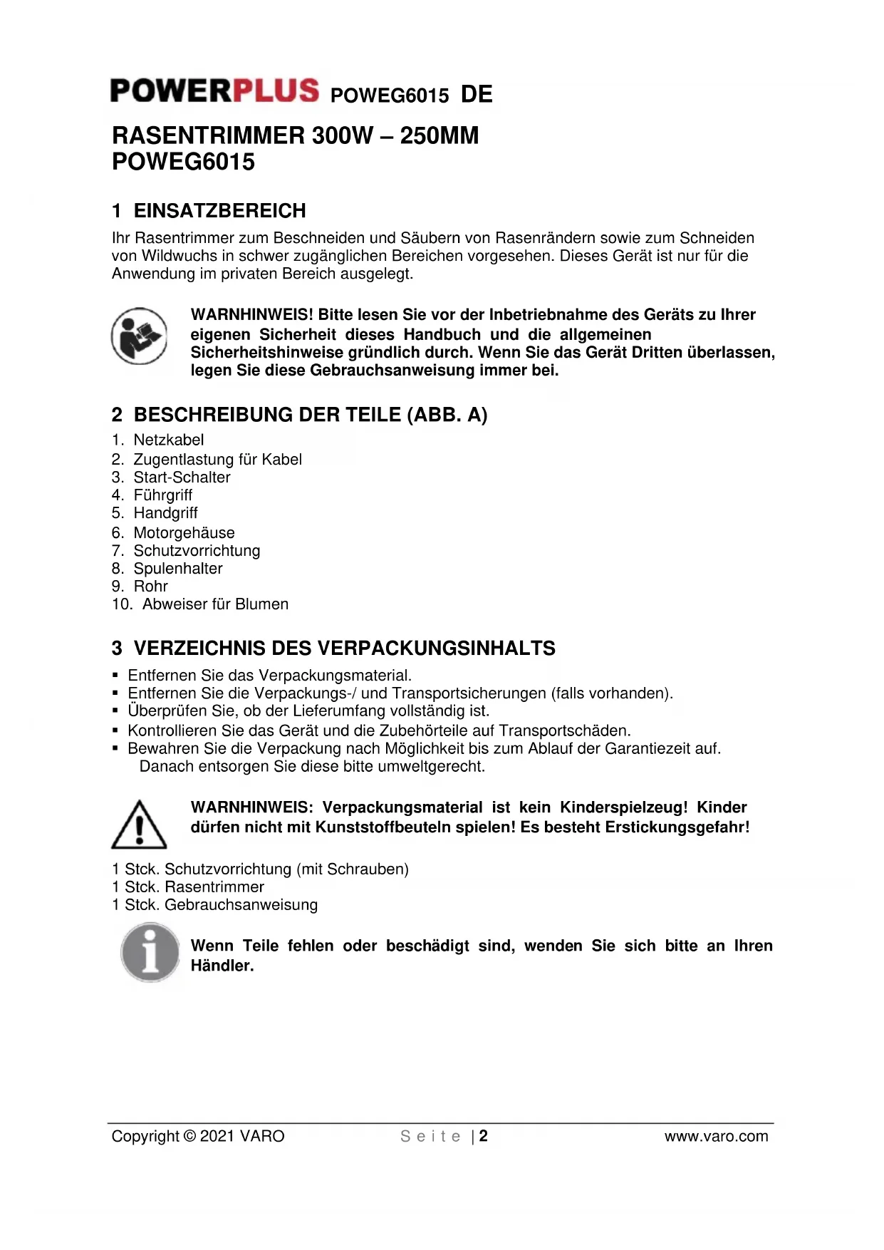 - Bewahren Sie die Verpackung nach Möglichkeit bis zum Ablauf der Garantiezeit auf. Danach entsorgen Sie diese bitte umweltgerecht. WARNHINWEIS: Verpackungsmaterial ist kein Kinderspielzeug! Kinder dürfen nicht mit Kunststoffbeuteln spielen! Es besteht Erstickungsgefahr! 1 Stck. Schutzvorrichtung (mit Schrauben) 1 Stck. Rasentrimmer 1 Stck. Gebrauchsanweisung Wenn Teile fehlen oder beschädigt sind, wenden Sie sich bitte an Ihren Händler.POWEG6015 DE Copyright © 2021 VARO S e i t e | 3 www.varo.com