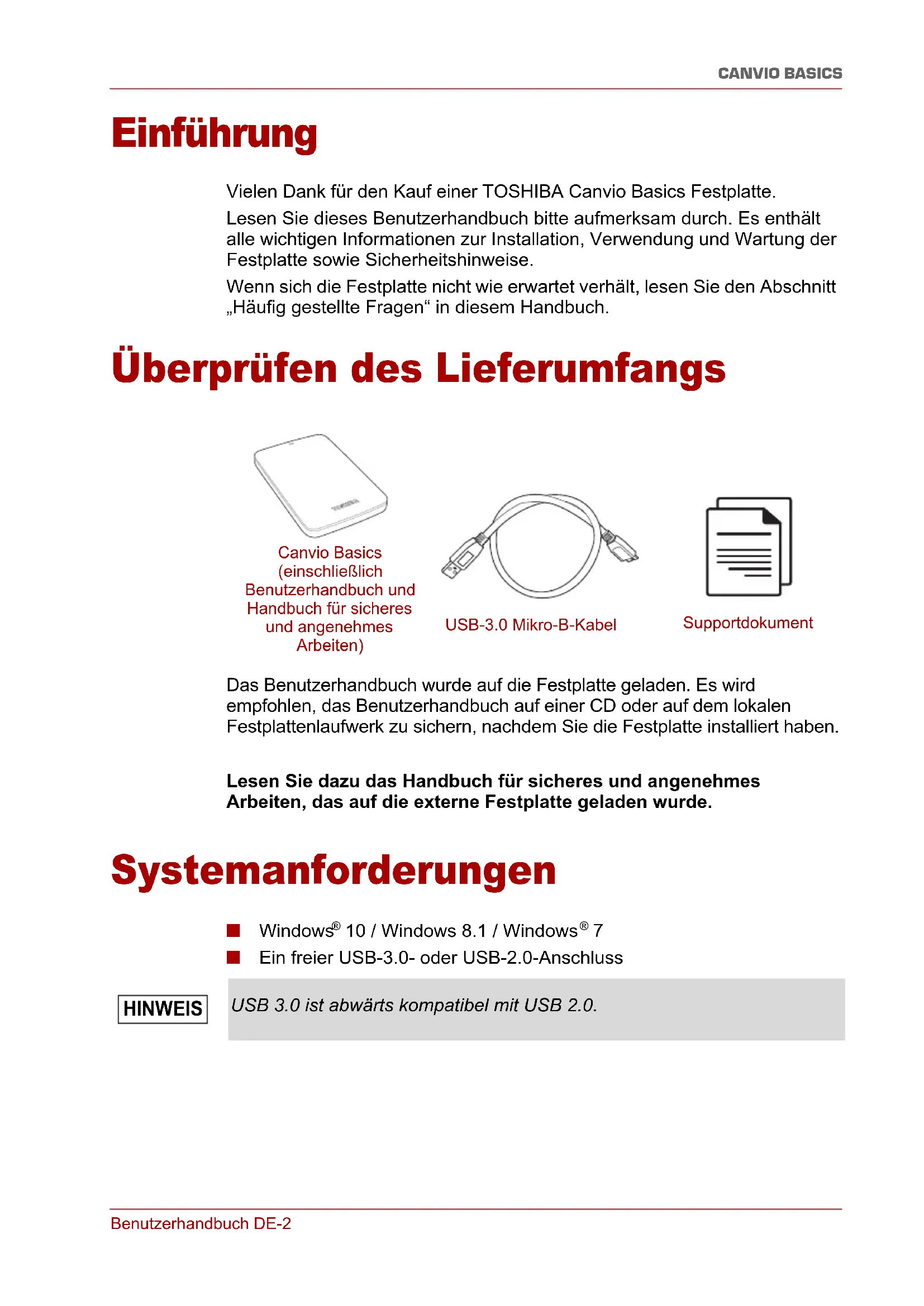 - Zulassungsbestimmungen Benutzerhandbuch DE-2 CANVIO BASICS Einführung Vielen Dank für den Kauf einer TOSHIBA Canvio Basics Festplatte. Lesen Sie dieses Benutzerhandbuch bitte aufmerksam durch. Es enthält alle wichtigen Informationen zur Installation, Verwendung und Wartung der Festplatte sowie Sicherheitshinweise. Wenn sich die Festplatte nicht wie erwartet verhält, lesen Sie den Abschnitt „Häufig gestellte Fragen“ in diesem Handbuch. Überprüfen des Lieferumfangs Das Benutzerhandbuch wurde auf die Festplatte geladen. Es wird empfohlen, das Benutzerhandbuch auf einer CD oder auf dem lokalen Festplattenlaufwerk zu sichern, nachdem Sie die Festplatte installiert haben. Lesen Sie dazu das Handbuch für sicheres und angenehmes Arbeiten, das auf die externe Festplatte geladen wurde. Systemanforderungen ■ Windows p. 7