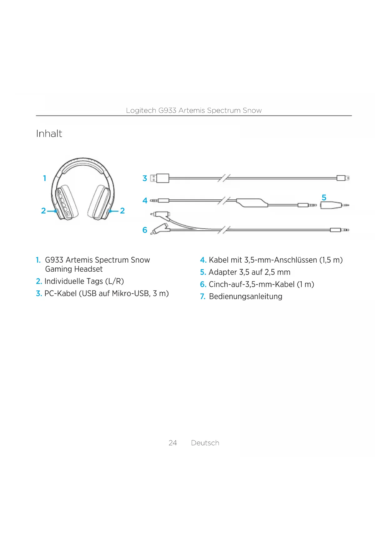 3Logitech G933 Artemis Spectrum Snow 33 Deutsch Einrichten für PC (3,5-mm-Anschluss) Das G933-Headset lässt sich auch über eine 3,5-mm-Kabel-Verbindung allein mit Audiogeräten nutzen.