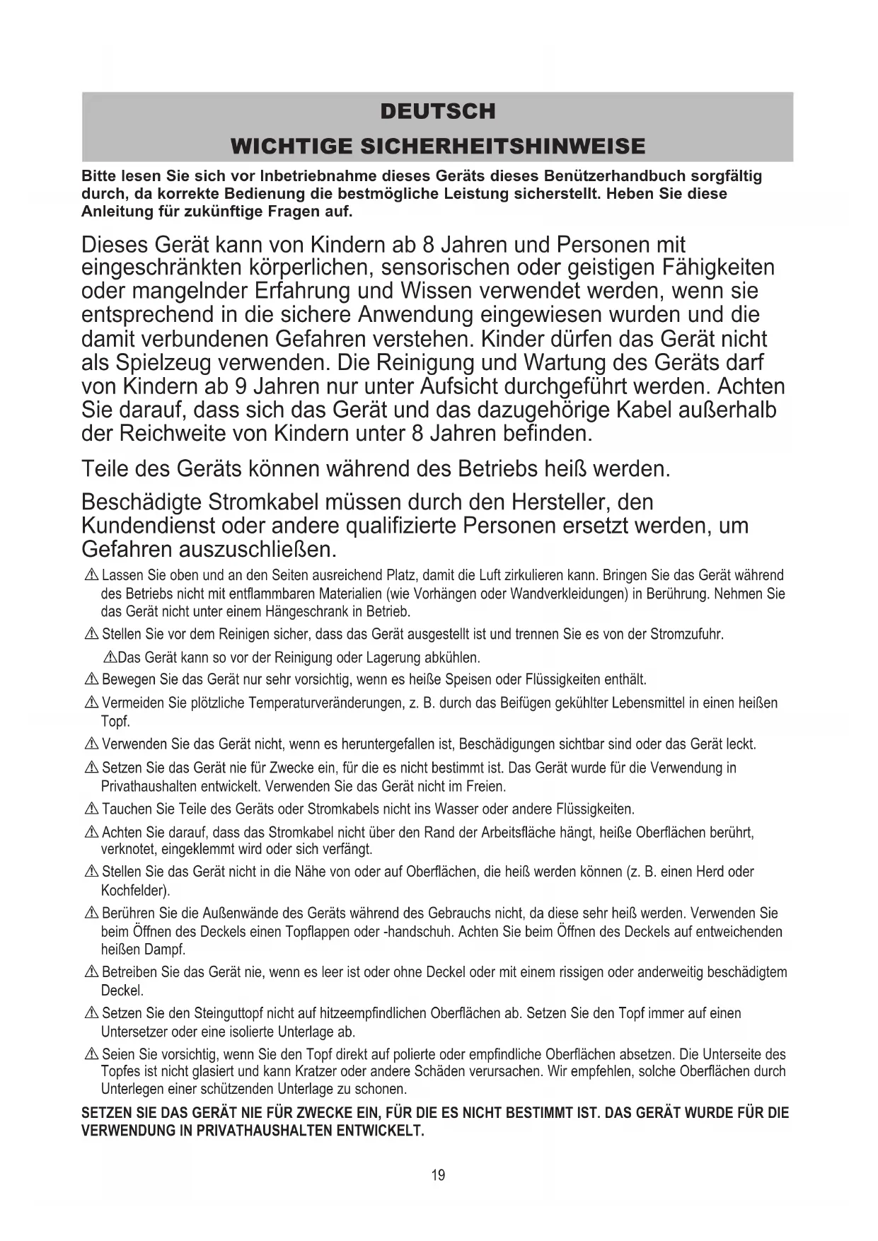 - l’appareil n’ait pas été altéré de quelque manière que ce soit ou endommagé, utilisé incorrectement ou abusivement, ou bien réparé ou altéré par une personne autre qu’une personne agréée par JCS (Europe) Products Europe. Cette garantie ne couvre pas les défauts liés à une utilisation incorrecte, un dommage, une utilisation abusive, l’emploi d’une tension incorrecte, les catastrophes naturelles, les événements hors du contrôle de JCS (Europe), une réparation ou une altération par une personne autre qu’une personne agréée par JCS (Europe) ou le non-respect des instructions d’utilisation. De plus, cette garantie ne couvre pas non plus l’usure normale, y compris, mais sans limitation, les petites décolorations et éraflures. Cette garantie s’applique uniquement à l’acheteur d’origine et elle n’étend aucun droit à toute personne acquérant l’appareil pour un usage commercial ou communal. Si votre appareil est accompagné d’une garantie locale ou d’une carte de garantie, veuillez en consulter les dispositions et conditions en vigueur, ou vous adresser à votre revendeur local pour en savoir plus. Cette marque indique que ce produit ne devrait pas être jeté avec les ordures ménagères, mais séparément partout à travers l’UE. Afin de prévenir tout dommage potentiel à la santé humaine ou à l’environnement par l’évacuation non contrôlée des déchets en raison de la présence de substances dangereuses dans le produit, recycler l’appareil de manière responsable afin de promouvoir la réutilisation durable des matériaux et des ressources. Pour retourner votre produit usagé, veuillez utiliser les systèmes de retour et de cueillette offerts à l’endroit où vous avez acheté le produit. Ils sont en mesure de reprendre votre produit afin de le recycler sans danger pour l’environnement. Jarden Consumer Solutions (Europe) Limited 5400 Lakeside Cheadle Royal Business Park Cheadle SK8 3GQ UK19 DEUTSCH WICHTIGE SICHERHEITSHINWEISE Bitte lesen Sie sich vor Inbetriebnahme dieses Geräts dieses Benützerhandbuch sorgfältig durch, da korrekte Bedienung die bestmögliche Leistung sicherstellt. Heben Sie diese Anleitung für zukünftige Fragen auf. DiesesGerätkannvonKindernab8JahrenundPersonenmit eingeschränkten körperlichen, sensorischen oder geistigen Fähigkeiten oder mangelnder Erfahrung und Wissen verwendet werden, wenn sie entsprechend in die sichere Anwendung eingewiesen wurden und die damitverbundenenGefahrenverstehen.KinderdürfendasGerätnicht alsSpielzeugverwenden.DieReinigungundWartungdesGerätsdarf vonKindernab9JahrennurunterAufsichtdurchgeführtwerden.Achten Siedarauf,dasssichdasGerätunddasdazugehörigeKabelaußerhalb derReichweitevonKindernunter8Jahrenbefinden. TeiledesGerätskönnenwährenddesBetriebsheißwerden. BeschädigteStromkabelmüssendurchdenHersteller,den KundendienstoderanderequalifiziertePersonenersetztwerden,um Gefahrenauszuschließen. ! Lassen Sie oben und an den Seiten ausreichend Platz, damit die Luft zirkulieren kann. Bringen Sie das Gerät während des Betriebs nicht mit entflammbaren Materialien (wie Vorhängen oder Wandverkleidungen) in Berührung. Nehmen Sie das Gerät nicht unter einem Hängeschrank in Betrieb. ! Stellen Sie vor dem Reinigen sicher, dass das Gerät ausgestellt ist und trennen Sie es von der Stromzufuhr. ! Das Gerät kann so vor der Reinigung oder Lagerung abkühlen. ! Bewegen Sie das Gerät nur sehr vorsichtig, wenn es heiße Speisen oder Flüssigkeiten enthält. ! Vermeiden Sie plötzliche Temperaturveränderungen, z. B. durch das Beifügen gekühlter Lebensmittel in einen heißen Topf. ! Verwenden Sie das Gerät nicht, wenn es heruntergefallen ist, Beschädigungen sichtbar sind oder das Gerät leckt. ! Setzen Sie das Gerät nie für Zwecke ein, für die es nicht bestimmt ist. Das Gerät wurde für die Verwendung in Privathaushalten entwickelt. Verwenden Sie das Gerät nicht im Freien. ! Tauchen Sie Teile des Geräts oder Stromkabels nicht ins Wasser oder andere Flüssigkeiten. ! Achten Sie darauf, dass das Stromkabel nicht über den Rand der Arbeitsfläche hängt, heiße Oberflächen berührt, verknotet, eingeklemmt wird oder sich verfängt. ! Stellen Sie das Gerät nicht in die Nähe von oder auf Oberflächen, die heiß werden können (z. B. einen Herd oder Kochfelder). ! Berühren Sie die Außenwände des Geräts während des Gebrauchs nicht, da diese sehr heiß werden. Verwenden Sie beim Öffnen des Deckels einen Topflappen oder -handschuh. Achten Sie beim Öffnen des Deckels auf entweichenden heißen Dampf. ! Betreiben Sie das Gerät nie, wenn es leer ist oder ohne Deckel oder mit einem rissigen oder anderweitig beschädigtem Deckel. ! Setzen Sie den Steinguttopf nicht auf hitzeempfindlichen Oberflächen ab. Setzen Sie den Topf immer auf einen Untersetzer oder eine isolierte Unterlage ab. ! Seien Sie vorsichtig, wenn Sie den Topf direkt auf polierte oder empfindliche Oberflächen absetzen. Die Unterseite des Topfes ist nicht glasiert und kann Kratzer oder andere Schäden verursachen. Wir empfehlen, solche Oberflächen durch Unterlegen einer schützenden Unterlage zu schonen. SETZEN SIE DAS GERÄT NIE FÜR ZWECKE EIN, FÜR DIE ES NICHT BESTIMMT IST. DAS GERÄT WURDE FÜR DIE