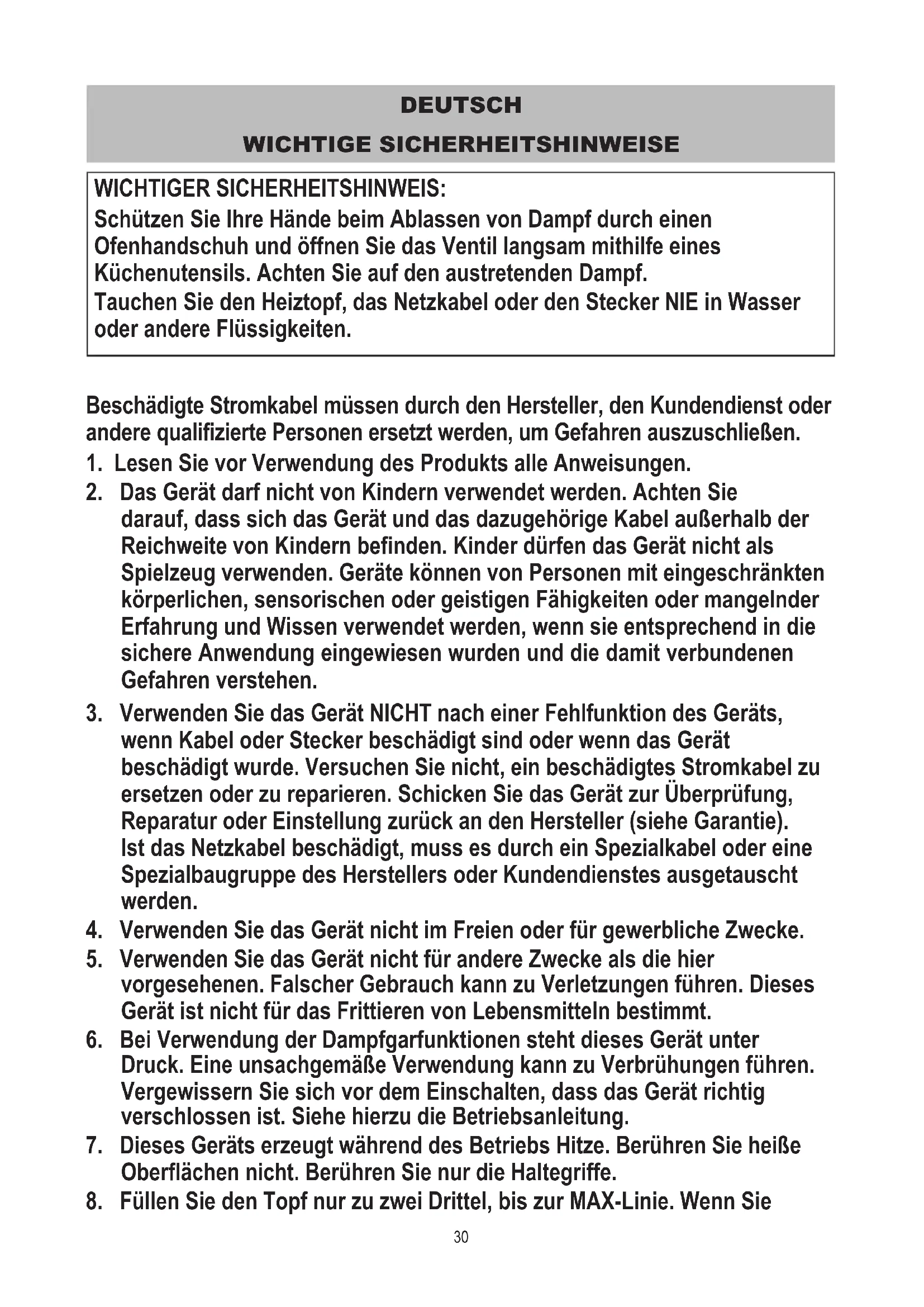 WICHTIGER SICHERHEITSHINWEIS: Schützen Sie Ihre Hände beim Ablassen von Dampf durch einen Ofenhandschuh und öffnen Sie das Ventil langsam mithilfe eines Küchenutensils. Achten Sie auf den austretenden Dampf. Tauchen Sie den Heiztopf, das Netzkabel oder den Stecker NIE in Wasser oder andere Flüssigkeiten.31 Lebensmittel zubereiten, die sich während des Garvorgangs ausdehnen, wie z. B. Reis oder getrocknetes Gemüse, füllen Sie den Topf wie empfohlen nur zur Hälfte. Wird der Topf überfüllt, kann dies dazu führen, dass das Dampfventil verstopft und sich zu viel Druck aufbaut. Befolgen Sie die Anweisungen in dieser Anleitung und in den Rezepten.