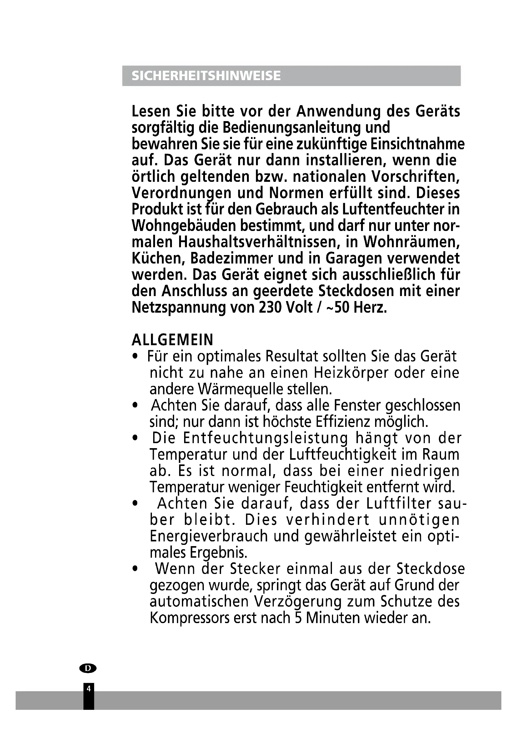 SICHERHEITSHINWEISE Lesen Sie bitte vor der Anwendung des Geräts sorgfältig die Bedienungsanleitung und bewahren Sie sie für eine zukünftige Einsichtnahme auf. Das Gerät nur dann installieren, wenn die örtlich geltenden bzw. nationalen Vorschriften, Verordnungen und Normen erfüllt sind. Dieses Produkt ist für den Gebrauch als Luftentfeuchter in Wohngebäuden bestimmt, und darf nur unter nor- malen Haushaltsverhältnissen, in Wohnräumen, Küchen, Badezimmer und in Garagen verwendet werden. Das Gerät eignet sich ausschließlich für den Anschluss an geerdete Steckdosen mit einer Netzspannung von 230 Volt / ~50 Herz. ALLGEMEIN