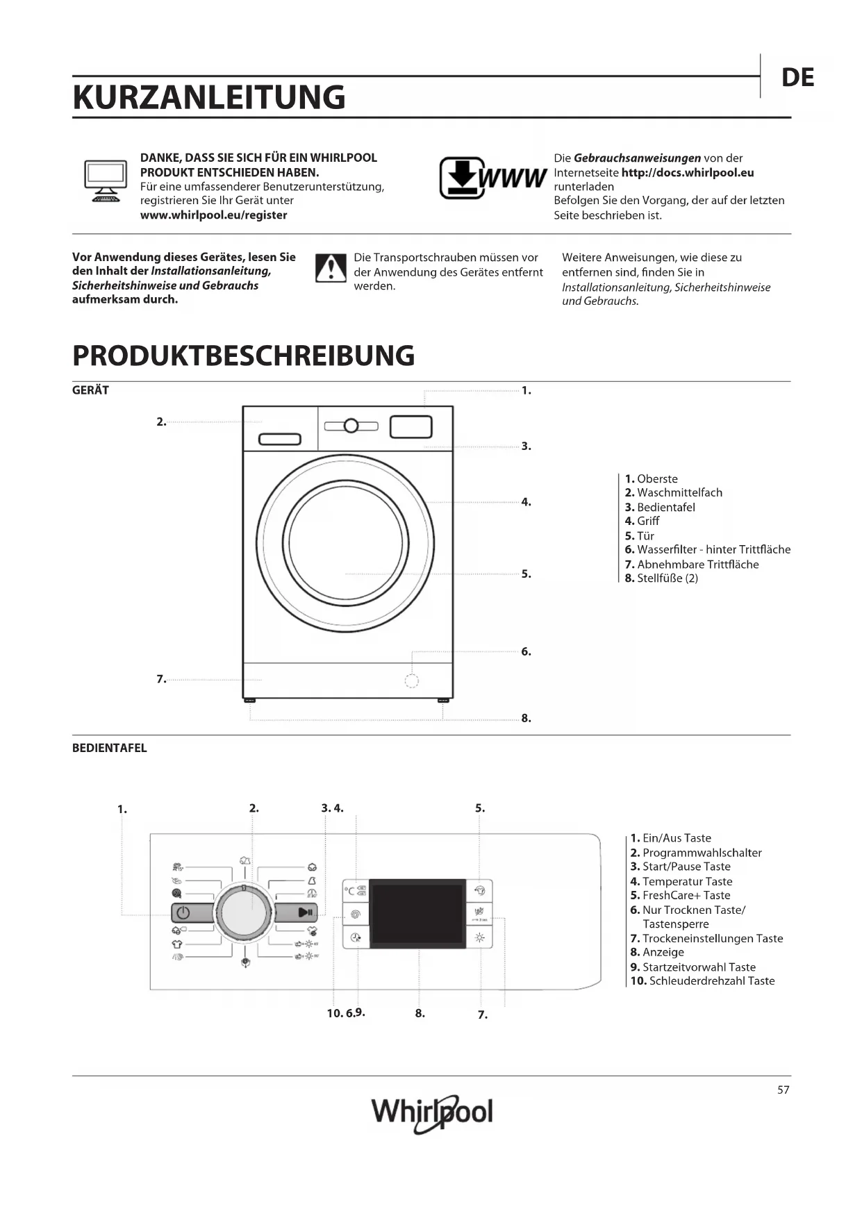 KURZANLEITUNG Vor Anwendung dieses Gerätes, lesen Sie den Inhalt der Installationsanleitung, Sicherheitshinweise und Gebrauchs aufmerksam durch. Die Transportschrauben müssen vor der Anwendung des Gerätes entfernt werden. Weitere Anweisungen, wie diese zu entfernen sind, nden Sie in Installationsanleitung, Sicherheitshinweise und Gebrauchs. DANKE, DASS SIE SICH FÜR EIN WHIRLPOOL PRODUKT ENTSCHIEDEN HABEN. Für eine umfassenderer Benutzerunterstützung, registrieren Sie Ihr Gerät unter www.whirlpool.eu/register Die Gebrauchsanweisungen von der Internetseite http://docs.whirlpool.eu runterladen Befolgen Sie den Vorgang, der auf der letzten Seite beschrieben ist. WWW PRODUKTBESCHREIBUNG BEDIENTAFEL