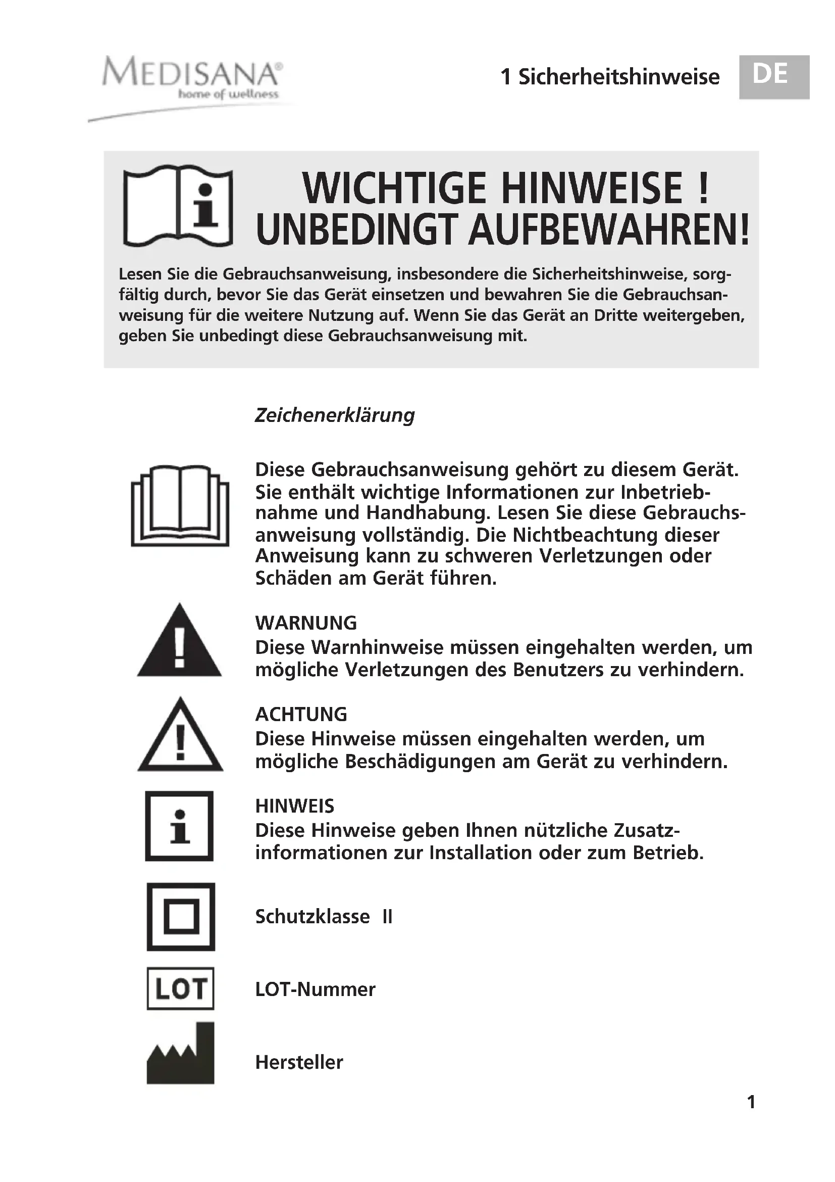 1 Sicherheitshinweise WICHTIGE HINWEISE ! UNBEDINGT AUFBEWAHREN! Diese Gebrauchsanweisung gehört zu diesem Gerät. Sie enthält wichtige Informationen zur Inbetrieb- nahme und Handhabung. Lesen Sie diese Gebrauchs- anweisung vollständig. Die Nichtbeachtung dieser Anweisung kann zu schweren Verletzungen oder Schäden am Gerät führen. WARNUNG Diese Warnhinweise müssen eingehalten werden, um mögliche Verletzungen des Benutzers zu verhindern. ACHTUNG Diese Hinweise müssen eingehalten werden, um mögliche Beschädigungen am Gerät zu verhindern. HINWEIS Diese Hinweise geben Ihnen nützliche Zusatz- informationen zur Installation oder zum Betrieb. Schutzklasse II LOT-Nummer Hersteller