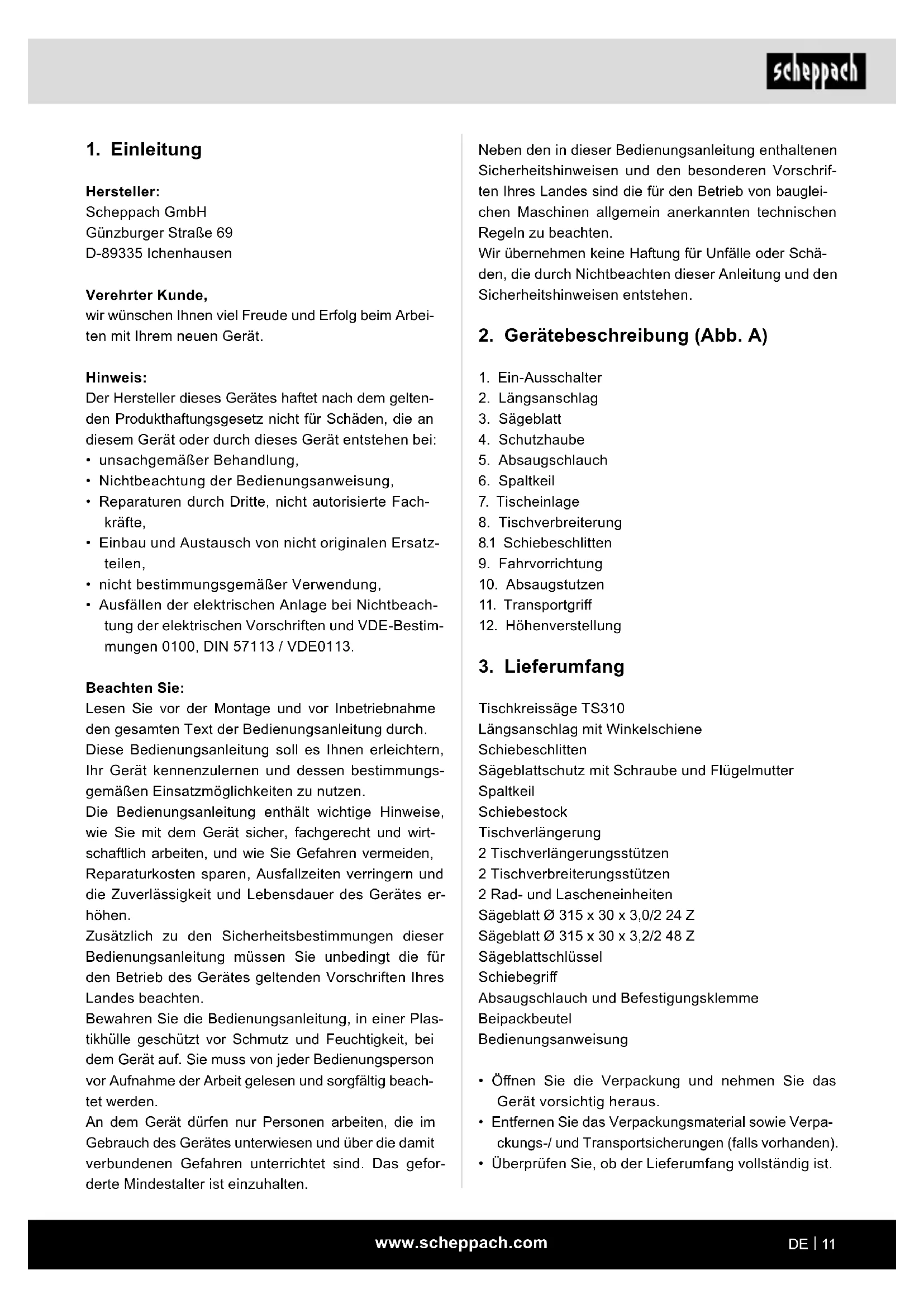 Hersteller: Scheppach GmbH Günzburger Straße 69 D-89335 Ichenhausen Verehrter Kunde, wir wünschen Ihnen viel Freude und Erfolg beim Arbei- ten mit Ihrem neuen Gerät. Hinweis: Der Hersteller dieses Gerätes haftet nach dem gelten- den Produkthaftungsgesetz nicht für Schäden, die an diesem Gerät oder durch dieses Gerät entstehen bei: