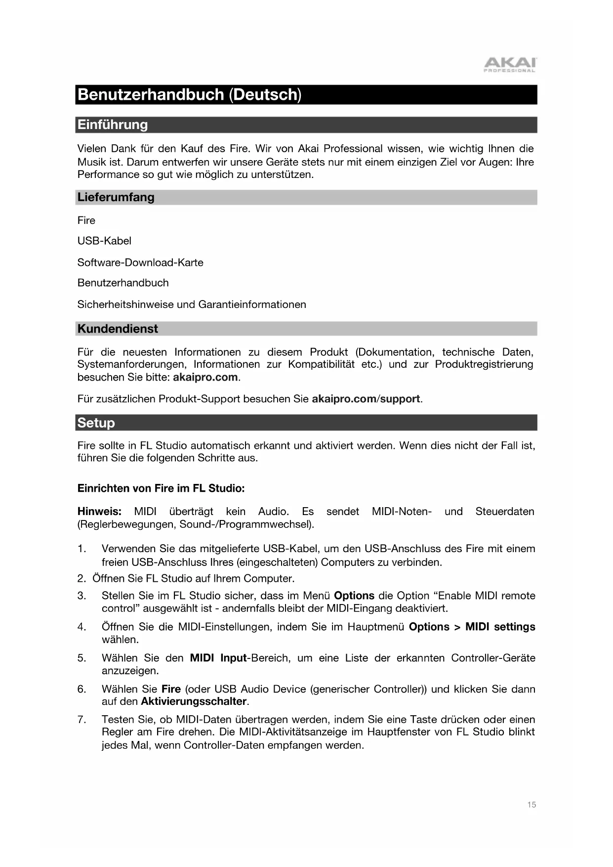 Benutzerhandbuch (Deutsch) Einführung Vielen Dank für den Kauf des Fire. Wir von Akai Professional wissen, wie wichtig Ihnen die Musik ist. Darum entwerfen wir unsere Geräte stets nur mit einem einzigen Ziel vor Augen: Ihre Performance so gut wie möglich zu unterstützen. Lieferumfang Fire USB-Kabel Software-Download-Karte Benutzerhandbuch Sicherheitshinweise und Garantieinformationen Kundendienst Für die neuesten Informationen zu diesem Produkt (Dokumentation, technische Daten, Systemanforderungen, Informationen zur Kompatibilität etc.) und zur Produktregistrierung besuchen Sie bitte: akaipro.com. Für zusätzlichen Produkt-Support besuchen Sie akaipro.com/support. Setup Fire sollte in FL Studio automatisch erkannt und aktiviert werden. Wenn dies nicht der Fall ist, führen Sie die folgenden Schritte aus.
