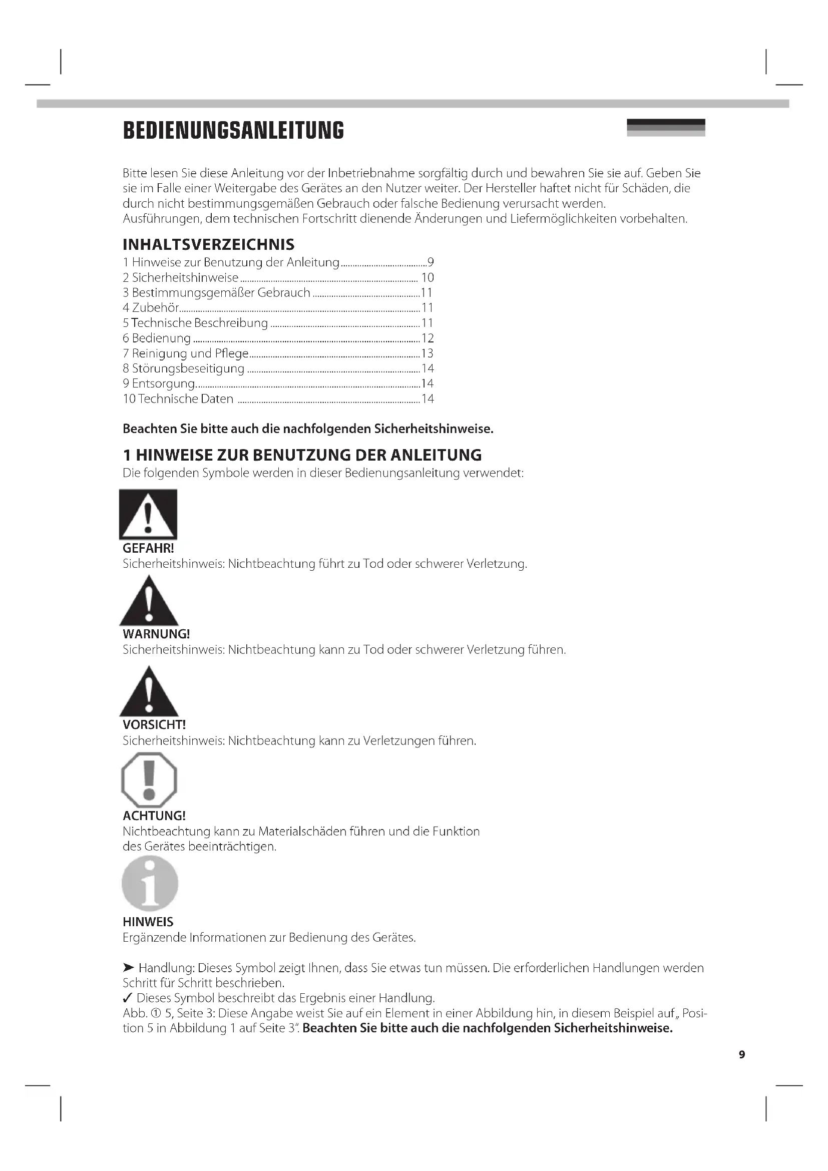 - BEDIENUNGSANLEITUNG Bitte lesen Sie diese Anleitung vor der Inbetriebnahme sorgfältig durch und bewahren Sie sie auf. Geben Sie sie im Falle einer Weitergabe des Gerätes an den Nutzer weiter. Der Hersteller haftet nicht für Schäden, die durch nicht bestimmungsgemäßen Gebrauch oder falsche Bedienung verursacht werden. Ausführungen, dem technischen Fortschritt dienende Änderungen und Liefermöglichkeiten vorbehalten. INHALTSVERZEICHNIS 1 Hinweise zur Benutzung der Anleitung p. 9