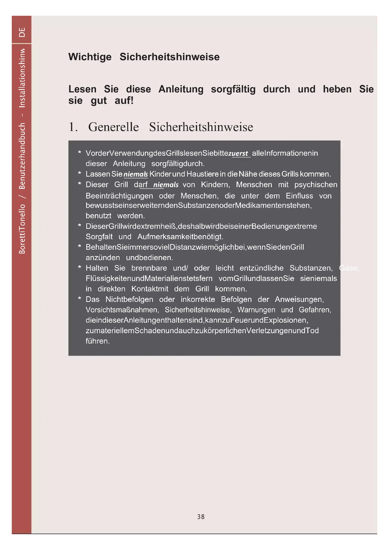 BorettiTonello / Benutzerhandbuch – Installationshinweise DE* Warnhinweis! DieserGrillwirdsehrheiß.Er solltewährendderVerwendungnichtbewegt werden.