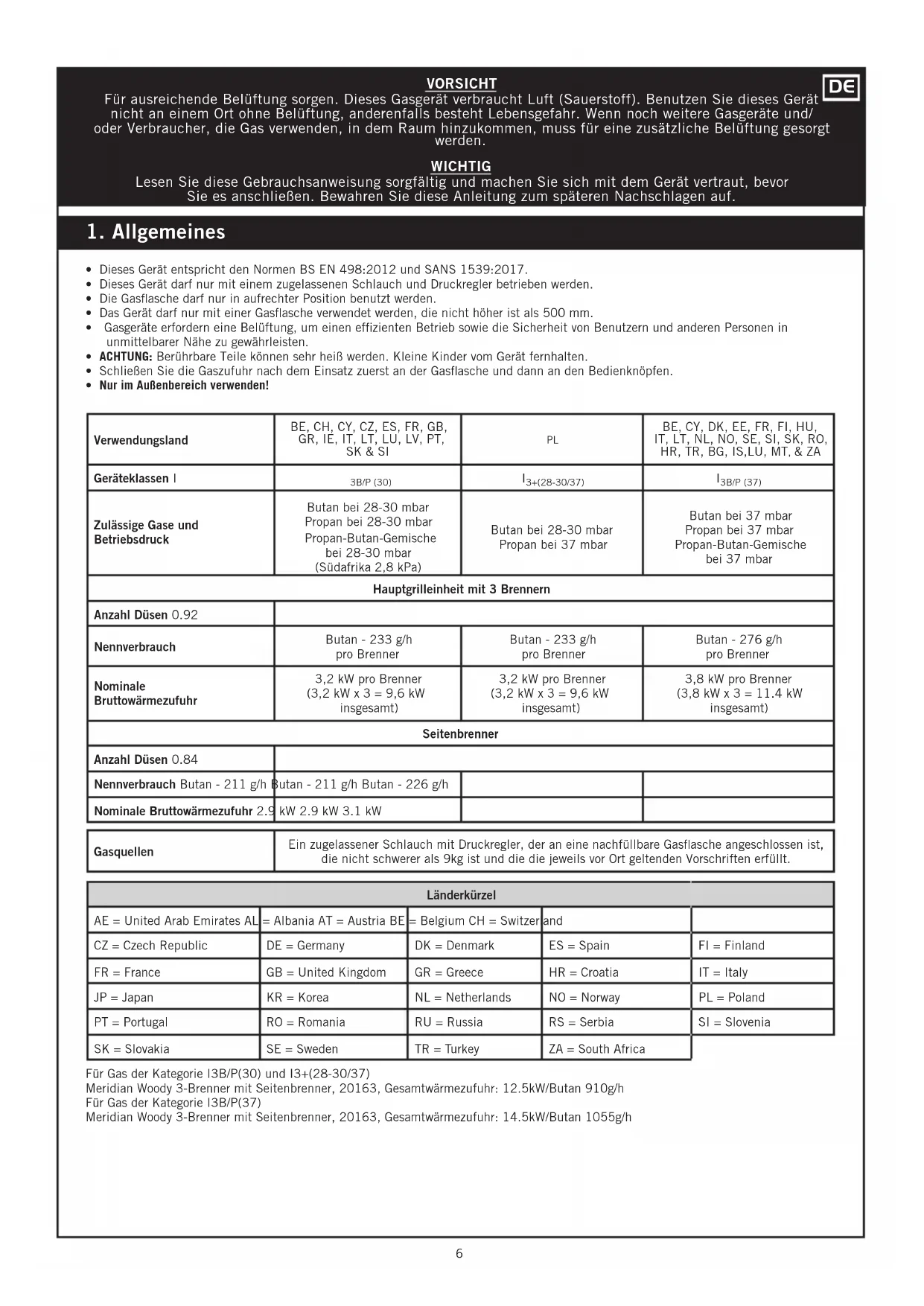 BE, CY, DK, EE, FR, FI, HU, IT, LT, NL, NO, SE, SI, SK, RO, HR, TR, BG, IS,LU, MT, & ZA Geräteklassen I 3B/P (30) 3+(28-30/37) 3B/P (37) Zulässige Gase und Betriebsdruck Butan bei 28-30 mbar Propan bei 28-30 mbar Propan-Butan-Gemische bei 28-30 mbar (Südafrika 2,8 kPa) Butan bei 28-30 mbar Propan bei 37 mbar Butan bei 37 mbar Propan bei 37 mbar Propan-Butan-Gemische bei 37 mbar Hauptgrilleinheit mit 3 Brennern Anzahl Düsen 0.92 Nennverbrauch Butan - 233 g/h pro Brenner Butan - 233 g/h pro Brenner Butan - 276 g/h pro Brenner Nominale Bruttowärmezufuhr 3,2 kW pro Brenner (3,2 kW x 3 = 9,6 kW insgesamt) 3,2 kW pro Brenner (3,2 kW x 3 = 9,6 kW insgesamt) 3,8 kW pro Brenner (3,8 kW x 3 = 11.4 kW insgesamt) Seitenbrenner Anzahl Düsen 0.84 Nennverbrauch Butan - 211 g/h Butan - 211 g/h Butan - 226 g/h Nominale Bruttowärmezufuhr 2.9 kW 2.9 kW 3.1 kW Länderkürzel AE = United Arab Emirates AL = Albania AT = Austria BE = Belgium CH = Switzerland CZ = Czech Republic DE = Germany DK = Denmark ES = Spain FI = Finland FR = France GB = United Kingdom GR = Greece HR = Croatia IT = Italy JP = Japan KR = Korea NL = Netherlands NO = Norway PL = Poland PT = Portugal RO = Romania RU = Russia RS = Serbia SI = Slovenia SK = Slovakia SE = Sweden TR = Turkey ZA = South Africa Für Gas der Kategorie I3B/P(30) und I3+(28-30/37) Meridian Woody 3-Brenner mit Seitenbrenner, 20163, Gesamtwärmezufuhr: 12.5kW/Butan 910g/h Für Gas der Kategorie I3B/P(37) Meridian Woody 3-Brenner mit Seitenbrenner, 20163, Gesamtwärmezufuhr: 14.5kW/Butan 1055g/h77