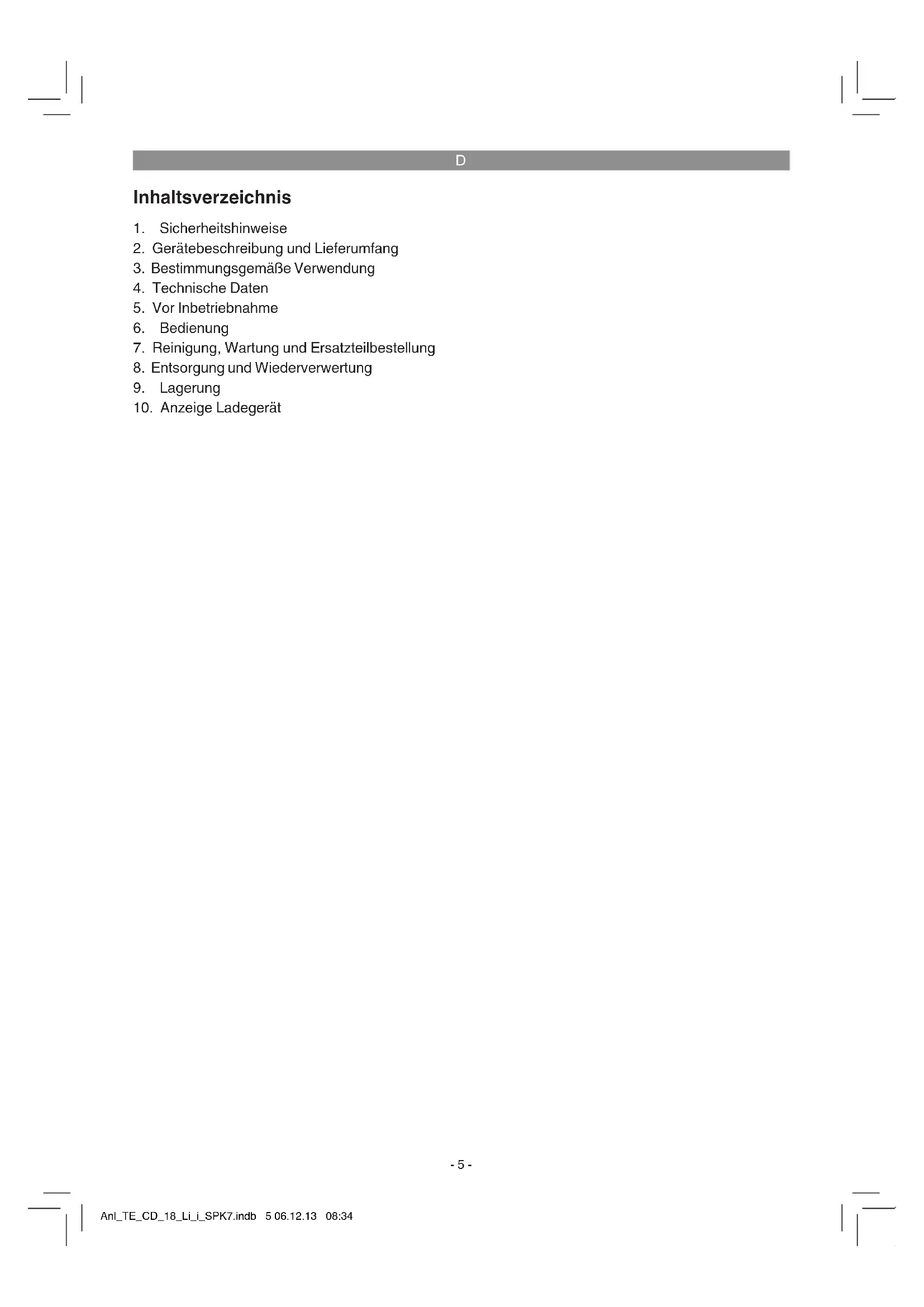 Warnung - Zur Verringerung des Verletzungsrisikos Bedienungsanleitung lesen Tragen Sie einen Gehörschutz. Die Einwirkung von Lärm kann Gehörverlust bewirken. Tragen Sie eine Schutzbrille. Während der Arbeit entstehende Funken oder aus dem Gerät heraus- tretende Splitter, Späne und Stäube können Sichtverlust bewirken. Tragen Sie eine Staubschutzmaske. Beim Bearbeiten von Holz und anderer Materialien kann ge- sundheitsschädlicher Staub entstehen. Asbesthaltiges Material darf nicht bearbeitet werden! Um eine Beschädigung des Getriebes zu vermeiden, darf die Gangumschaltung nur im Stillstand umgeschaltet werden. Lagerung der Akkus nur in trockenen Räumen mit einer Umgebungstemperatur von +10°C - +40°C. Akkus nur in geladenem Zustand lagern (mind. 40% geladen). Anl_TE_CD_18_Li_i_SPK7.indb 6 06.12.13 08:34D