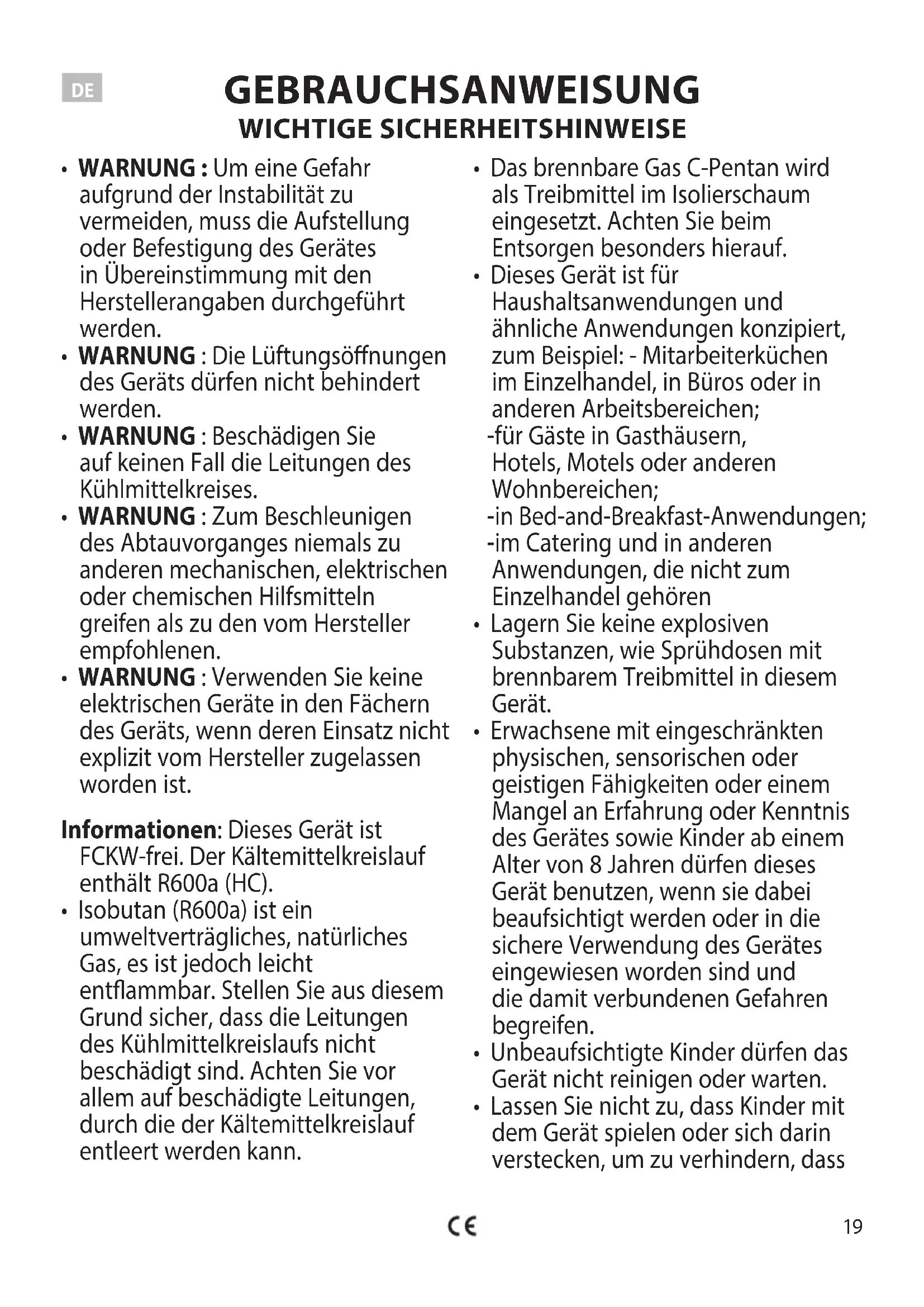 - WARNUNG : Verwenden Sie keine elektrischen Geräte in den Fächern des Geräts, wenn deren Einsatz nicht explizit vom Hersteller zugelassen worden ist. Informationen: Dieses Gerät ist FCKW-frei. Der Kältemittelkreislauf enthält R600a (HC).