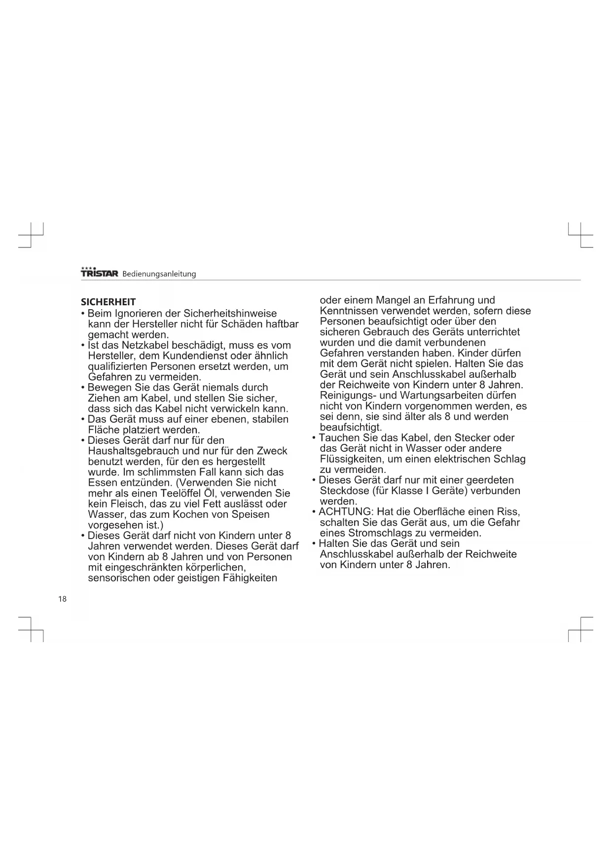 - Reinigen Sie das Gerät mit einem feuchten Tuch. Verwenden Sie niemals scharfe oder scheuernde Reiniger, Topfreiniger oder Stahlwolle. Dies würde das Gerät beschädigen. UMWELT Dieses Gerät darf am Ende seiner Lebenszeit nicht im Hausmüll entsorgt werden, sondern muss an einer Sammelstelle für das Recyceln von elektrischen und elektronischen Haushaltsgeräten abgegeben werden. Das Symbol auf dem Gerät, in der Bedienungsanleitung und auf der Verpackung macht Sie auf dieses wichtige Thema aufmerksam. Die in diesem Gerät verwendeten Materialien können recycelt werden. Durch das Recyceln gebrauchter Haushaltsgeräte leisten Sie einen wichtigen Beitrag zum Umweltschutz. Fragen Sie Ihre örtliche Behörde nach Informationen über eine Sammelstelle. Support Sämtliche verfügbaren Informationen und Ersatzteile finden Sie unter www.tristar.eu!Manual de instrucciones