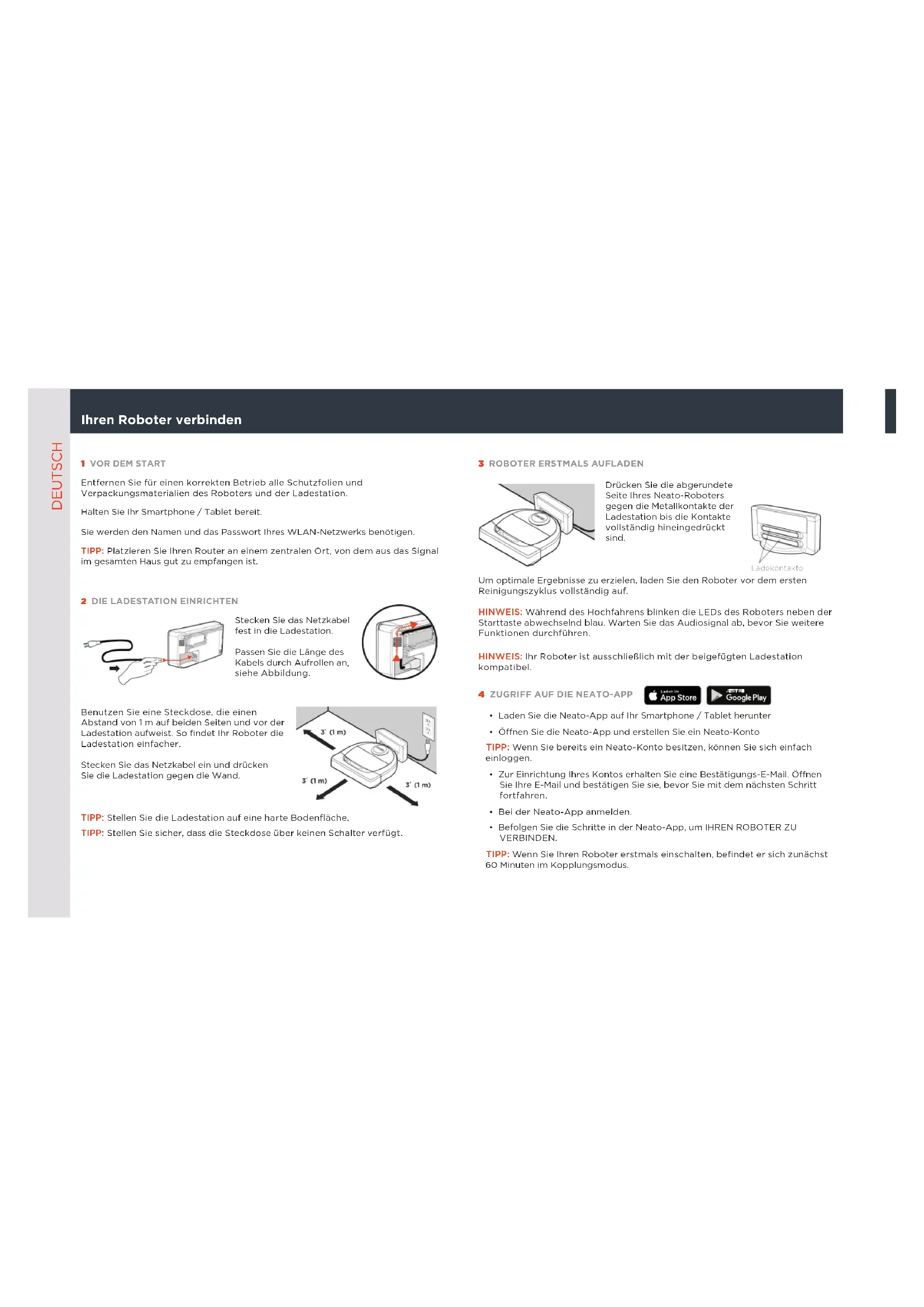 - Baterías: cada 12 o 18 meses Encontrará la guía de usuario en www.NeatoRobotics.com/UG Vea los vídeos explicativos aquí www.NeatoRobotics.com/support1 VOR DEM START Entfernen Sie für einen korrekten Betrieb alle Schutzfolien und Verpackungsmaterialien des Roboters und der Ladestation. Halten Sie Ihr Smartphone / Tablet bereit. Sie werden den Namen und das Passwort Ihres WLAN-Netzwerks benötigen. TIPP: Platzieren Sie Ihren Router an einem zentralen Ort, von dem aus das Signal im gesamten Haus gut zu empfangen ist.