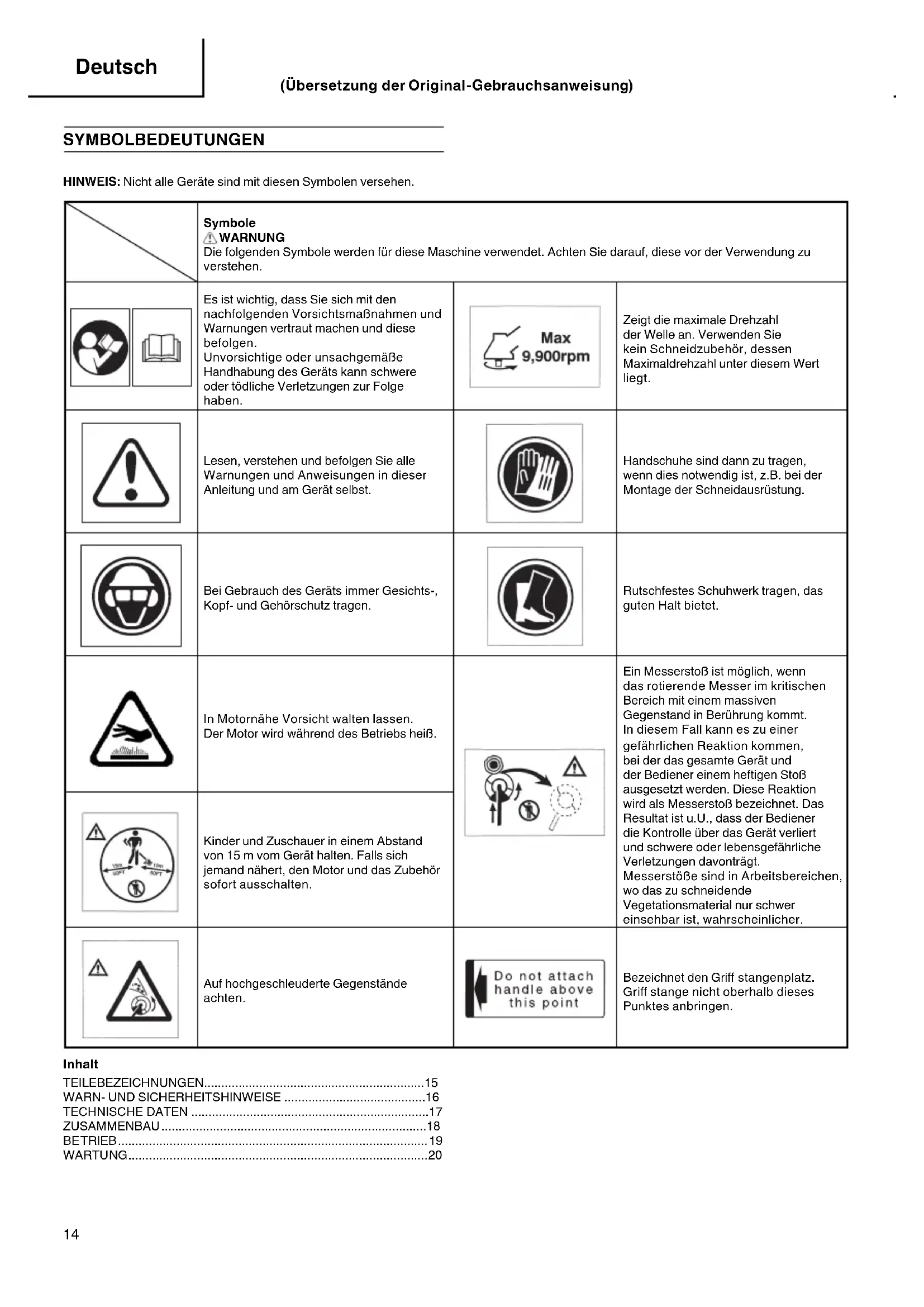 | Wartung | 2berpr5fen Sie regelm22ig das 1l, reinigen Sie den Luftfilter, sch2rfen Sie die Klingen |