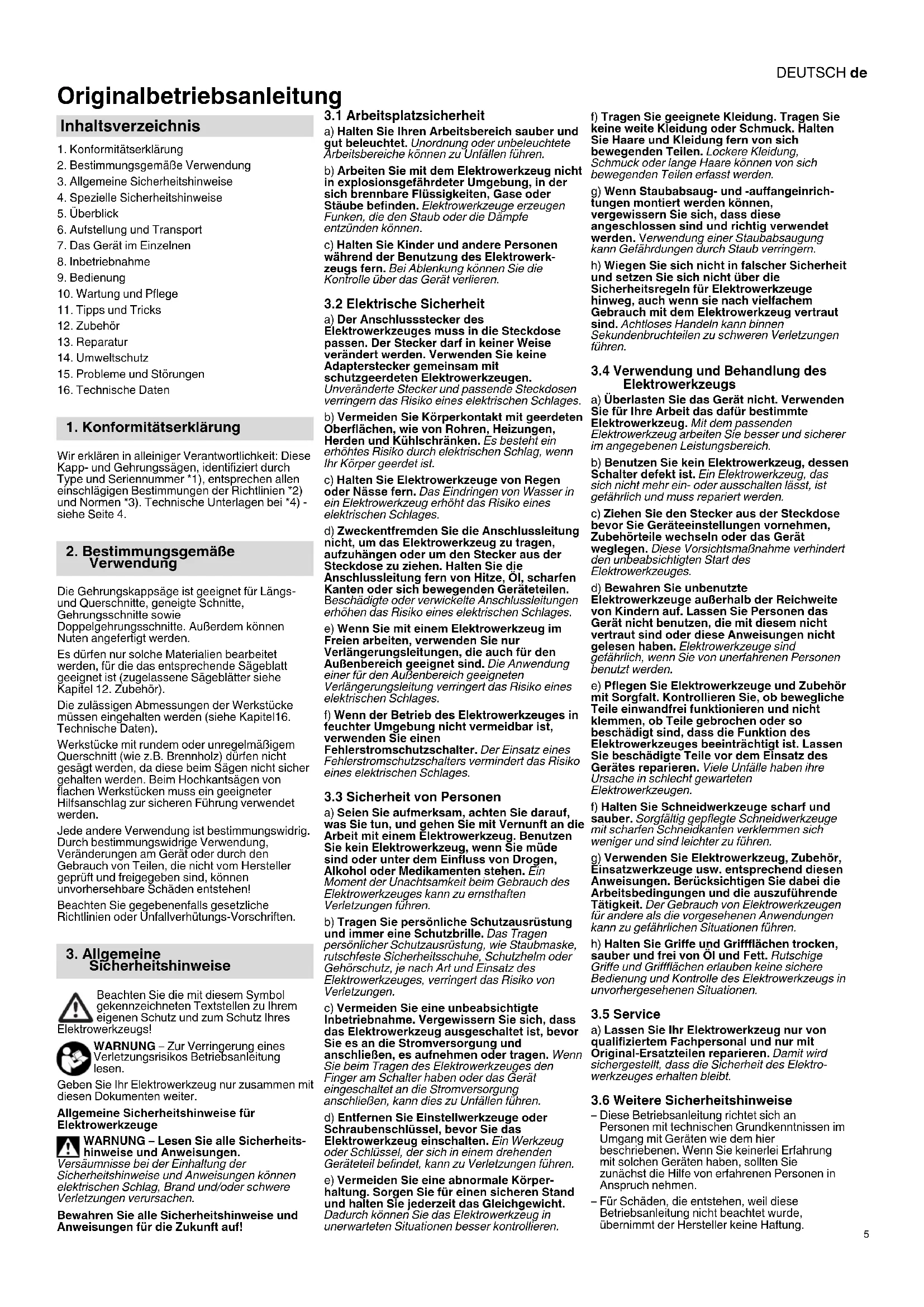 Wir erklären in alleiniger Verantwortlichkeit: Diese Kapp- und Gehrungssägen, identifiziert durch Type und Seriennummer *1), entsprechen allen einschlägigen Bestimmungen der Richtlinien *2) und Normen *3). Technische Unterlagen bei *4) - siehe Seite 4. Die Gehrungskappsäge ist geeignet für Längs- und Querschnitte, geneigte Schnitte, Gehrungsschnitte sowie Doppelgehrungsschnitte. Außerdem können Nuten angefertigt werden. Es dürfen nur solche Materialien bearbeitet werden, für die das entsprechende Sägeblatt geeignet ist (zugelassene Sägeblätter siehe Kapitel 12. Zubehör). Die zulässigen Abmessungen der Werkstücke müssen eingehalten werden (siehe Kapitel16. Technische Daten). Werkstücke mit rundem oder unregelmäßigem Querschnitt (wie z.B. Brennholz) dürfen nicht gesägt werden, da diese beim Sägen nicht sicher gehalten werden. Beim Hochkantsägen von flachen Werkstücken muss ein geeigneter Hilfsanschlag zur sicheren Führung verwendet werden. Jede andere Verwendung ist bestimmungswidrig. Durch bestimmungswidrige Verwendung, Veränderungen am Gerät oder durch den Gebrauch von Teilen, die nicht vom Hersteller geprüft und freigegeben sind, können unvorhersehbare Schäden entstehen! Beachten Sie gegebenenfalls gesetzliche Richtlinien oder Unfallverhütungs-Vorschriften. Beachten Sie die mit diesem Symbol gekennzeichneten Textstellen zu Ihrem eigenen Schutz und zum Schutz Ihres Elektrowerkzeugs! WARNUNG – Zur Verringerung eines Verletzungsrisikos Betriebsanleitung lesen. Geben Sie Ihr Elektrowerkzeug nur zusammen mit diesen Dokumenten weiter. Allgemeine Sicherheitshinweise für Elektrowerkzeuge WARNUNG – Lesen Sie alle Sicherheits- hinweise und Anweisungen. Versäumnisse bei der Einhaltung der Sicherheitshinweise und Anweisungen können elektrischen Schlag, Brand und/oder schwere Verletzungen verursachen. Bewahren Sie alle Sicherheitshinweise und Anweisungen für die Zukunft auf!