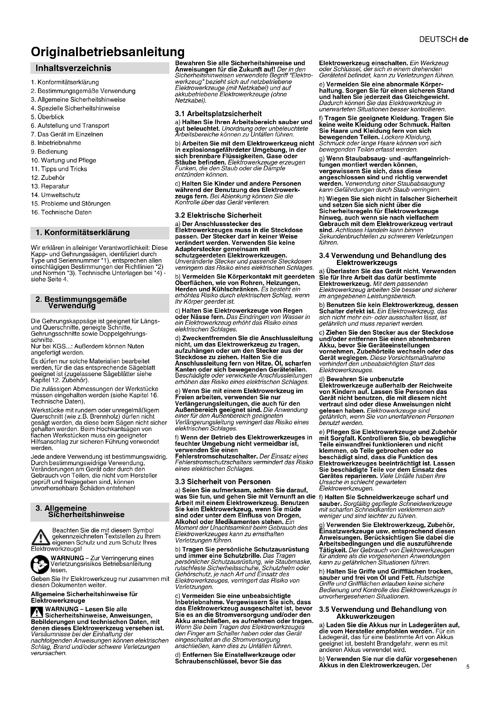 Wir erklären in alleiniger Verantwortlichkeit: Diese Kapp- und Gehrungssägen, identifiziert durch Type und Seriennummer *1), entsprechen allen einschlägigen Bestimmungen der Richtlinien *2) und Normen *3). Technische Unterlagen bei *4) - siehe Seite 4. Die Gehrungskappsäge ist geeignet für Längs- und Querschnitte, geneigte Schnitte, Gehrungsschnitte sowie Doppelgehrungs- schnitte. Nur bei KGS...: Außerdem können Nuten angefertigt werden. Es dürfen nur solche Materialien bearbeitet werden, für die das entsprechende Sägeblatt geeignet ist (zugelassene Sägeblätter siehe Kapitel 12. Zubehör). Die zulässigen Abmessungen der Werkstücke müssen eingehalten werden (siehe Kapitel 16. Technische Daten). Werkstücke mit rundem oder unregelmäßigem Querschnitt (wie z.B. Brennholz) dürfen nicht gesägt werden, da diese beim Sägen nicht sicher gehalten werden. Beim Hochkantsägen von flachen Werkstücken muss ein geeigneter Hilfsanschlag zur sicheren Führung verwendet werden. Jede andere Verwendung ist bestimmungswidrig. Durch bestimmungswidrige Verwendung, Veränderungen am Gerät oder durch den Gebrauch von Teilen, die nicht vom Hersteller geprüft und freigegeben sind, können unvorhersehbare Schäden entstehen! Beachten Sie die mit diesem Symbol gekennzeichneten Textstellen zu Ihrem eigenen Schutz und zum Schutz Ihres Elektrowerkzeugs! WARNUNG – Zur Verringerung eines Verletzungsrisikos Betriebsanleitung lesen. Geben Sie Ihr Elektrowerkzeug nur zusammen mit diesen Dokumenten weiter. Allgemeine Sicherheitshinweise für Elektrowerkzeuge WARNUNG – Lesen Sie alle Sicherheitshinweise, Anweisungen, Bebilderungen und technischen Daten, mit denen dieses Elektrowerkzeug versehen ist. Versäumnisse bei der Einhaltung der nachfolgenden Anweisungen können elektrischen Schlag, Brand und/oder schwere Verletzungen verursachen. Bewahren Sie alle Sicherheitshinweise und Anweisungen für die Zukunft auf! Der in den Sicherheitshinweisen verwendete Begriff "Elektro- werkzeug" bezieht sich auf netzbetriebene Elektrowerkzeuge (mit Netzkabel) und auf akkubetriebene Elektrowerkzeuge (ohne Netzkabel).