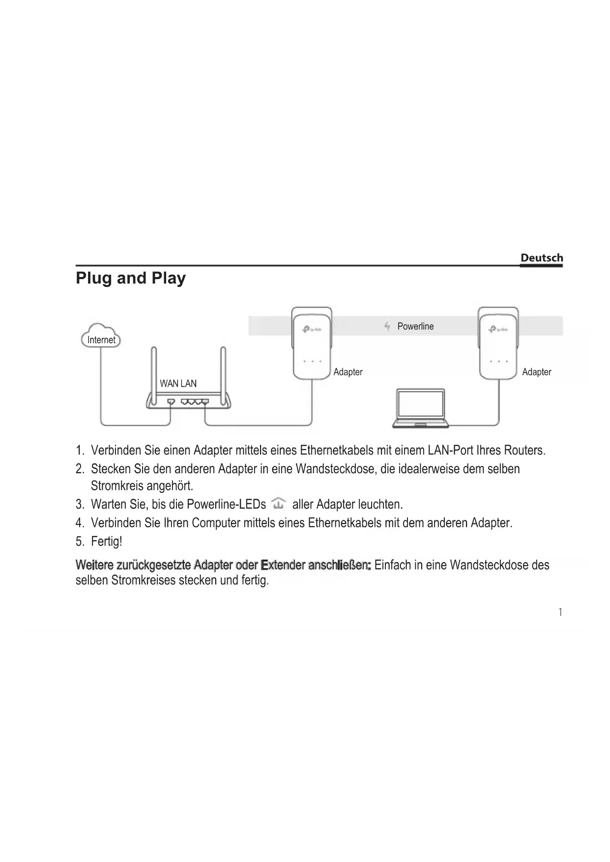 Weitere zurückgesetzte Adapter oder Extender anschließen: Einfach in eine Wandsteckdose des selben Stromkreises stecken und fertig. Internet WAN LAN Adapter Adapter PowerlineDeutsch