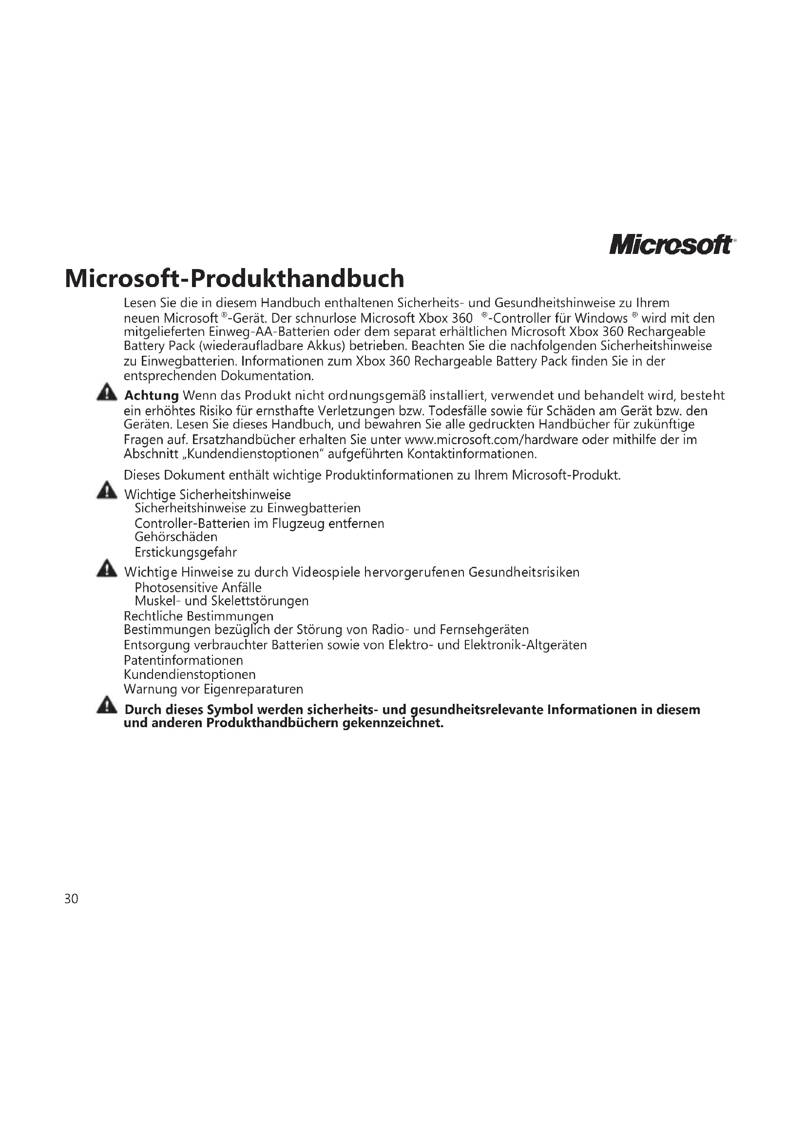 wird mit den mitgelieferten Einweg-AA-Batterien oder dem separat erhältlichen Microsoft Xbox 360 Rechargeable Battery Pack (wiederauadbare Akkus) betrieben. Beachten Sie die nachfolgenden Sicherheitshinweise zu Einwegbatterien. Informationen zum Xbox 360 Rechargeable Battery Pack nden Sie in der entsprechenden Dokumentation. Achtung Wenn das Produkt nicht ordnungsgemäß installiert, verwendet und behandelt wird, besteht ein erhöhtes Risiko für ernsthafte Verletzungen bzw. Todesfälle sowie für Schäden am Gerät bzw. den Geräten. Lesen Sie dieses Handbuch, und bewahren Sie alle gedruckten Handbücher für zukünftige Fragen auf. Ersatzhandbücher erhalten Sie unter www.microsoft.com/hardware oder mithilfe der im Abschnitt „Kundendienstoptionen“ aufgeführten Kontaktinformationen. Dieses Dokument enthält wichtige Produktinformationen zu Ihrem Microsoft-Produkt. Wichtige Sicherheitshinweise Sicherheitshinweise zu Einwegbatterien Controller-Batterien im Flugzeug entfernen Gehörschäden Erstickungsgefahr Wichtige Hinweise zu durch Videospiele hervorgerufenen Gesundheitsrisiken Photosensitive Anfälle Muskel- und Skelettstörungen Rechtliche Bestimmungen Bestimmungen bezüglich der Störung von Radio- und Fernsehgeräten Entsorgung verbrauchter Batterien sowie von Elektro- und Elektronik-Altgeräten Patentinformationen Kundendienstoptionen Warnung vor Eigenreparaturen Durch dieses Symbol werden sicherheits- und gesundheitsrelevante Informationen in diesem und anderen Produkthandbüchern gekennzeichnet.